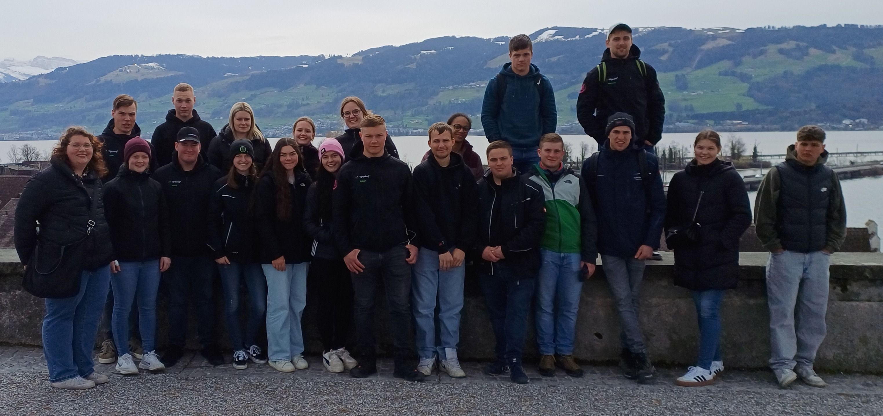 3. Tag: Am 3. Tag, Freitag, den 21.03.2025, und auch unser letzter Tag unserer Abschlussfahrt in der Schweiz besuchten wir einen modernen Milchviehbetrieb und hatten eine Stadtführung in Rapperswil. Um 7.45 Uhr starteten wir an der Jugendherberge und fuhren zu dem Milchviehbetrieb von Thomas & Heidi Eberhard. Sie bewirtschaften einen sehr modernen Milchviehbetrieb mit 50 melkenden Kühen und modernster Robotertechnik von Lely. Thomas führte uns über den gesamten Betrieb und erzählte auch etwas über die Region. In der Region gibt es sehr viele Grünlandflächen. Das Gebiet ist durch einen sehr hohen Niederschlag von 1600 - 1800 mm geprägt. Auf dem Betrieb findet keine Aufzucht der Jungrinder und auch kein Ackerbau statt. Durch die Grünlandstruktur muss der Betrieb sämtliche Futtermittel wie Mais, Getreide oder auch Luzerne zukaufen. Auf den eigenen Ackerflächen des Betriebes wird Ackergras angebaut, welches sich in sehr hohen Proteingehalten von 20 % widerspiegelt und somit auch eine Herdenleistung von 10.500 kg Milch/Kuh und Jahr möglich ist. Ein weiteres Standbein des Betriebes ist die Hähnchenmast. Im Maststall ist Platz für 17.400 Hähnchen. Die Tiere dürfen ab einer Außentemperatur von mindestens +10 Grad ins Freiland. Als nächstes machten wir uns auf den Weg nach Rapperswil, wo wir eine Stadtführung bekamen. Zuerst zeigte der Reiseführer uns eine sehr alte Sonnenuhr. Diese befand sich auch auf dem Glockenturm der Burg. Das besondere an der Burg war, dass sie nicht viereckig war wie üblich, sondern dreieckig. Auch wir pilgerten durch die Stadt, wo die Jakobsmuscheln, alle Richtung Spanien ausgerichtet, den Weg weisen. Während der Führung, liefen wir auch an sehr vielen Brunnen vorbei, jeder hat seine eigene Geschichte. Alle Häuser, an denen wir vorbeiliefen, waren mit Fensterläden aus Holz ausgestattet. Rapperswil ist eine sehr schöne, alte Stadt mit einer interessanten Geschichte direkt am Zürichsee.