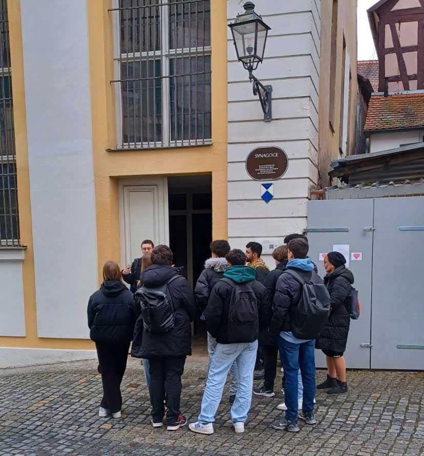 Nachdem Antisemitismus derzeit wieder im Gespräch ist, halten wir eine Aufklärung unserer Schülerinnen und Schüler über das Judentum für sehr wichtig. Am 10.02.2025 unternahm die Klasse BIKd zusammen mit den Lehrkräften, Inge Bühler-Saal und Claudia Geißler-Kraft, einen Unterrichtsgang zur Synagoge in Ansbach. Herr Dietzinger, Stadtführer der Stadt Ansbach, erwartete uns an der Synagoge, die 1744 erbaut wurde. Sie fügt sich ziemlich unauffällig in die Häuserreihe ein. In der Reichskristallnacht wurde die Synagoge nicht abgebrannt, weil man die Häuser der Innenstadt nicht gefährden wollte. Sie wird nicht mehr als Kirche benutzt, sondern dient seit 1964 musealen Zwecken.