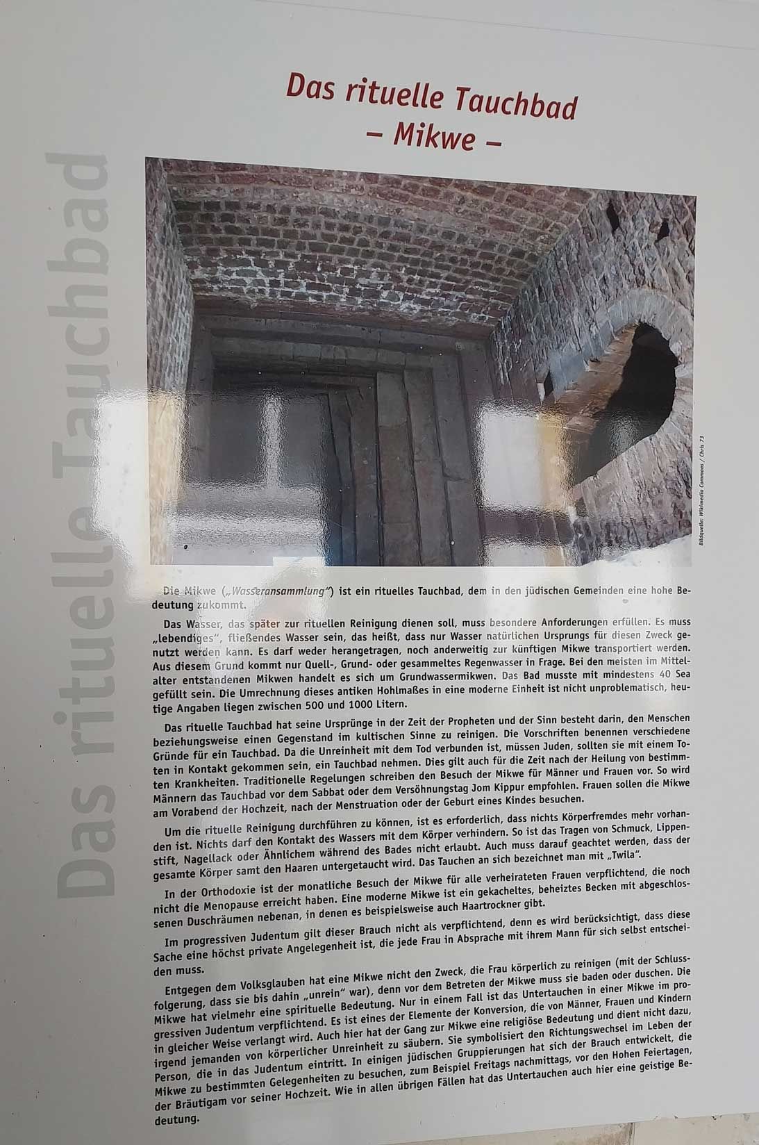Herr Dietzinger erklärte uns viele interessante Details im Innenraum: in der Mitte des Raum befindet sich ein achteckiges Podium (Bima), von dem aus während des Gottesdienstes aus den Büchern Mose vorgelesen wurde. Herr Dietzinger stellte viele Parallelen zwischen dem Judentum und dem Islam her. Z. B. nahmen die Frauen an den Gottesdiensten - getrennt von den Männern - auf der Empore teil, sie nahmen auch einen anderen Eingang als die Männer. Besonders interessant fanden die Schülerinnen und Schüler, dass die Bücher in hebräisch geschrieben wurden: von rechts nach links ohne Leerzeichen. Im Judentum gibt es ein Ritualbad (Mike) mit Tauchbad, wo die rituellen Waschungen vorgenommen wurden. Das Bad wurde mit fließendem Wasser aus dem Stadtbach gefüllt und befindet sich im Innenhof der Synagoge.