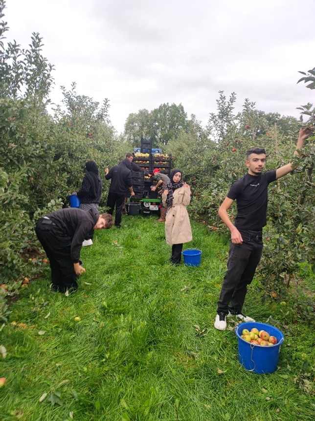 Am Donnerstag, den 9.Oktober 2025 sind die Klassen BIK Vb und BIK Vc mit Frau Kößer, Frau Schreiber, Frau Michel und Frau Ruff mit dem Zug nach Triesdorf gefahren. Die Schülerinnen und Schüler sind zum Apfelgarten gelaufen und wurden dort von Herrn Walter, dem Triesdorfer Gärtner, begrüßt. Nach einer Führung durch die Mosterei ging es dann gleich mit dem Pflücken von Äpfeln los. Jeder bekam einen Eimer für die Äpfel. Die Schülerinnen und Schüler waren sehr fleißig und haben 1500kg Äpfel gepflückt.