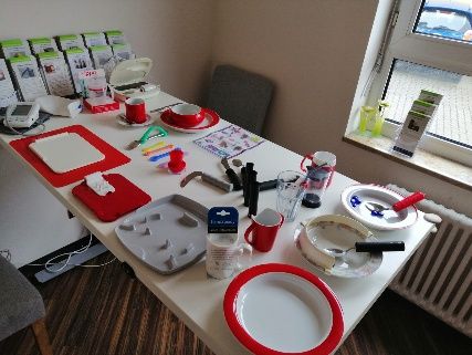 Die Küchenzeile hat unterschiedliche Arbeits-höhen, so dass auch Rollstuhlfahrer daran gut arbeiten können. Ein absenkbarer Herd und viele Hilfsmittel für die Küchenarbeit und zum Essen und Trinken konnten wir erkunden und ausprobieren. Darunter spezielle Flaschenöff-ner, Mess- und Einfüllhilfen für Menschen mit Sehbeeinträchtigung, Medikamentendispen-ser und Tablettenzerteiler, um nur einige Beispiele zu nennen.