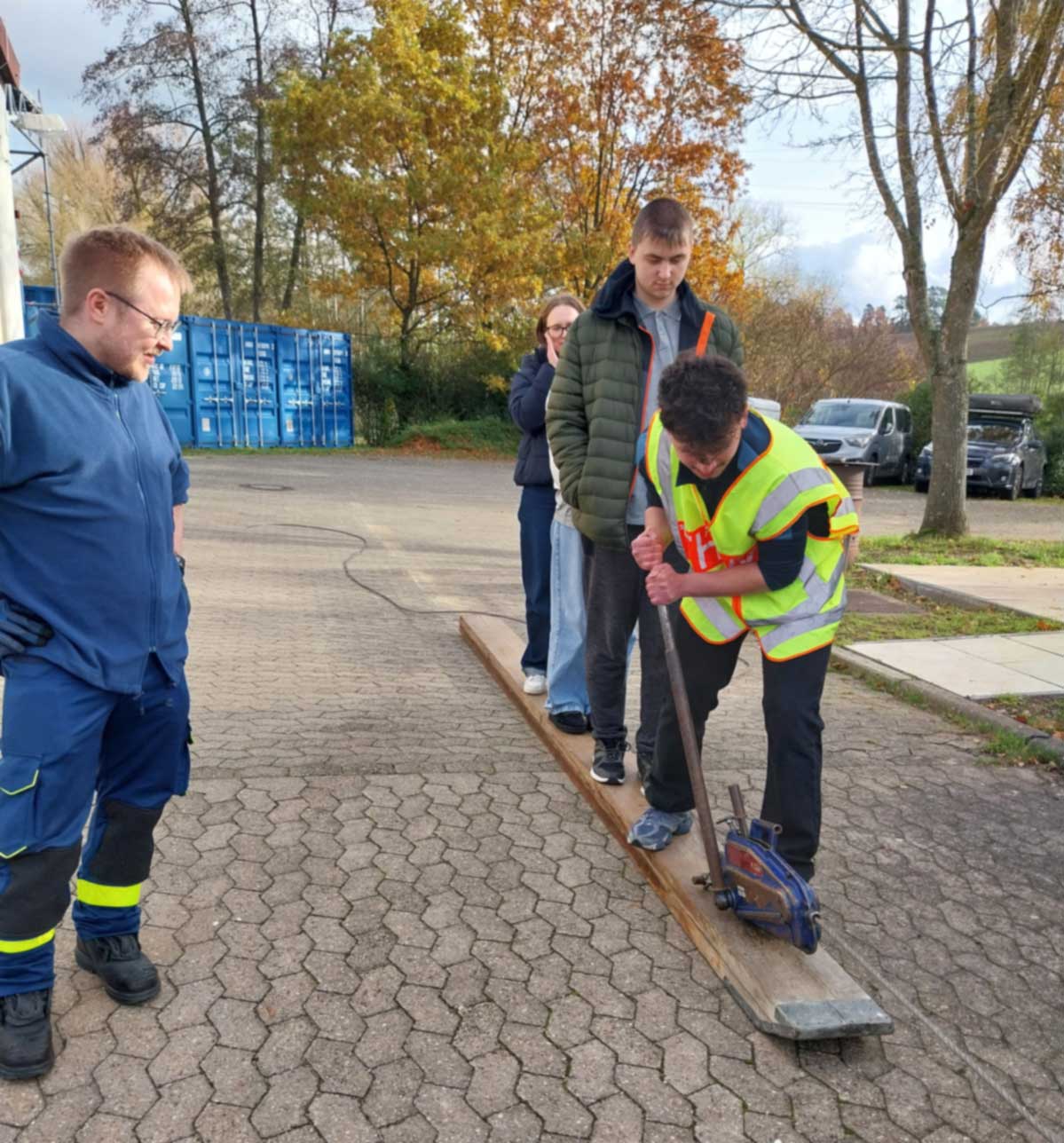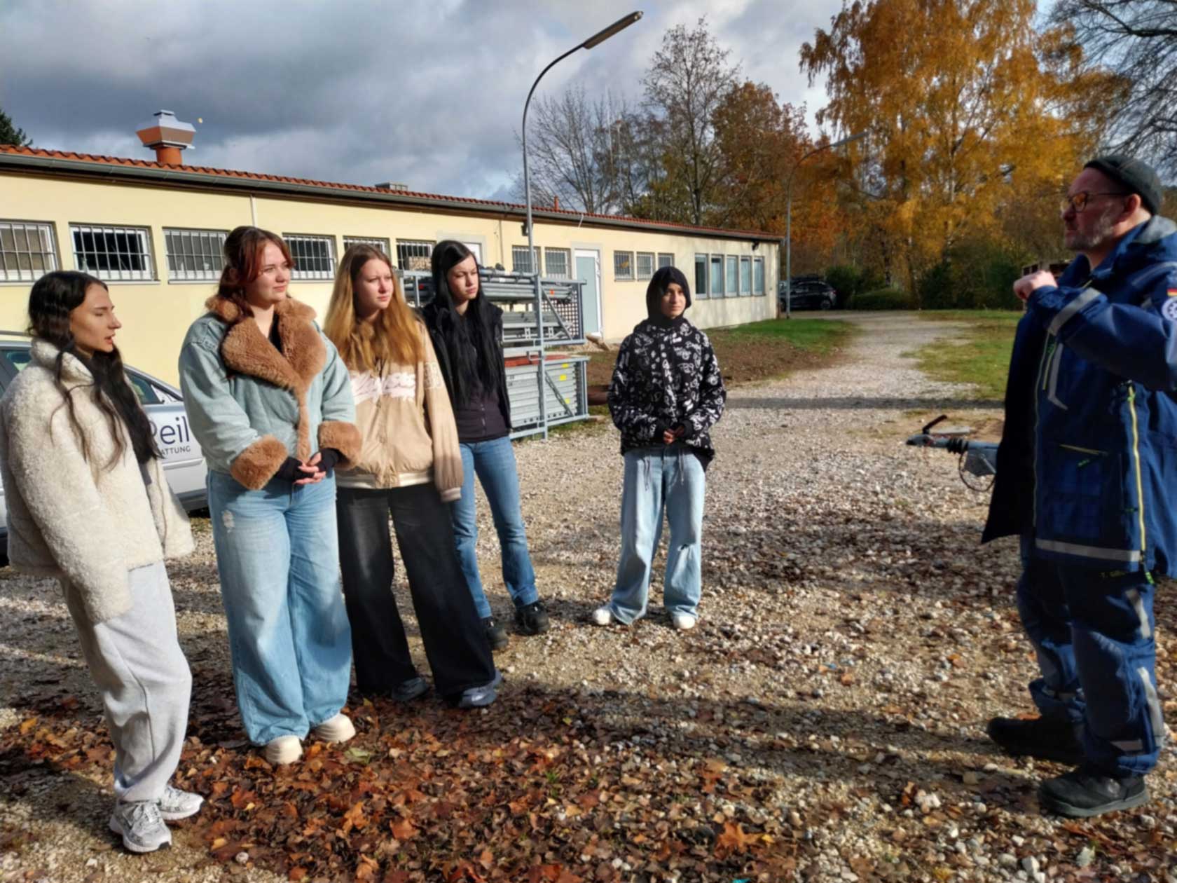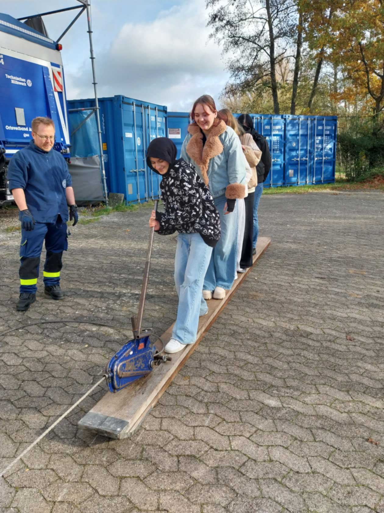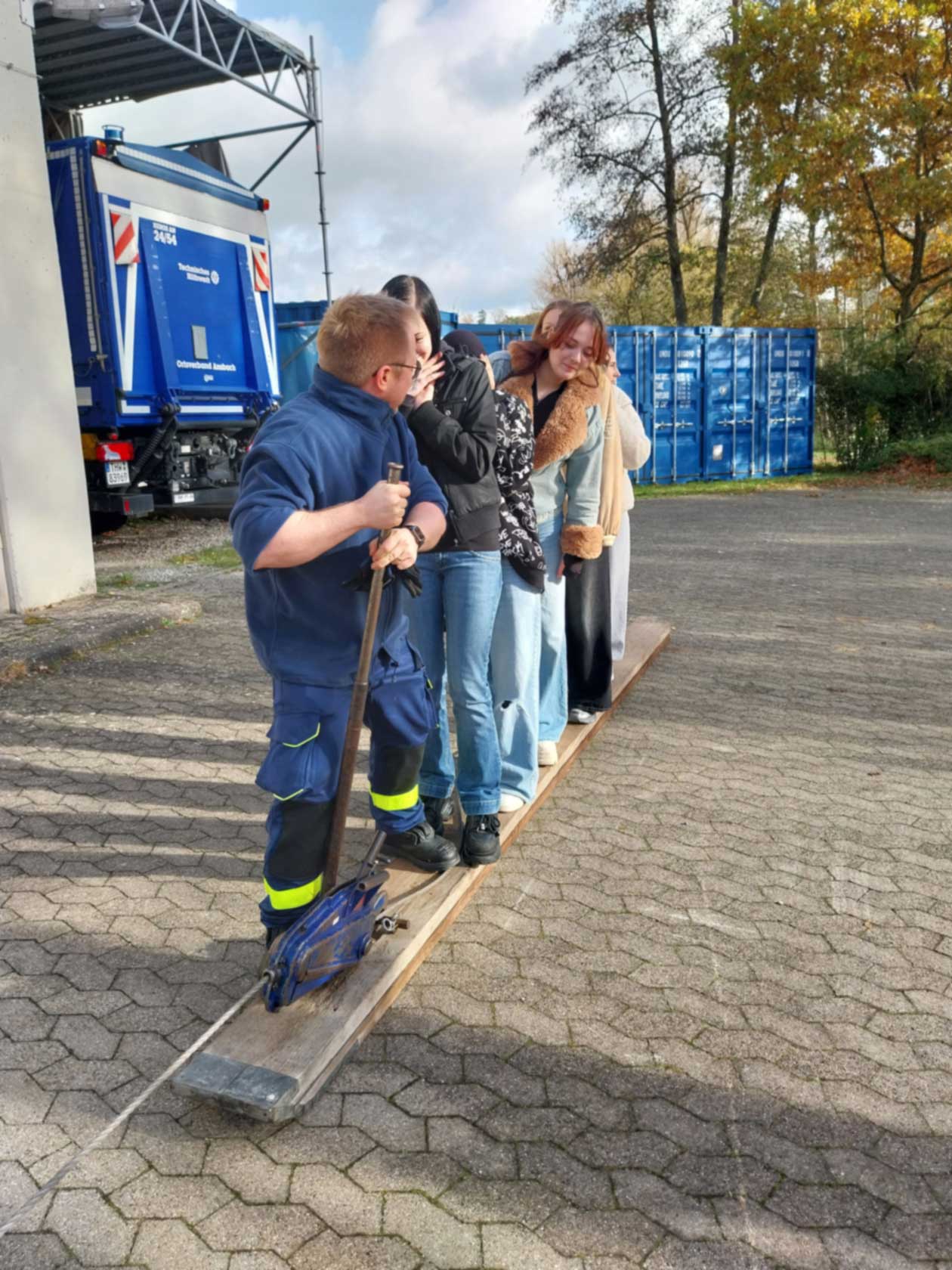 Im Rahmen unseres Projekts zum Ehrenamt unternahmen die Klassen BIKa und BIKc einen Unterrichtsgang zum Technischen Hilfswerk (THW) in Ansbach. Am 28. Oktober 2025 (BIKa) bzw. am 11. November 2025 (BIKc) gingen die Klassen gemeinsam mit ihren Lehrkräften, Inge Bühler-Saal und Claudia Geißler-Kraft, von der Schule aus zu Fuß nach Eyb zum THW. Dort erwarteten uns bereits drei ehrenamtliche Helfer des THW: Jugendbetreuer Tobias Wißmüller, Fachberater Georg Schuster und Verwaltungshelfer Tom Groß. Tobias Wißmüller hatte sich extra Urlaub genommen, um uns betreuen zu können. Nach einem kurzen Einführungsfilm teilte Tobias Wißmüller die Klassen jeweils in 3 Gruppen ein.