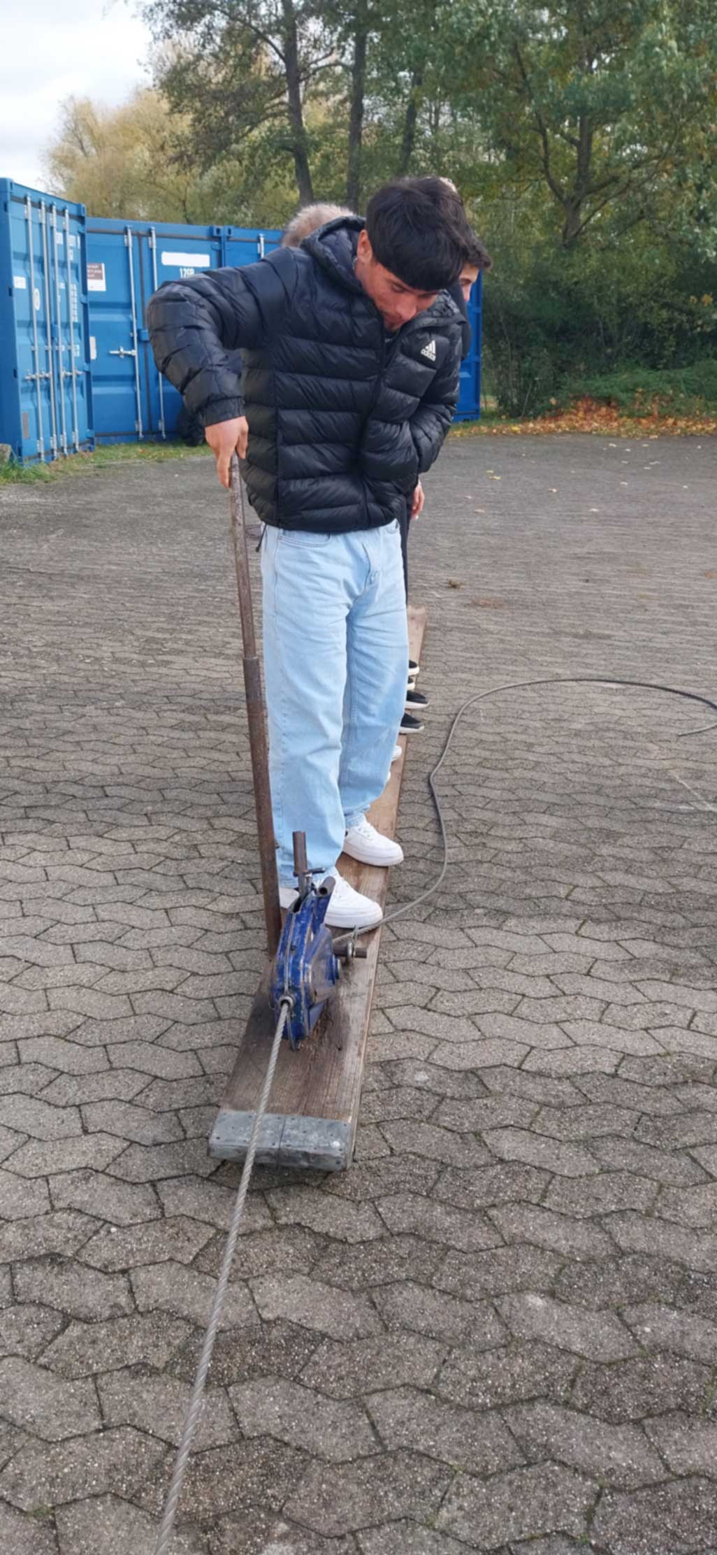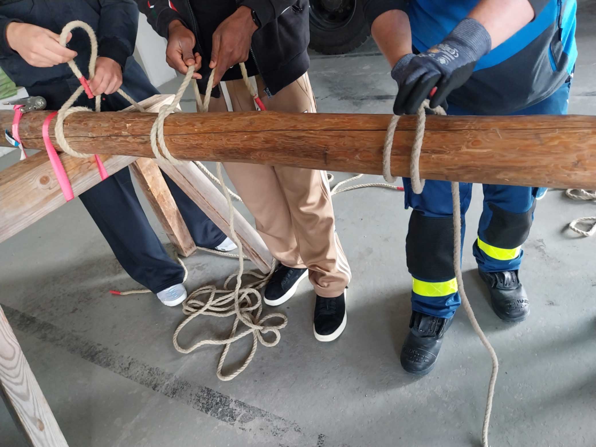 Die 1. Station übernahm Herr Schuster. Der Ortsverband Ansbach wurde 1953 gegründet und hat aktuell 110 ehrenamtliche Helferinnen und Helfer. Er erklärte uns, dass das Emblem mit dem orangefarbenen Dreieck am Ärmel Zivilschutz im Verteidigungsfall bedeute. Auf Anordnung der Regierung werden bereits Maßnahmen für den Kriegsfall getroffen. Die Aufgabenstruktur der Helferinnen und Helfer ist vielfältig: es gibt Ortsbeauftragte, Ausbildungsbeauftragte, Verwaltungshelfer, Koch und Küchenhelfer, Schirrmeister (zuständig für Geräte, Fahrzeuge und Geschirr), Jugendbetreuer, den Beauftragten für Öffentlichkeitsarbeit und Fachberater. In Ansbach stehen folgende Einheit zur Verfügung: der Zugtrupp, die Bergungstruppe, die Fachgruppe Notversorgung, die Fachgruppe Räumen und die Grundausbildungsgruppe. Die 2. Station übernahm Herr Wißmüller. Er zeigte unsden18 Tonnen schweren Gerätewagen und erklärte uns den Einsatz des Spreizers, die hydraulische Rettungsschere und das Hebekissen, das – mit Luft gefüllt – 40 Tonnen anheben kann. Unsere Schüler interessierten sich sehr für die mobile Werkbank, das Notstromaggregat und die Atemschutzgeräte. Das praktische Ausprobieren des Zugschlittens am Hof machte allen sehr viel Spaß – auch wenn es anstrengend war. Das Knotenmachen sah einfacher aus, als es tatsächlich war. An der 3. Station zeigte uns Herr Groß, wie z. B. Notmatten auf die Wiese gelegt werden, damit die Fahrzeuge nicht einsinken, beim Baumbiegesimulator erklärte er uns, wie die Helferinnen und Helfer üben, mit einem umgestürzten Baum gefahrlos umzugehen. Er zeigte uns das Übungsgelände, auf dem verschiedene Szenarien trainiert werden können, z. B. die Rettung von verunfallten Menschen aus einem Schacht oder einem Tunnel oder die Höhenrettung. Das THW wird um Unterstützung gerufen, z. B. bei Unfällen auf der Autobahn, beim Aufräumen von Unfallstellen und von Bränden. Die Ansbacher Ortsgruppe unterstützte z. B. beim Brand in Schmalenbach und beim Brand des Autohauses Poschner. Wir bedanken uns sehr herzlich bei Herrn Wißmüller, Herrn Schuster und Herrn Groß für die sehr interessanten Einblicke in die Arbeit des THW.