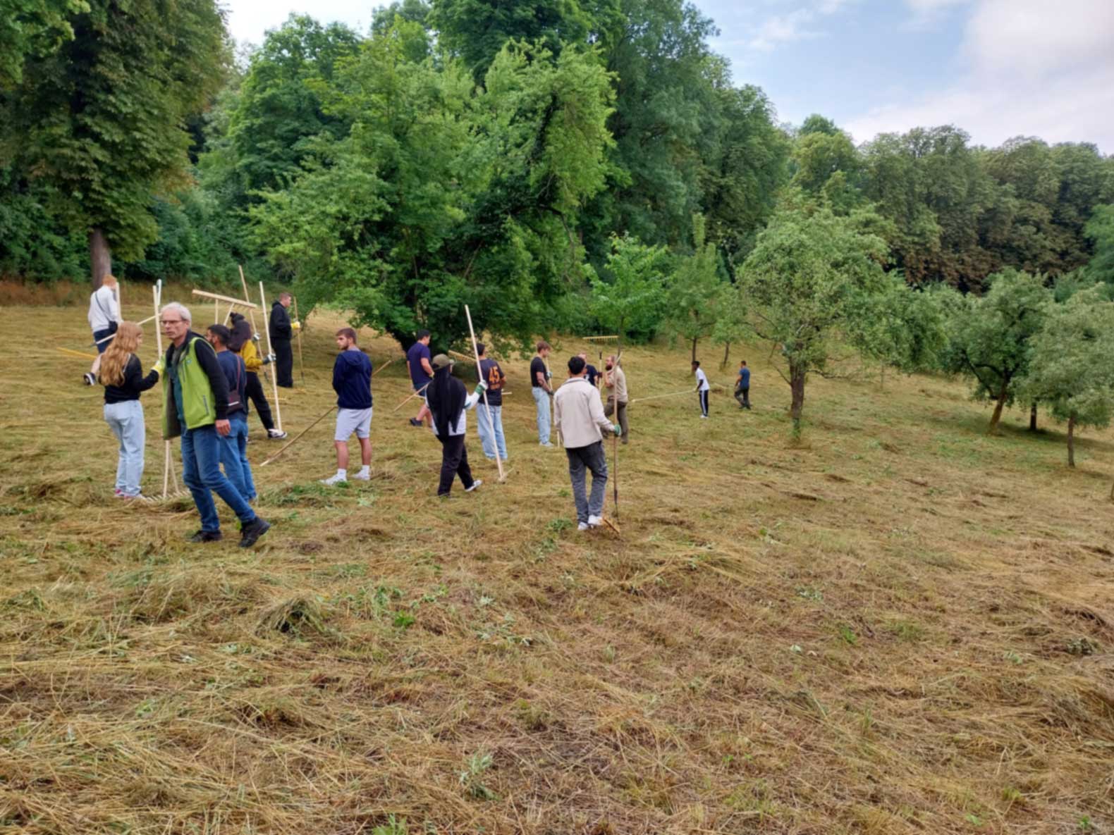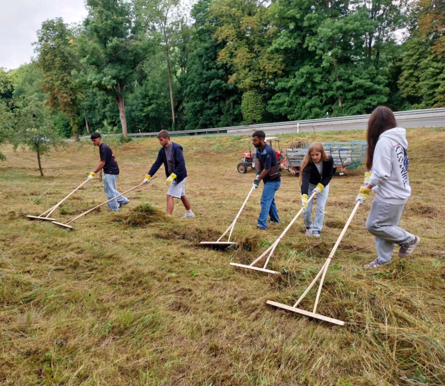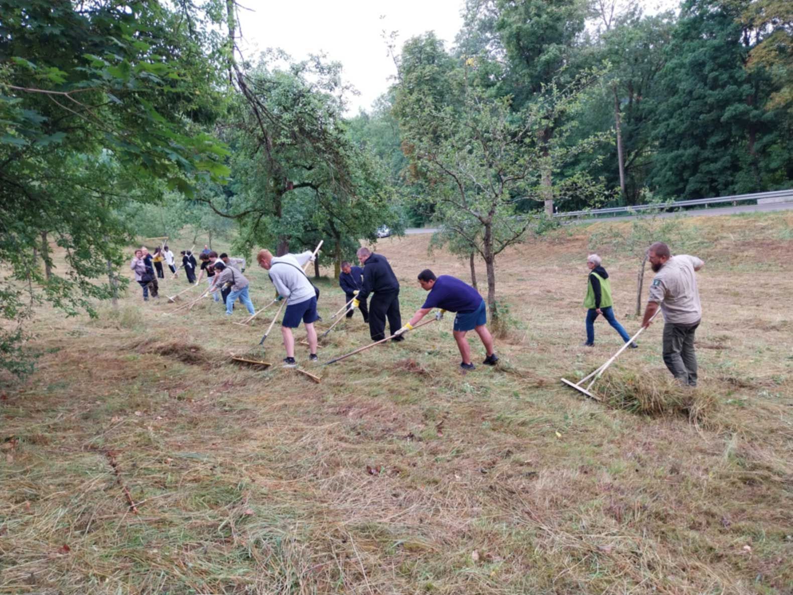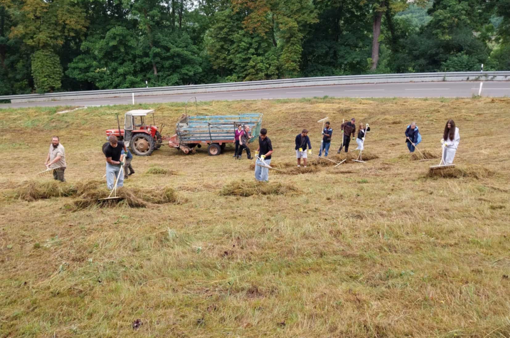 Am Tag vor unserem Einsatz war das hohe Gras gemäht worden. In anstrengender Handarbeit rechten wir mit dem Handrechen das Schnittgut den Hang hinunter. Dafür mussten alle mehrere Male den steilen Hang nach oben laufen. Während der Arbeit entdeckten die Schülerinnen und Schüler eine Blindschleiche, eine Ringelnatter, eine kleine Maus, Heuschrecken, Schmetterlinge, eine Wespenspinne und viele andere Tiere. Auf diese Weise erkannten sie den ökologischen Wert der Streuobstwiese als wichtigen Lebensraum. Karin Bierstedt und Andreas Bauer (Freie Rothenburger Vereinigung) und Benjamin Krauthahn und sein Team unterstützten uns kräftig bei der Arbeit. Das zusammengerechte Schnittgut wurde von freiwilligen Rothenburger Helfern mit einem Traktor und Ladewagen eingesammelt. Für die Pause hatte Katrin Weiss mit ihrer Klasse belegte Semmeln und Kuchen vorbereitet, die dankbar verzehrt wurden.