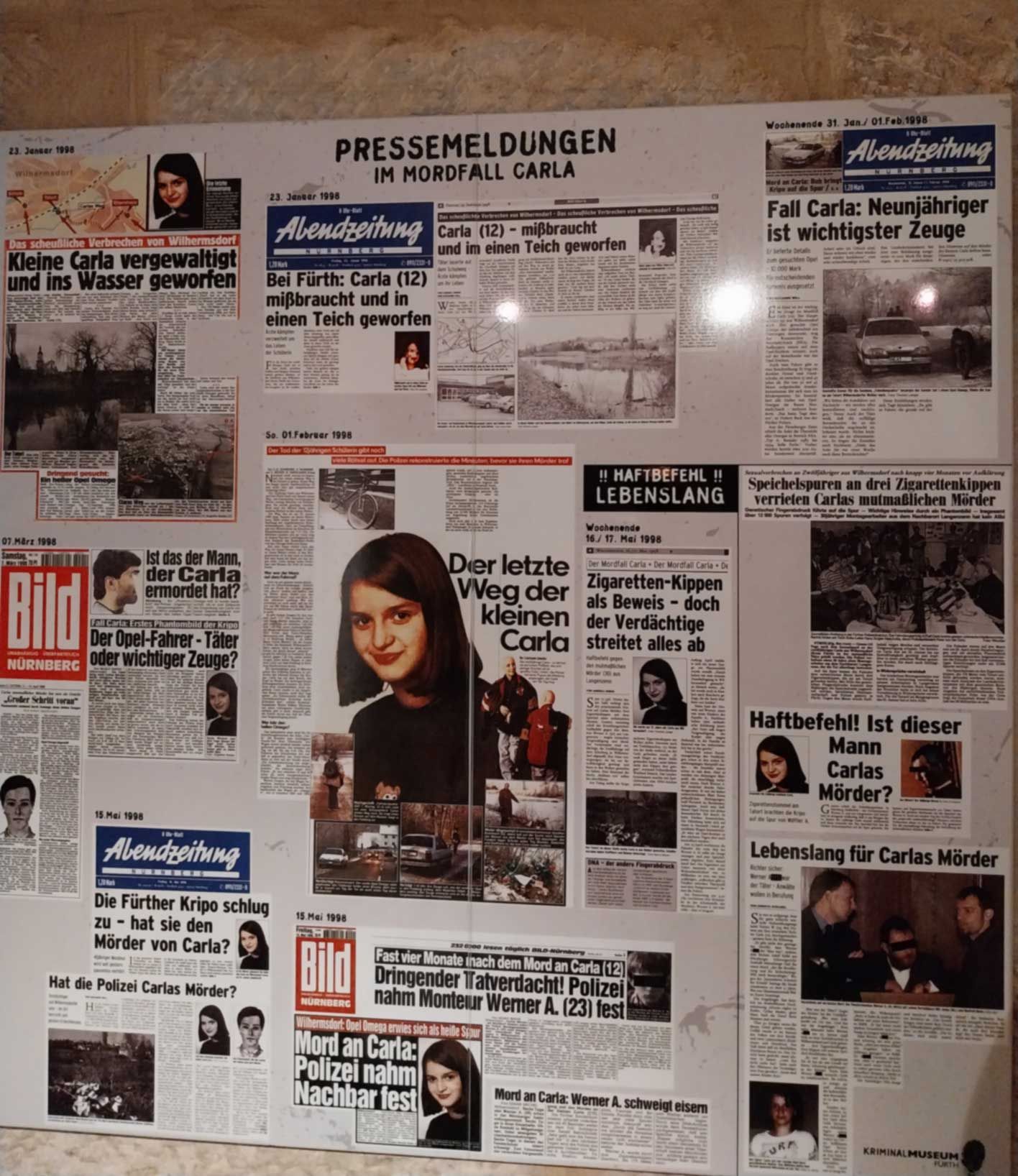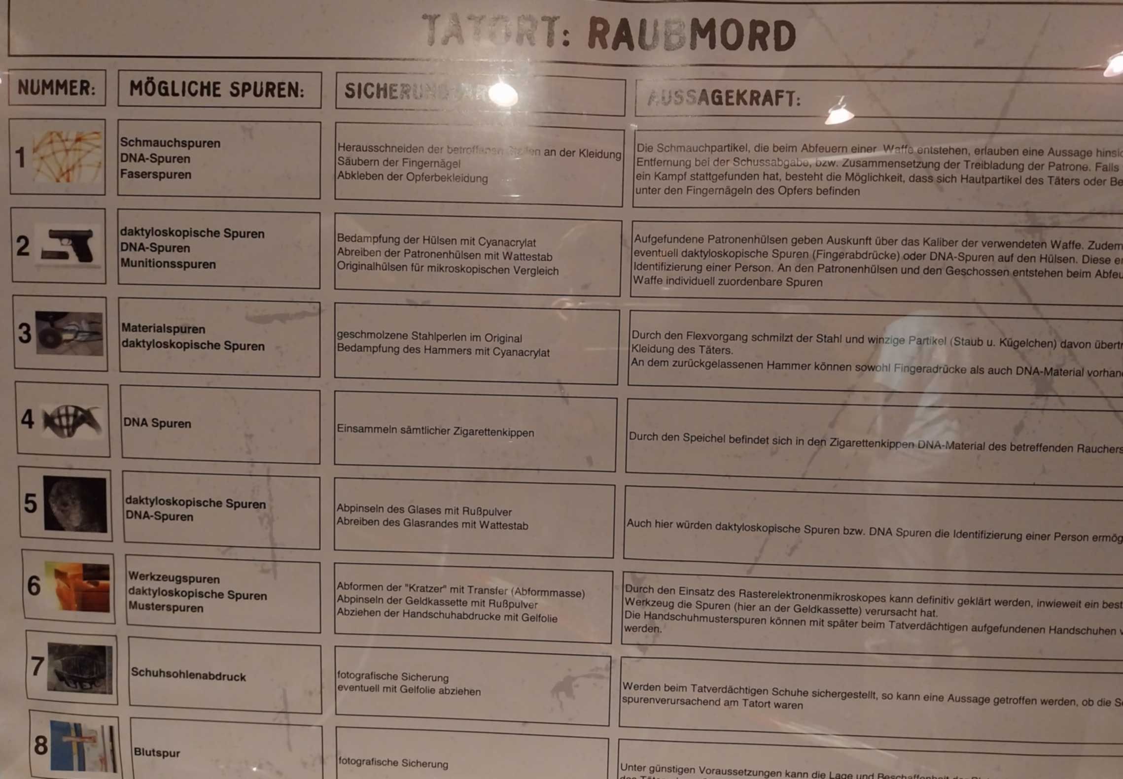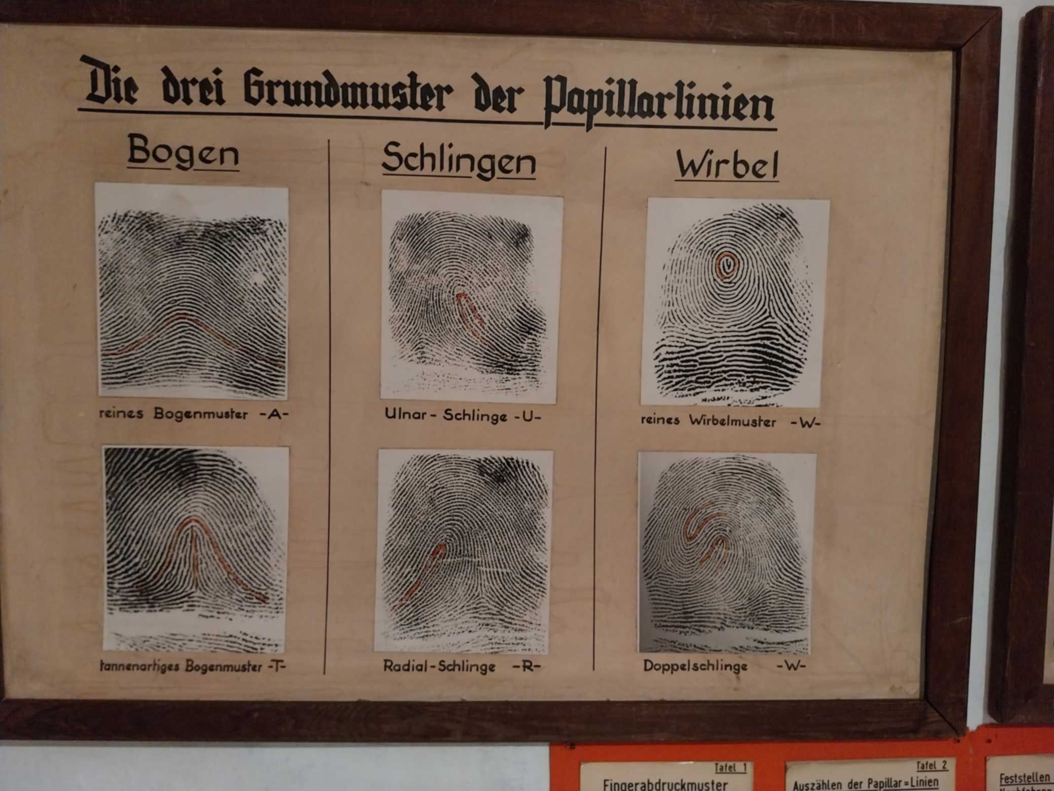 Die Räume mit dem Falschgeld und den Waffen sowie das „Drogenlabor“ faszinierten die Klasse. Interessiert betrachteten die Schülerinnen und Schüler die historischen Geräte (das Telefon mit Wählscheibe, Schreibmaschine, usw.), die früher bei der Polizeiarbeit benutzt wurden. Die Kenntnis, dass jeder Mensch (auch Zwillinge) unverwechselbare Fingerabdrücke besitzt und die späteren Möglichkeiten der DNA-Analyse waren große Fortschritte bei der Aufklärung von Straftaten.