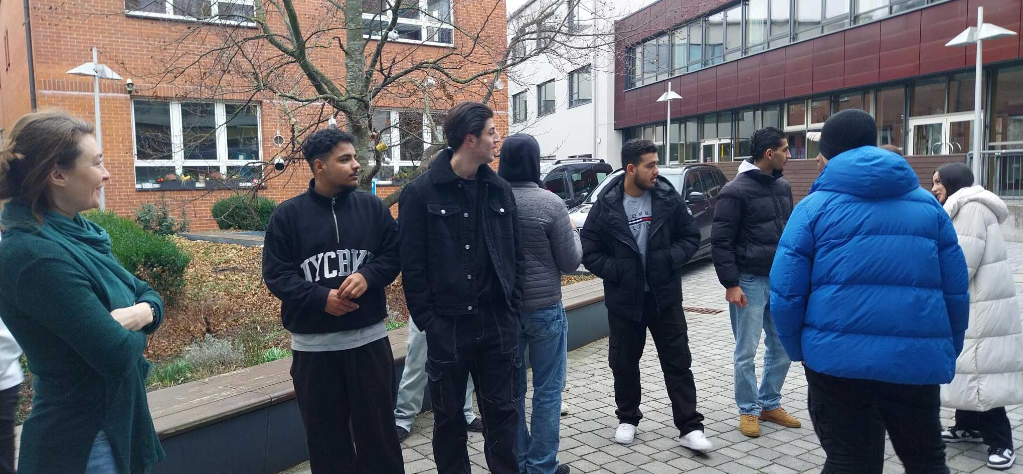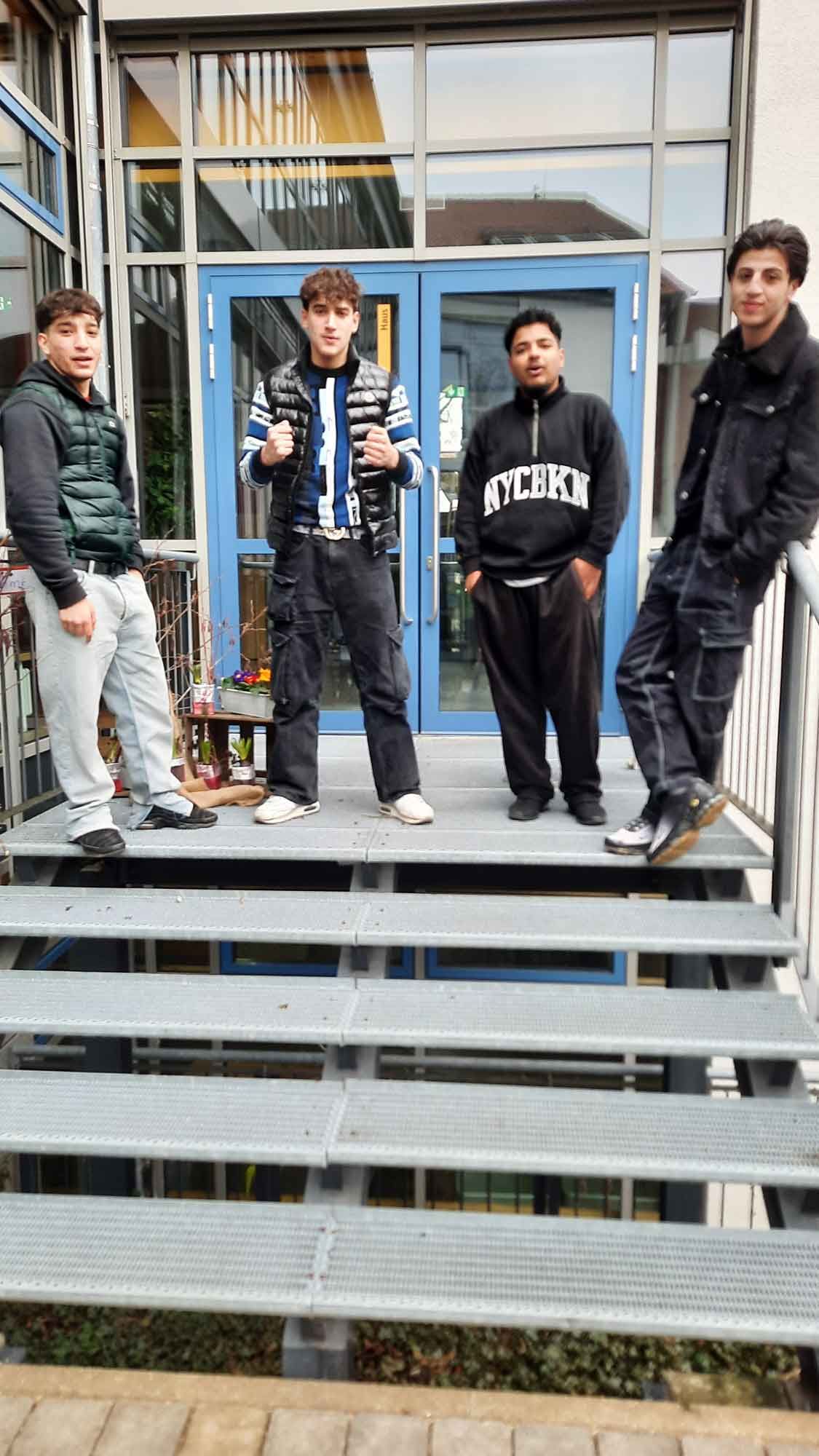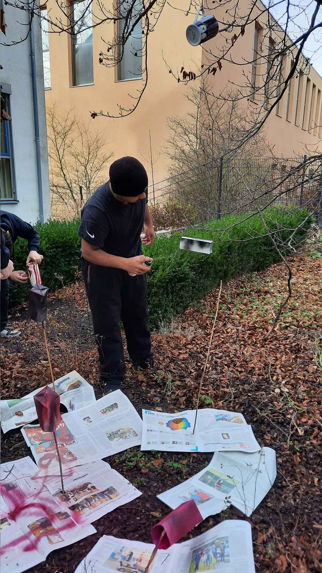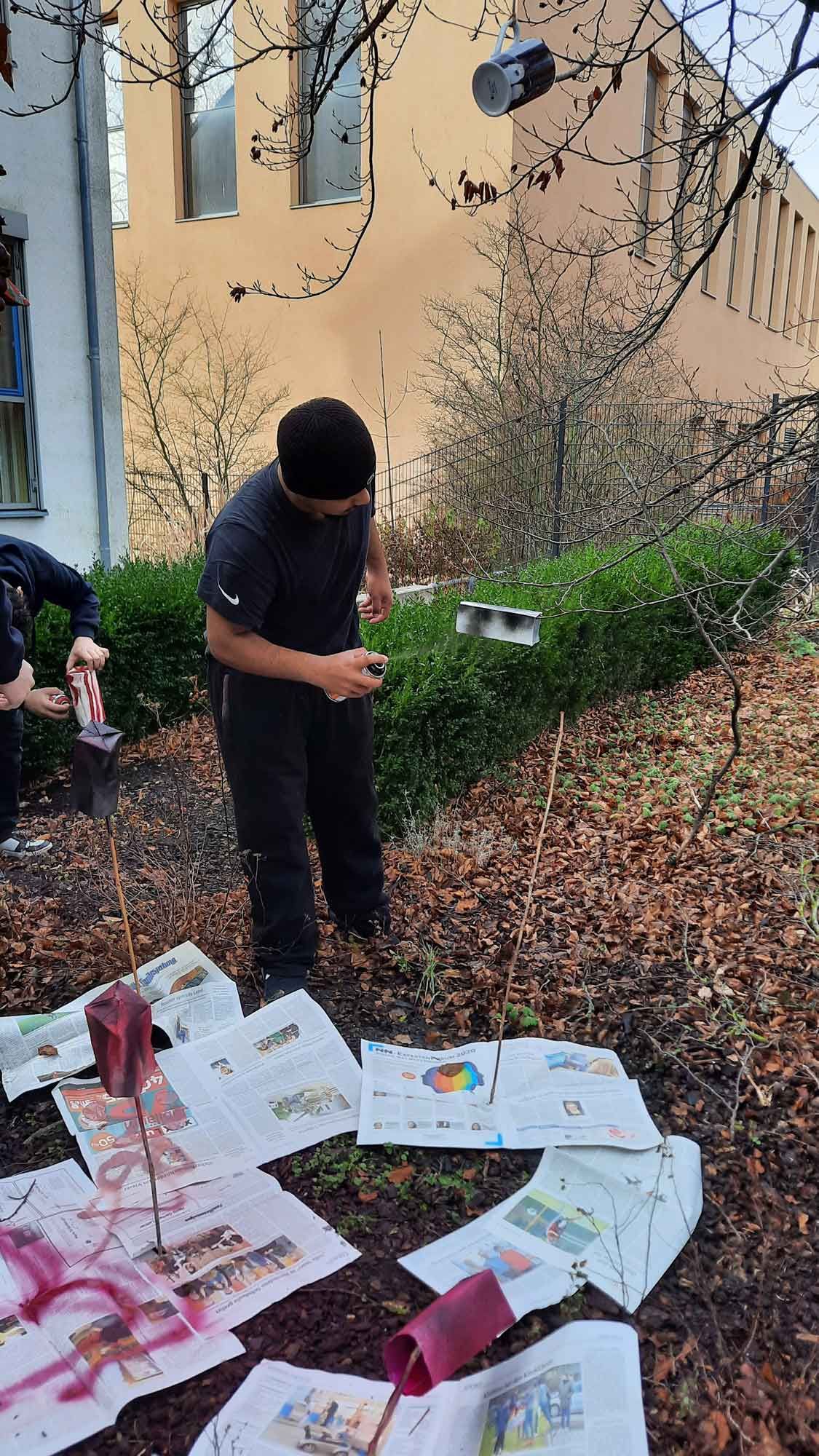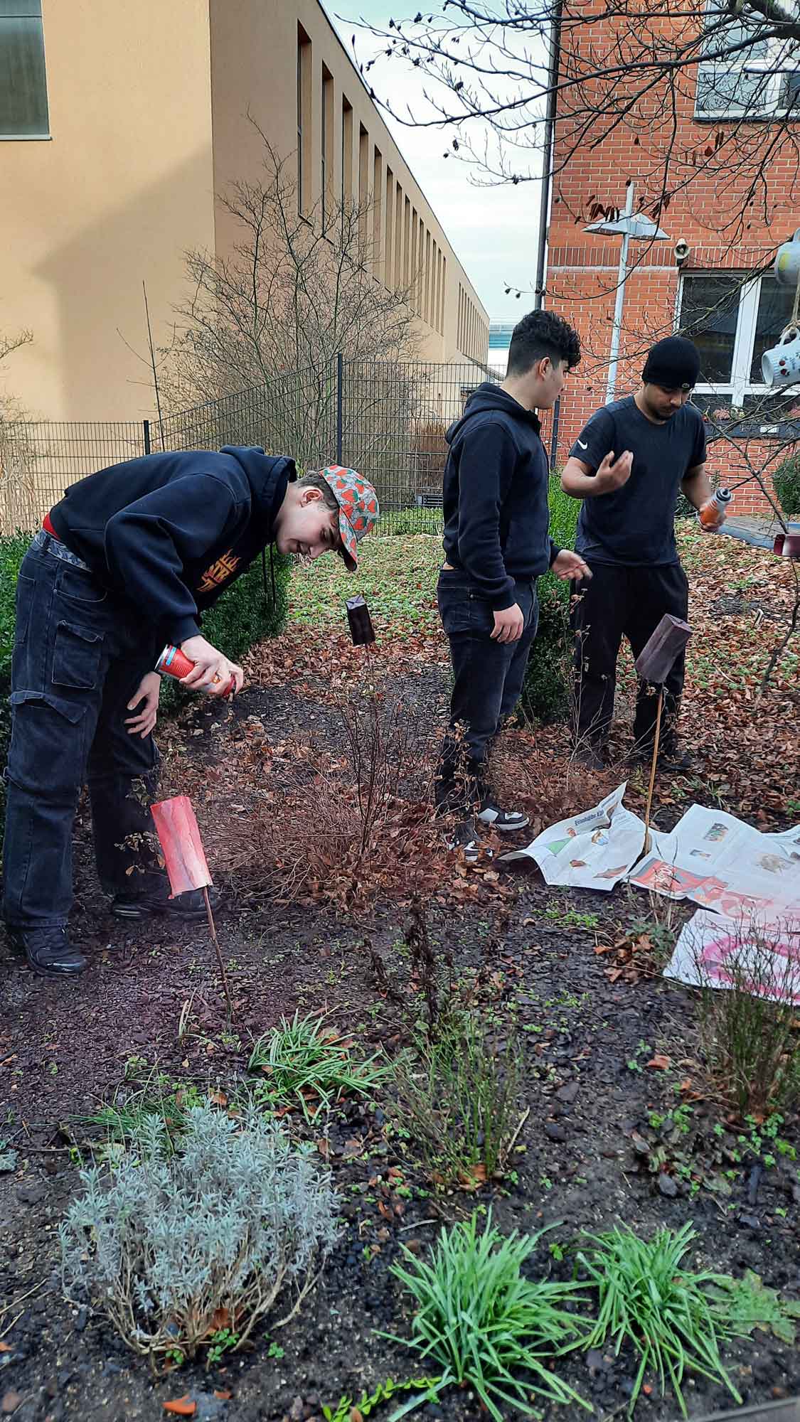 Nachdem alles fertig gestaltet war, kamen beide Klassen im Innenhof der Schule zusammen, um ihr gemeinsames Werk zu betrachten und vorzustellen. Der Klassensprecher der Klasse BVJ b, Isa Khatuev, stellte die Arbeit der beiden Klassen vor. Dazu gab es für alle frisch im Unterricht gebackene Muffins.