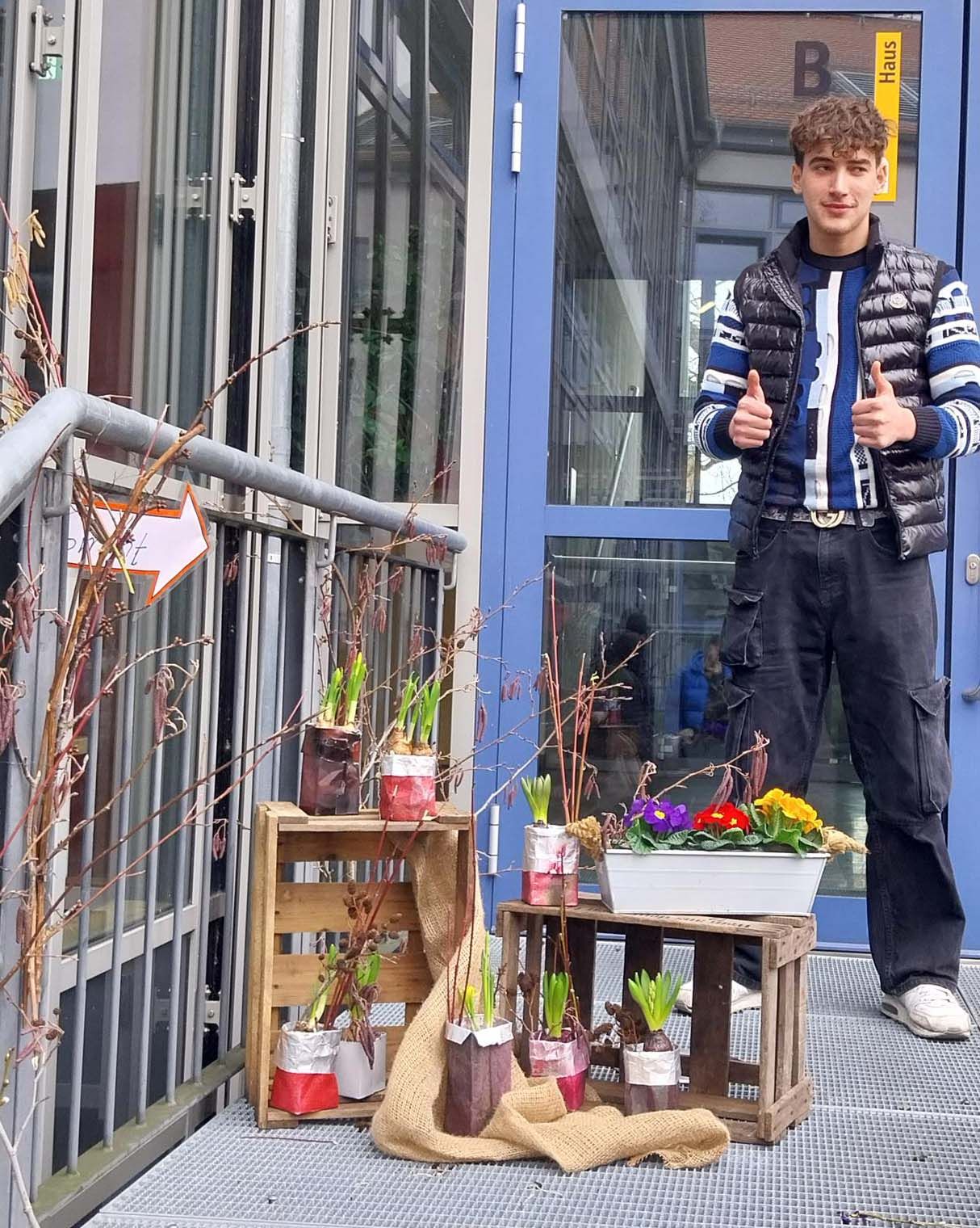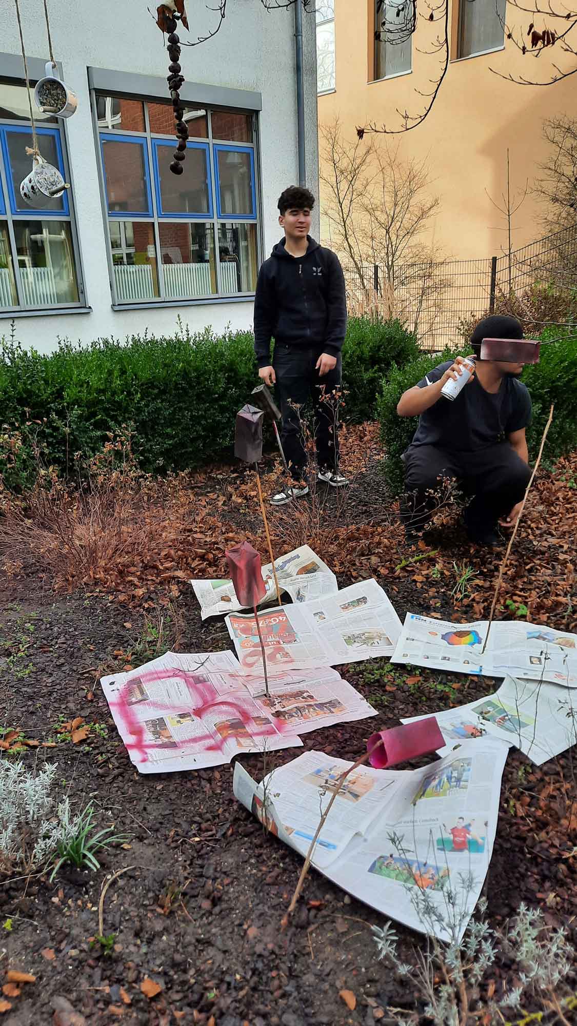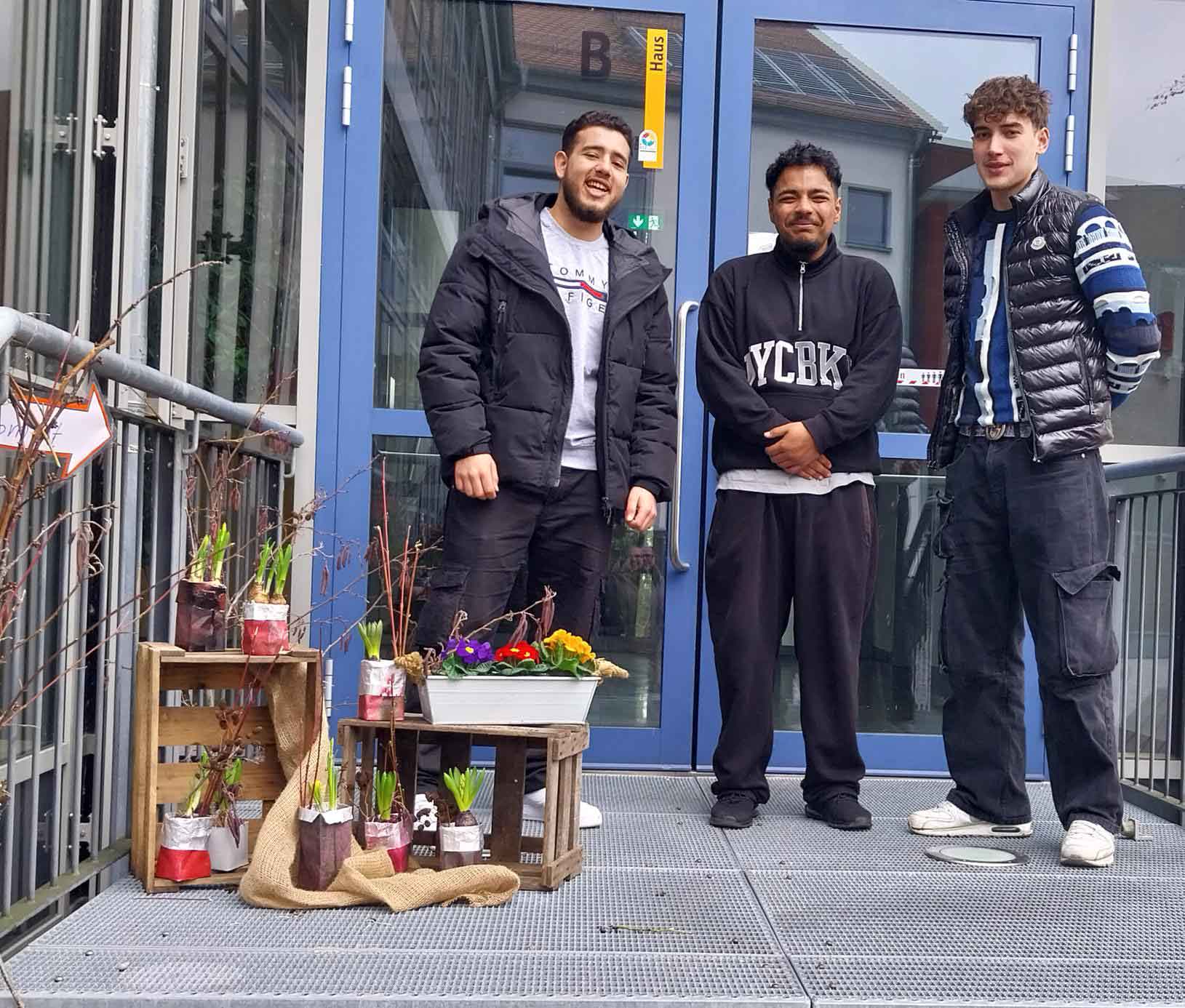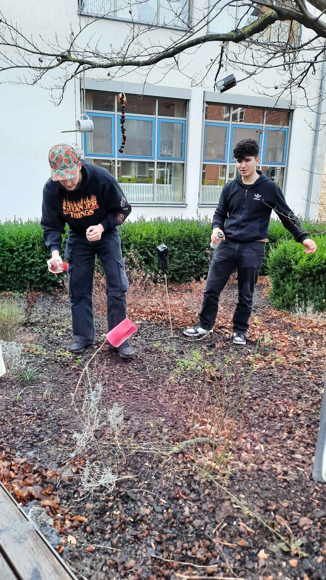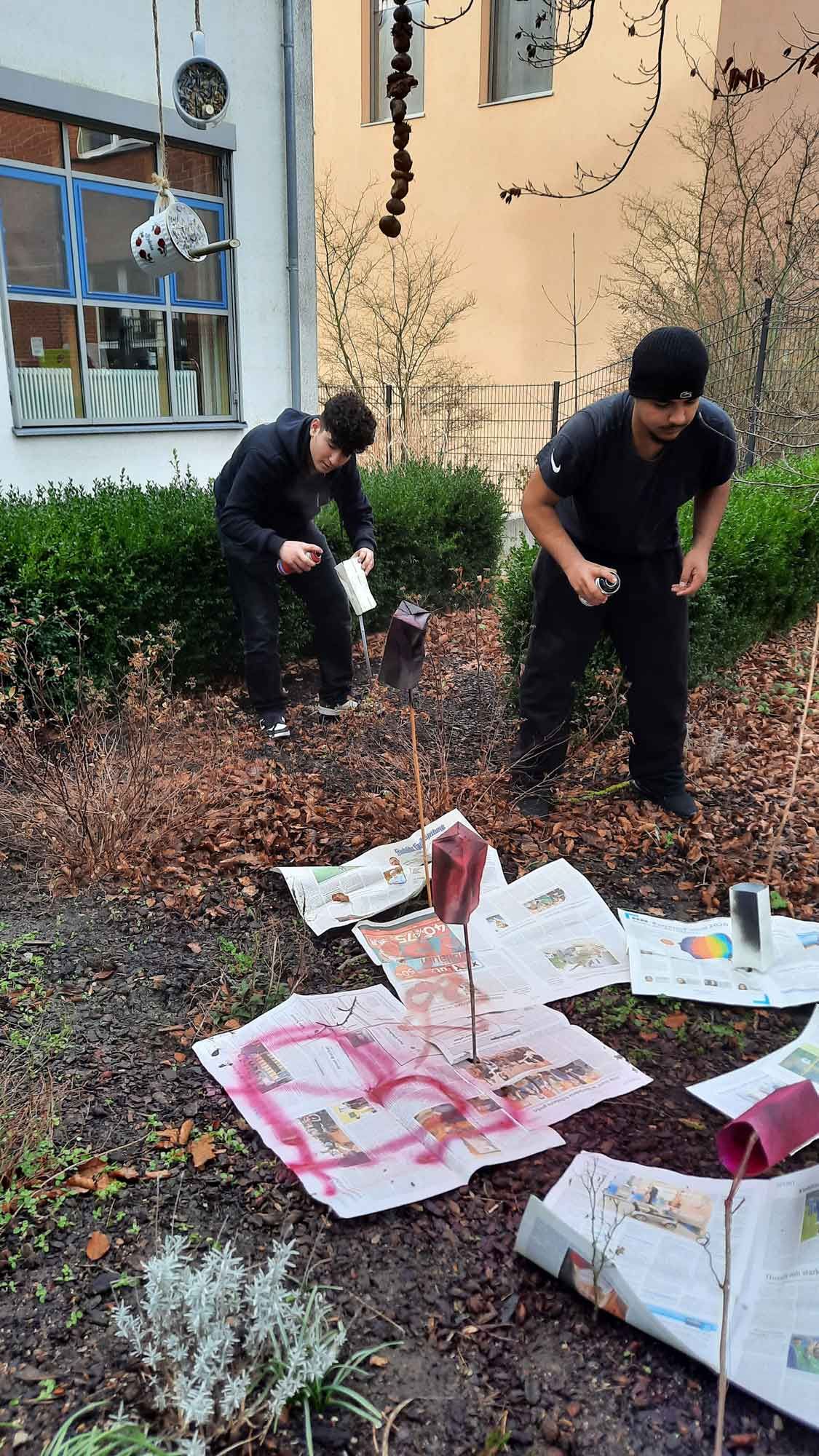 Nachdem alles fertig gestaltet war, kamen beide Klassen im Innenhof der Schule zusammen, um ihr gemeinsames Werk zu betrachten und vorzustellen. Der Klassensprecher der Klasse BVJ b, Isa Khatuev, stellte die Arbeit der beiden Klassen vor. Dazu gab es für alle frisch im Unterricht gebackene Muffins.