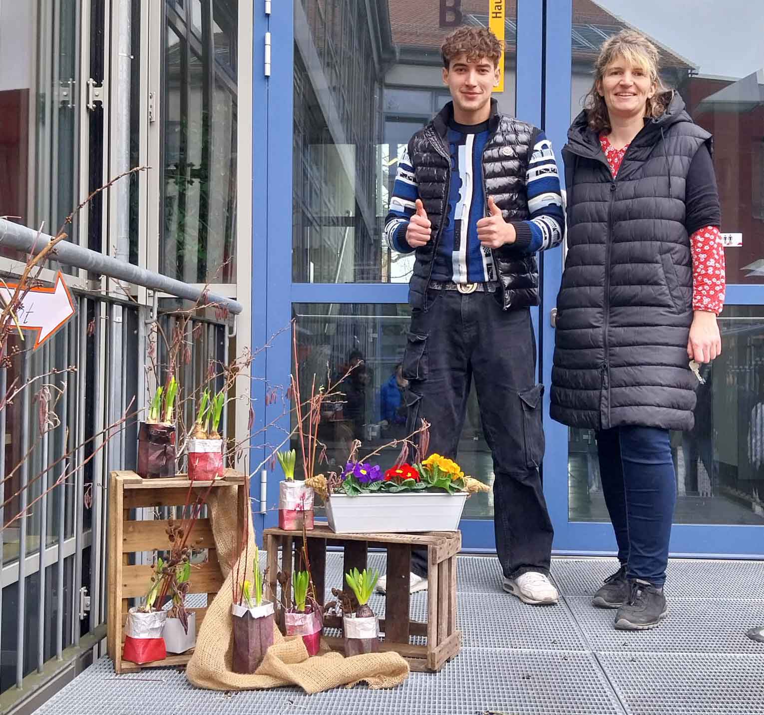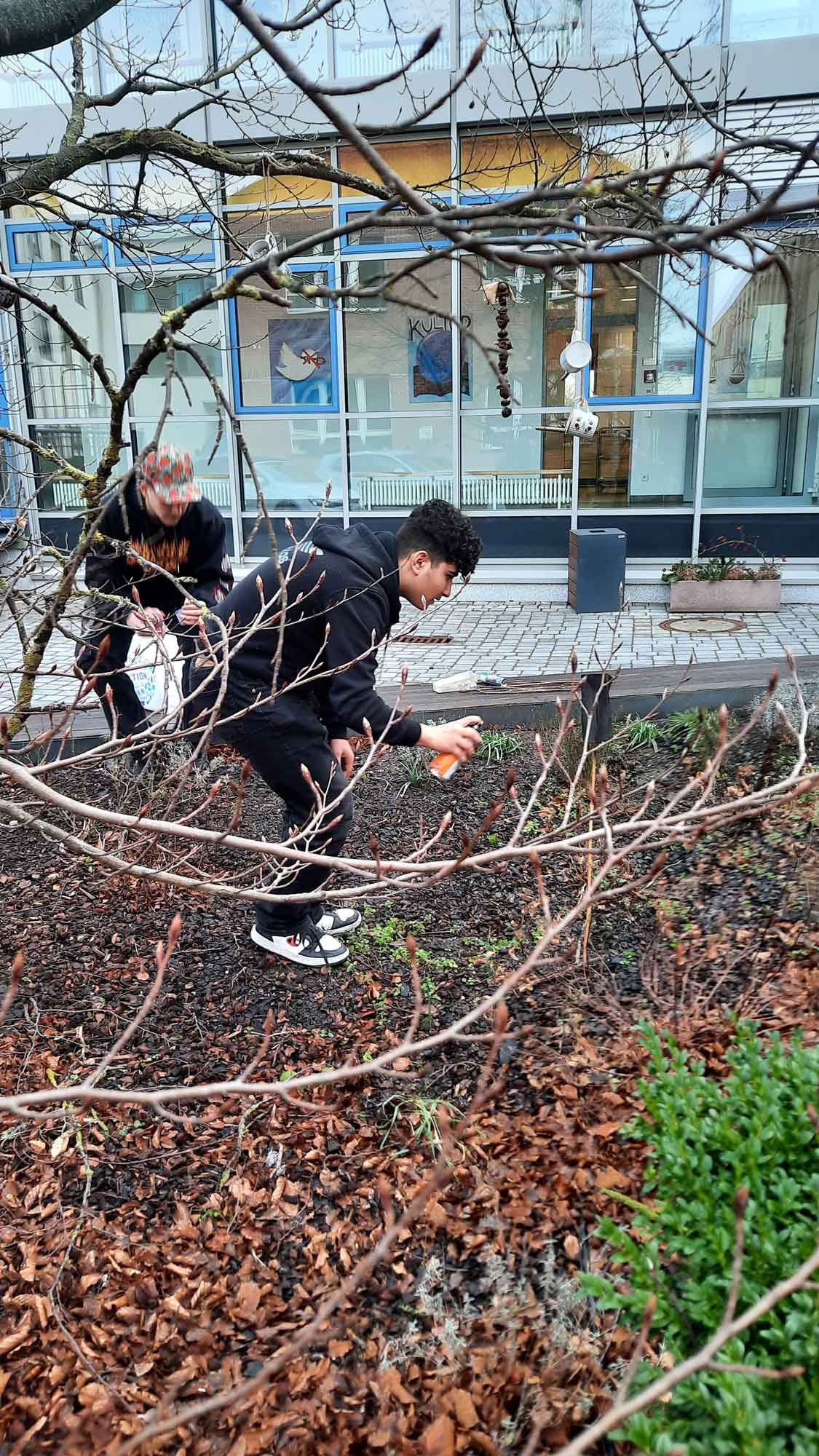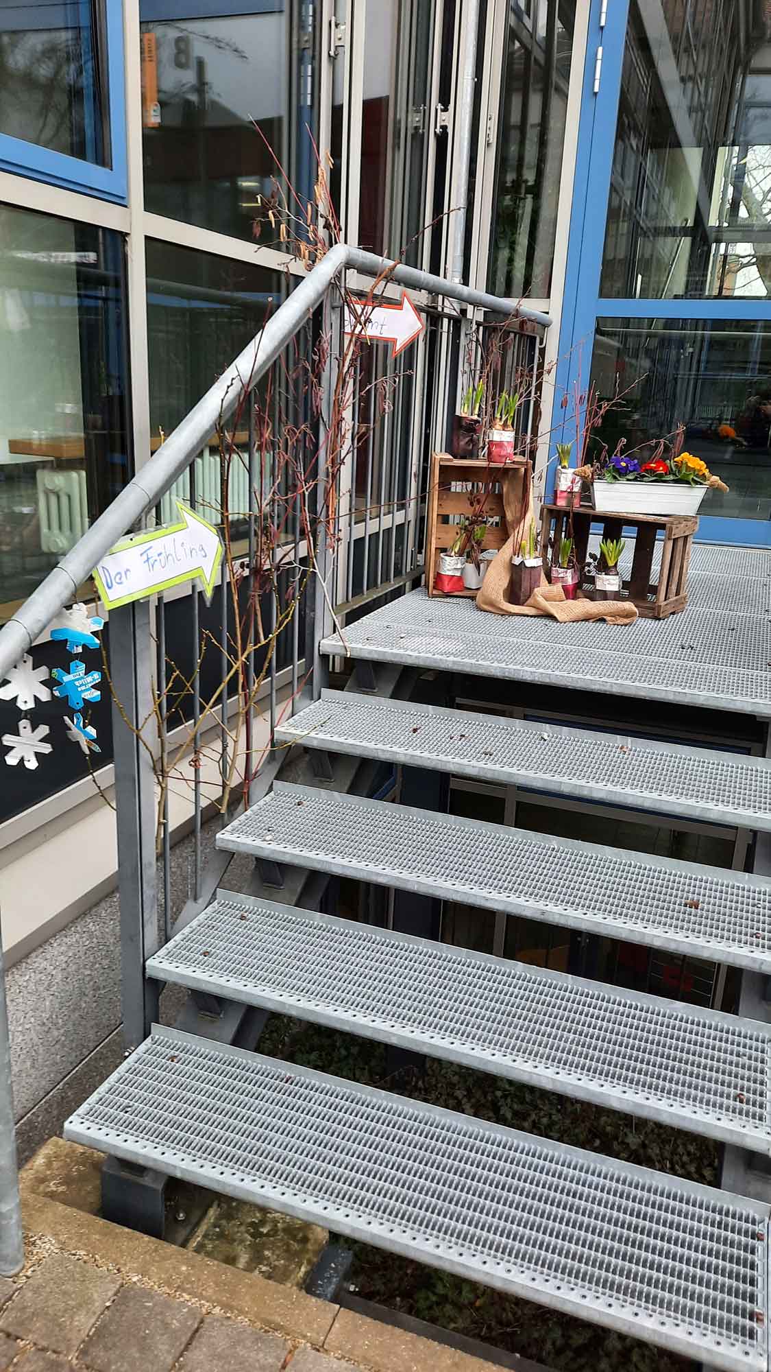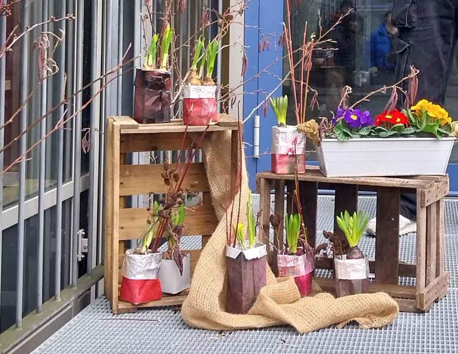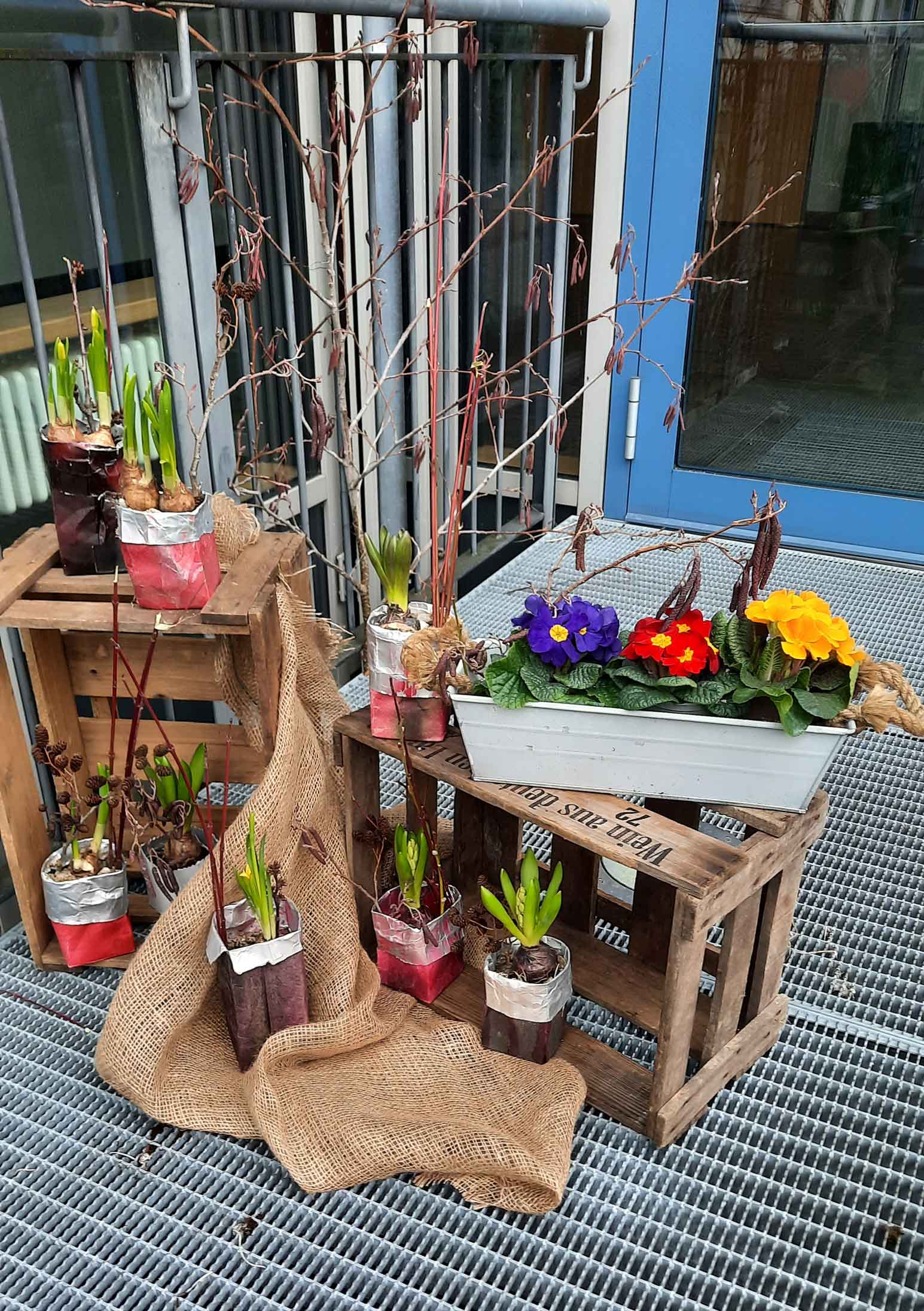In der nächsten Einheit wurden die Getränkekartons zu Pflanzschalen umgestaltet, in die die ersten Blumen des Frühjahrs von den Schülern gepflanzt wurden. Die Namen der Blumen und der knospenden Zweige wurden von den Schülern bestimmt, bevor es ans Einpflanzen und Befestigen der Zweige ging. Auf der Außentreppe des B Gebäudes entstand so eine Naturausstellung, die den Frühling einläutete.