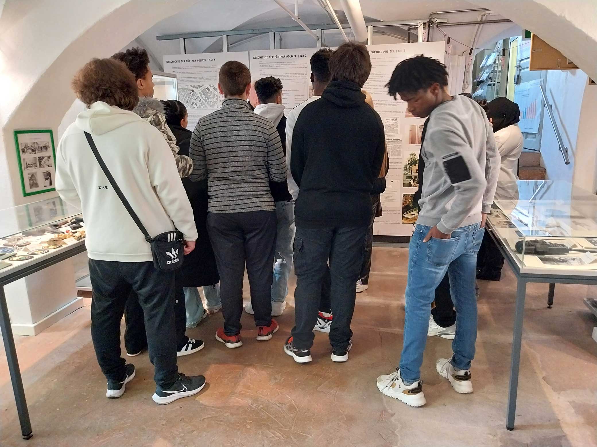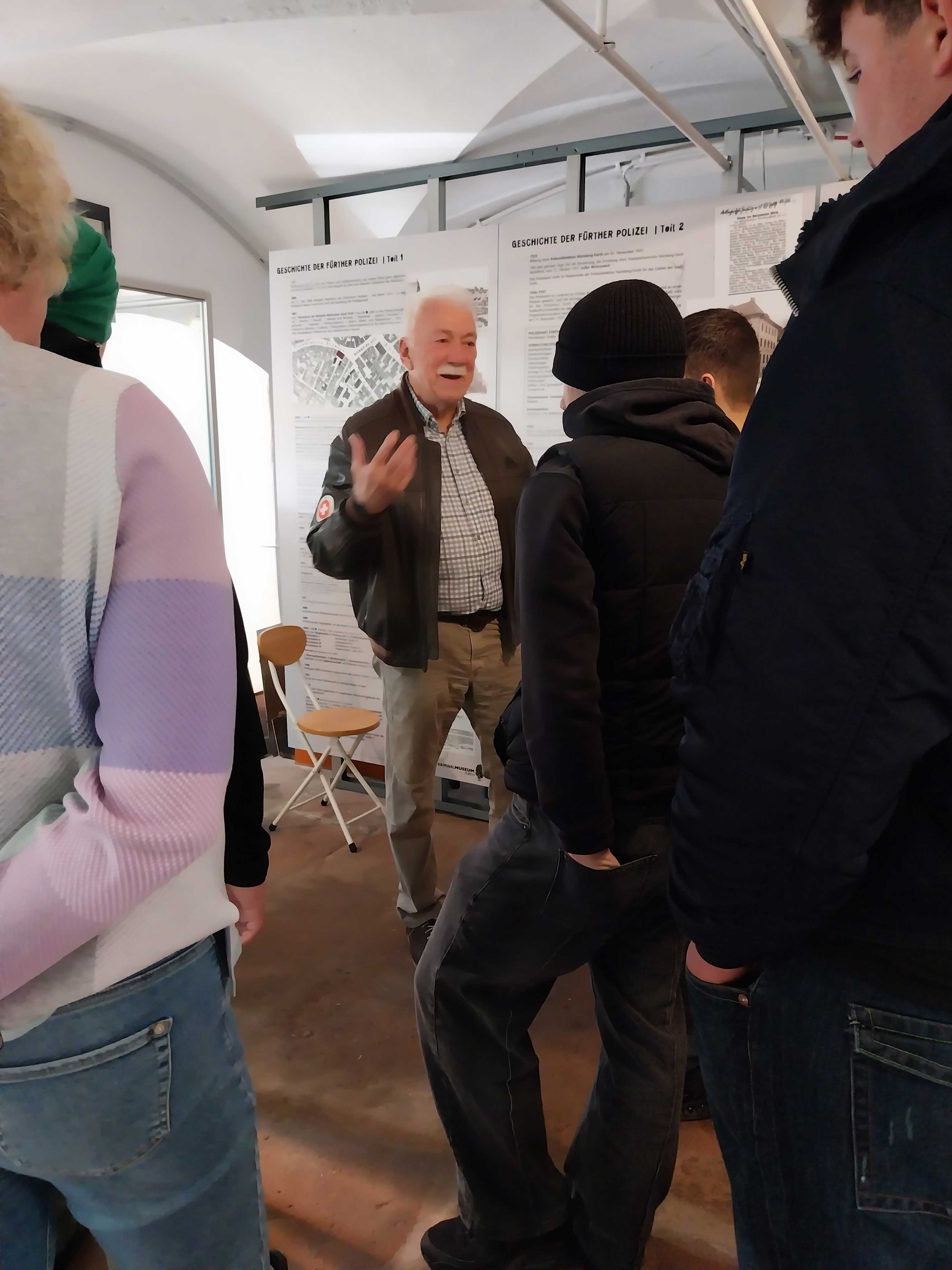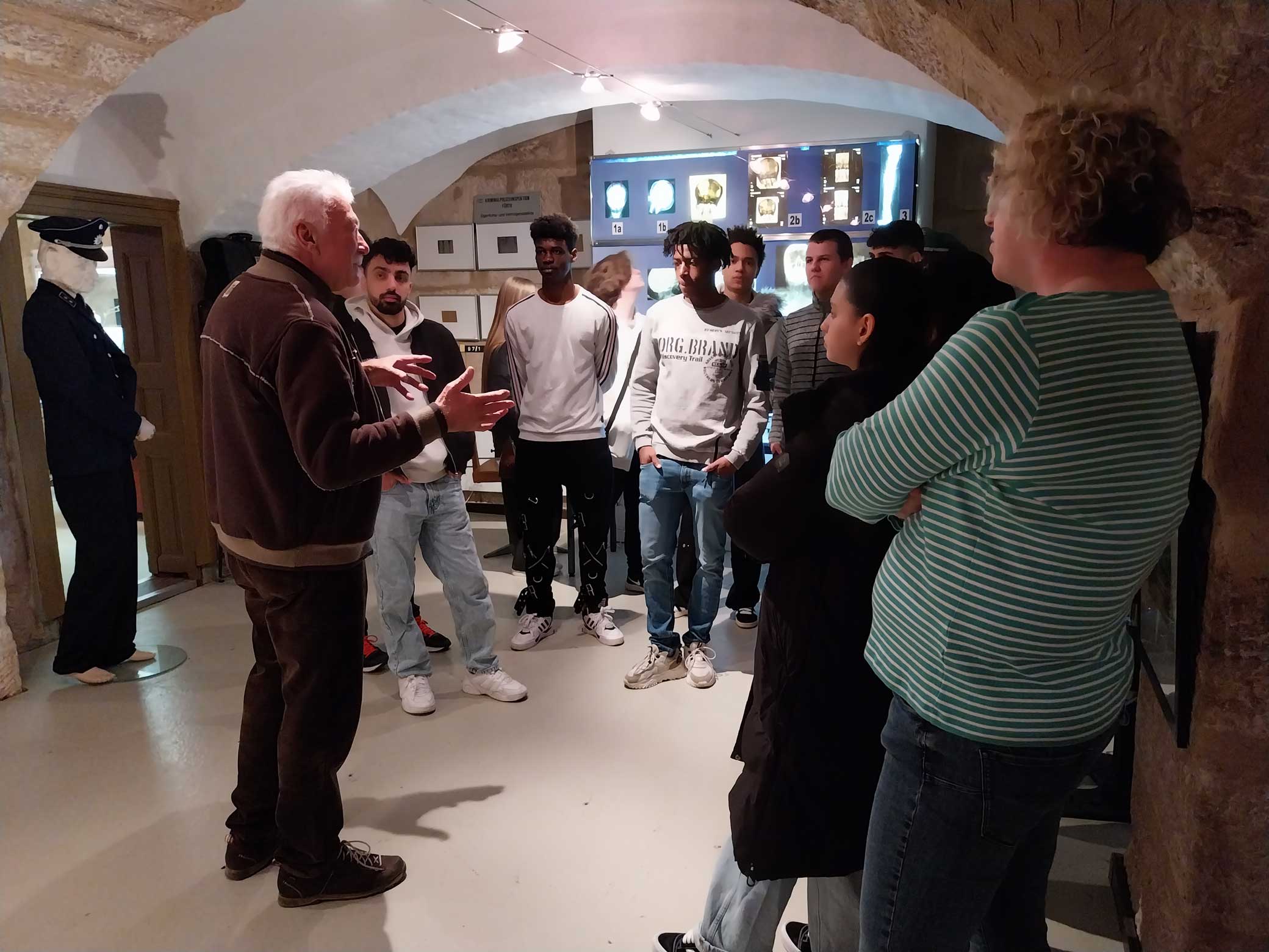 Herr Dietsch führte unsere Schülerinnen und Schüler selbst durch die Ausstellung. Durch seine unkomplizierte, offene Art gelang es ihm sehr schnell, die Schülerinnen und Schüler zu faszinieren und für die Fürther Polizeigeschichte sowie Kriminalfälle und deren Aufklärung zu interessieren. Er berichtete, wie er das Museum zusammen mit den anderen Gründungsmitgliedern aufgebaut hatte. Einen besonderen Eindruck hinterließen seine Berichte über die Kriminalfälle, in denen er selbst ermittelt hatte.