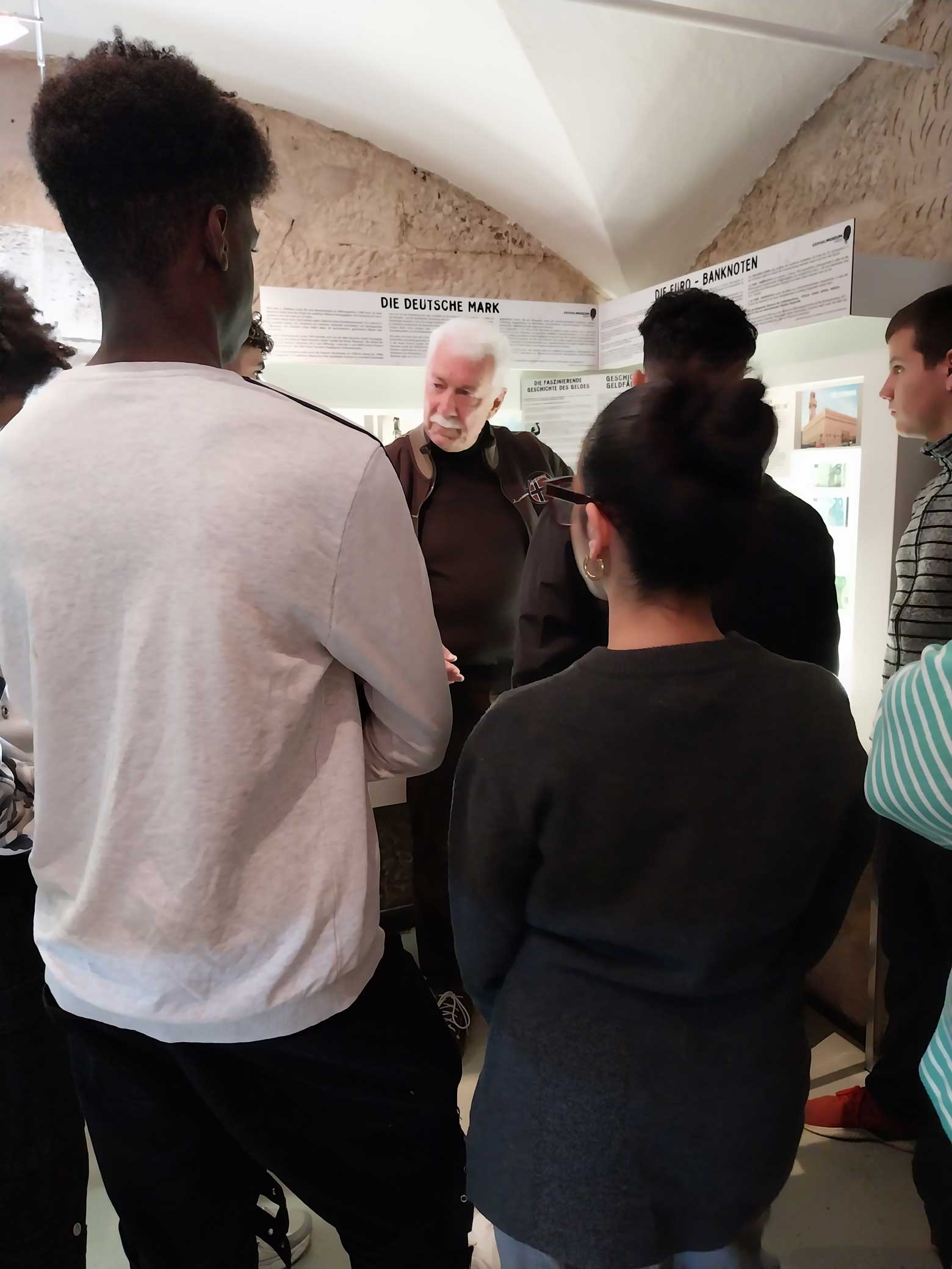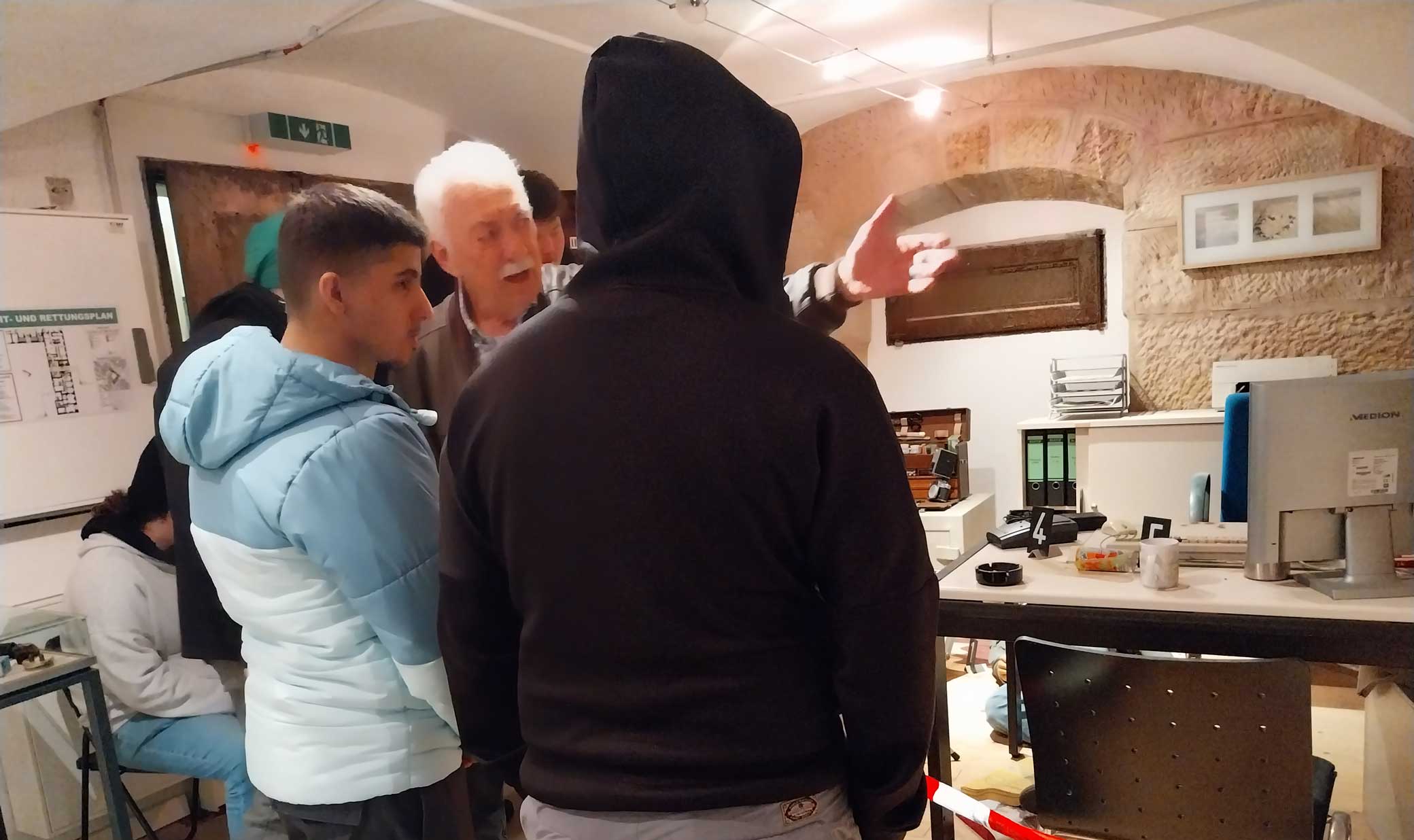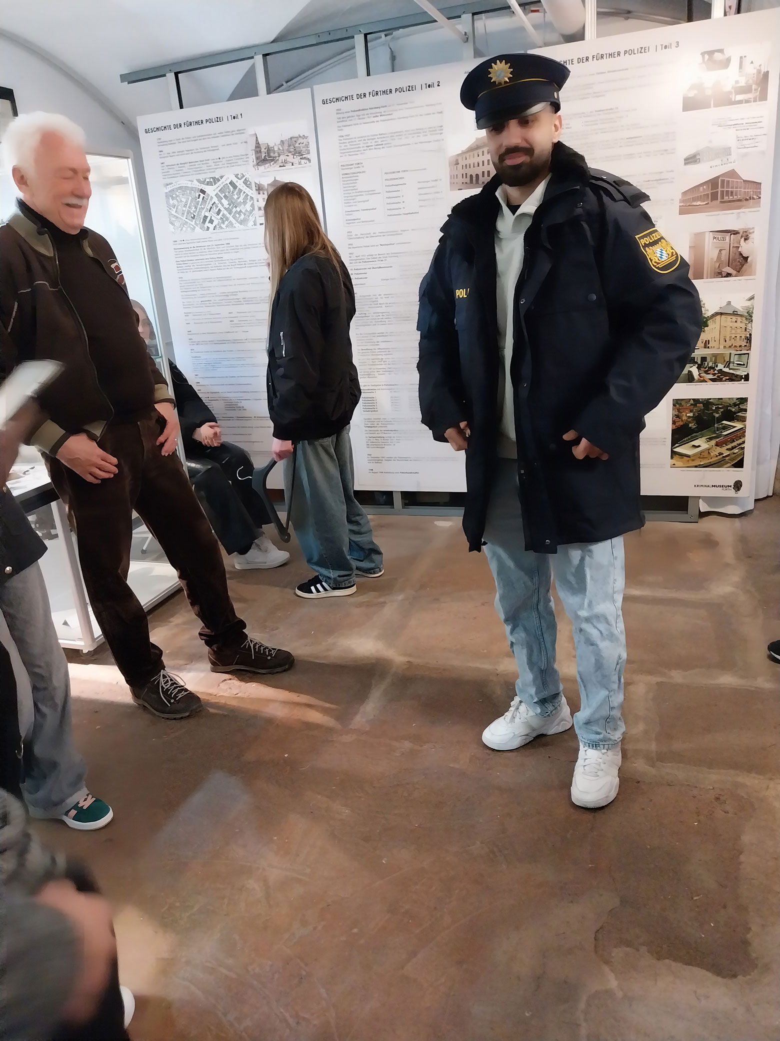 Herr Dietsch führte unsere Schülerinnen und Schüler selbst durch die Ausstellung. Durch seine unkomplizierte, offene Art gelang es ihm sehr schnell, die Schülerinnen und Schüler zu faszinieren und für die Fürther Polizeigeschichte sowie Kriminalfälle und deren Aufklärung zu interessieren. Er berichtete, wie er das Museum zusammen mit den anderen Gründungsmitgliedern aufgebaut hatte. Einen besonderen Eindruck hinterließen seine Berichte über die Kriminalfälle, in denen er selbst ermittelt hatte.