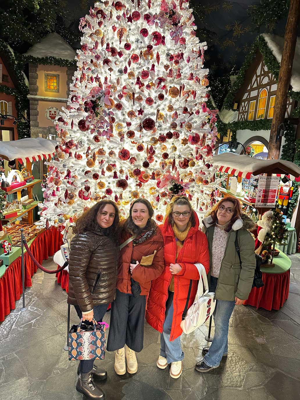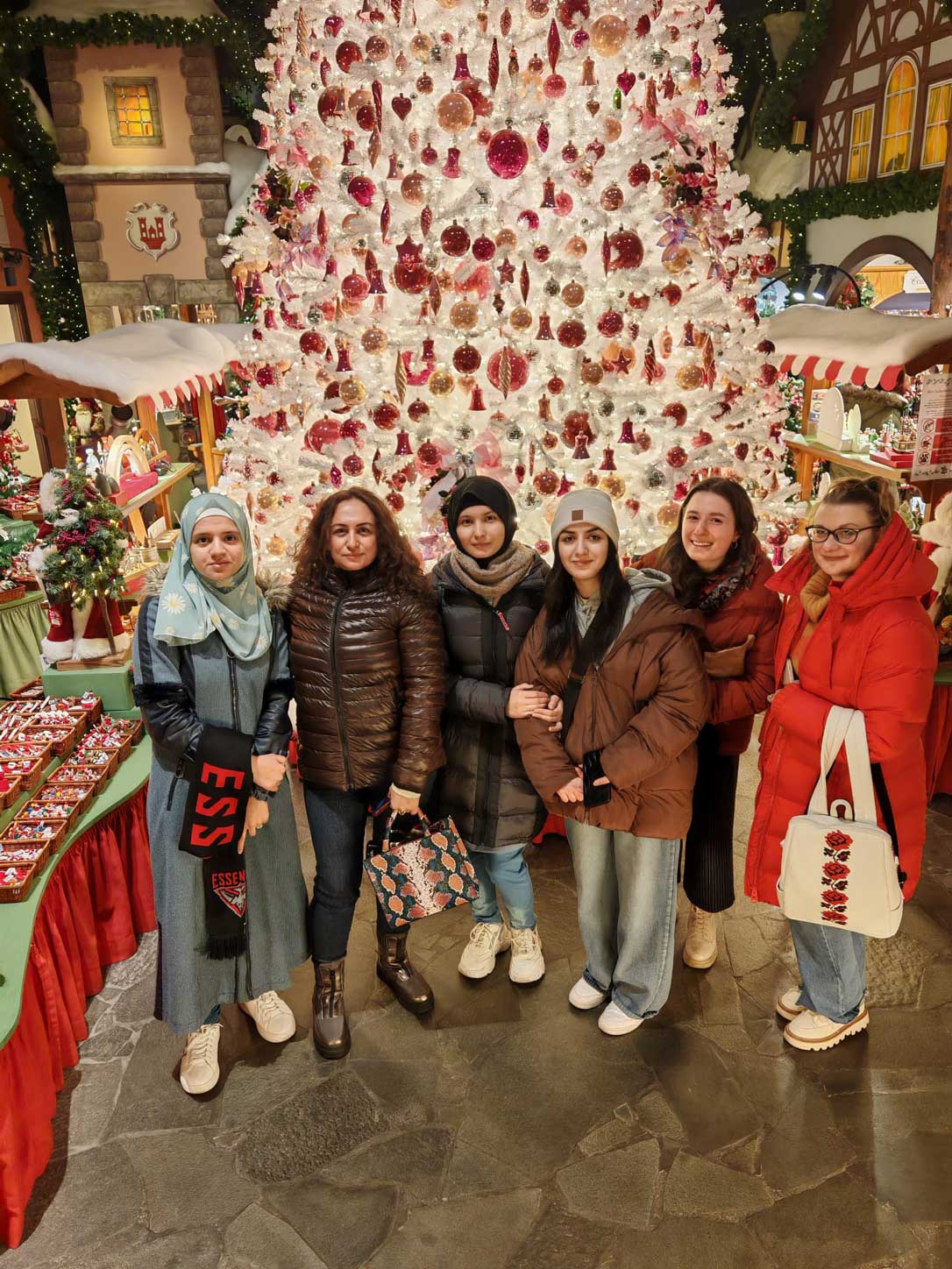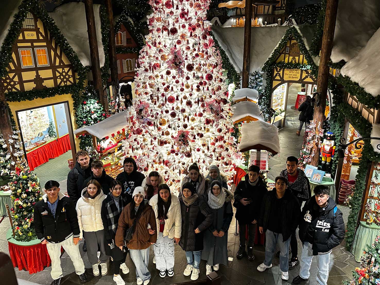 Um 10 Uhr erreichten wir unser Ziel. Die Stadt Rothenburg ob der Tauber empfing uns wie eine Kulisse aus einer Weihnachtsgeschichte. Die historischen Straßen waren mit verschiedenen Weihnachtsschmuckartikeln geschmückt, und die festliche Atmosphäre war überall spürbar. Unser erster Halt war das berühmte Weihnachtsmuseum. Bereits am Eingang wurden wir von einem großen, weißen, sich drehenden Weihnachtsbaum begeistert. Die Schülerinnen und Schüler staunten über die glanzvollen Farben, den funkelnden Schmuck, die duftenden Kerzen, die tollen Bücher, Spiele und die zahlreichen Weihnachtsbaumspielzeuge. Viele nutzten die Gelegenheit, kleine Souvenirs und Erinnerungsstücke zu kaufen.