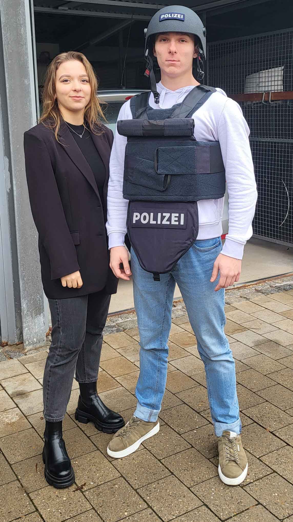 Auch wurden Handschellen ausprobiert, der Schlagstock inspiziert, eine schusssichere Weste angelegt und erklärt, welche Befugnisse die Polizei bei der Aufnahme einer Straftat hat.