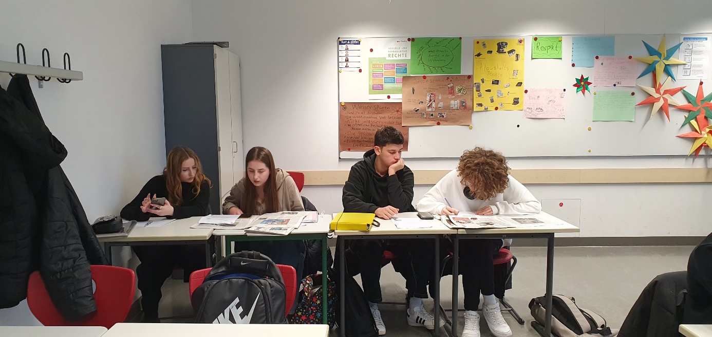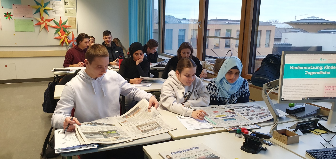 Zwei Schülerinnen versuchten sich als Interviewer. Sie formulierten zuerst einige Fragen und befragten dann die Klasse zur Mediennutzung in Deutschland und in ihrem Heimatland. Die Befragung ergab, dass sich die meisten Schüler:innen der Bik a überwiegend im Internet informieren. Zeitungen werden nur von den Wenigsten gelesen. Dennoch war das Zeitungprojekt für die Klasse von großer Bedeutung, denn neben einem Einblick in die fränkische Tagespresse eröffnete es ihnen einen Weg in das eigenständige Lesen korrekt geschriebener Nachrichten, mit deren Hilfe sie ihr Deutsch trainieren und ihren Wortschatz effektiv erweitern können.