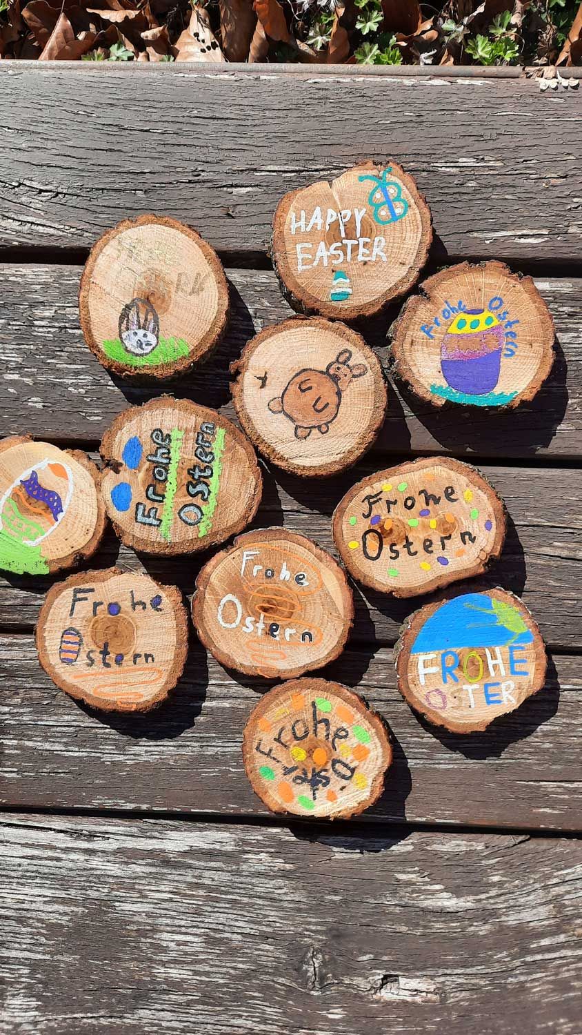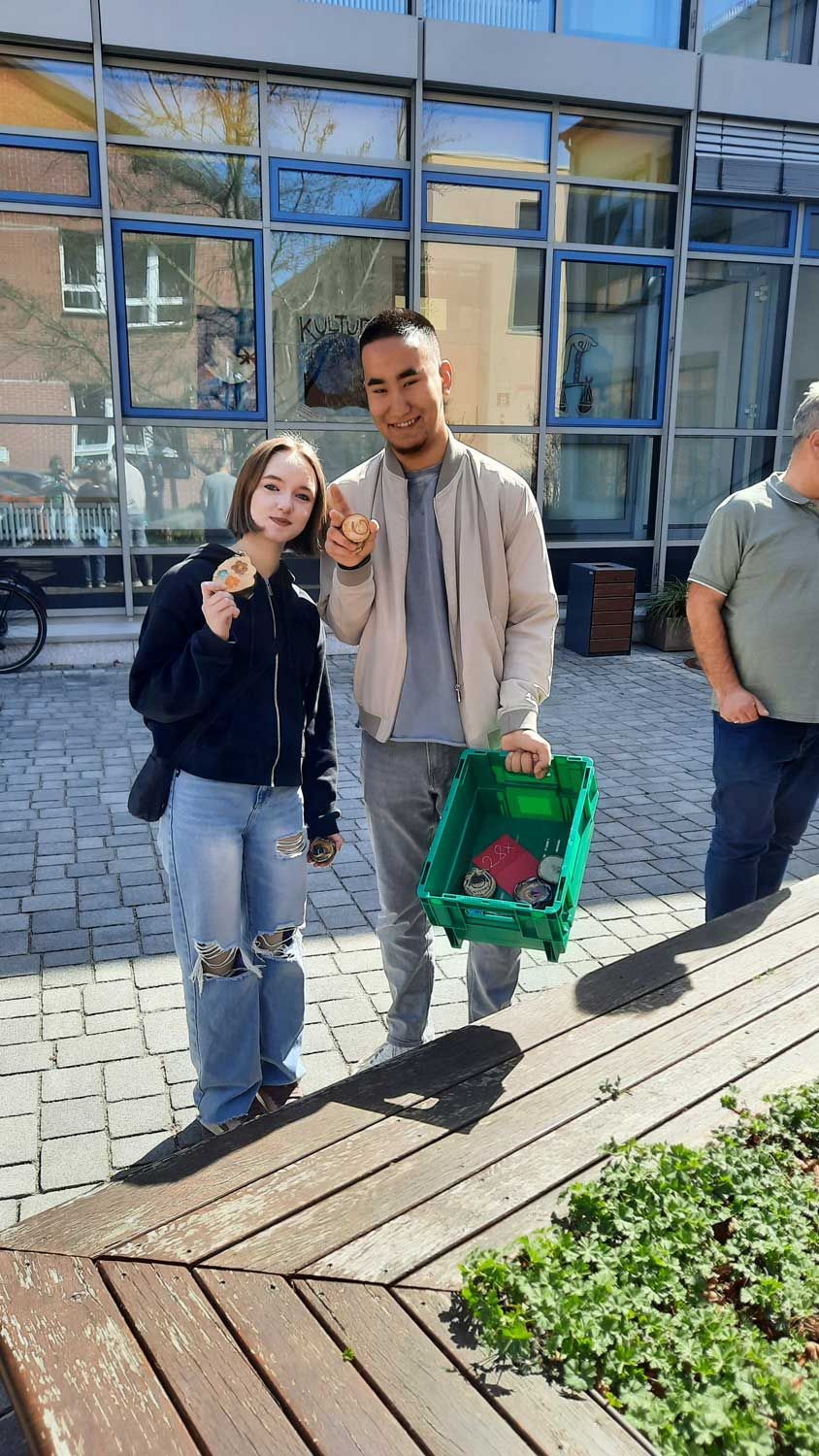 Täglich, in der Woche vor den Osterferien, versteckte eine Klasse aus dem Fachbereich die verzierten Baumscheiben in Schulhof und Aula – ganz im Stil vom Osterhasen persönlich! Alle Schülerinnen und Schüler des BSZ durften sich an der großen Suchaktion beteiligen. Wer eine Baumscheibe fand, konnte sie gegen ein kleines Ostergeschenk eintauschen. Jedes Ostergeschenk enthielt einen oder mehrere von über 500 Stück gebackenen Osterhasen in allen Formen und Größen - dekoriert und verpackt – hergestellt von den fleißigen Händen der Berufsvorbereitungsklassen. Die Geschenkverpackungen waren ebenfalls selbst gestaltet und mit gestempelten Osterstermotiven verziert.