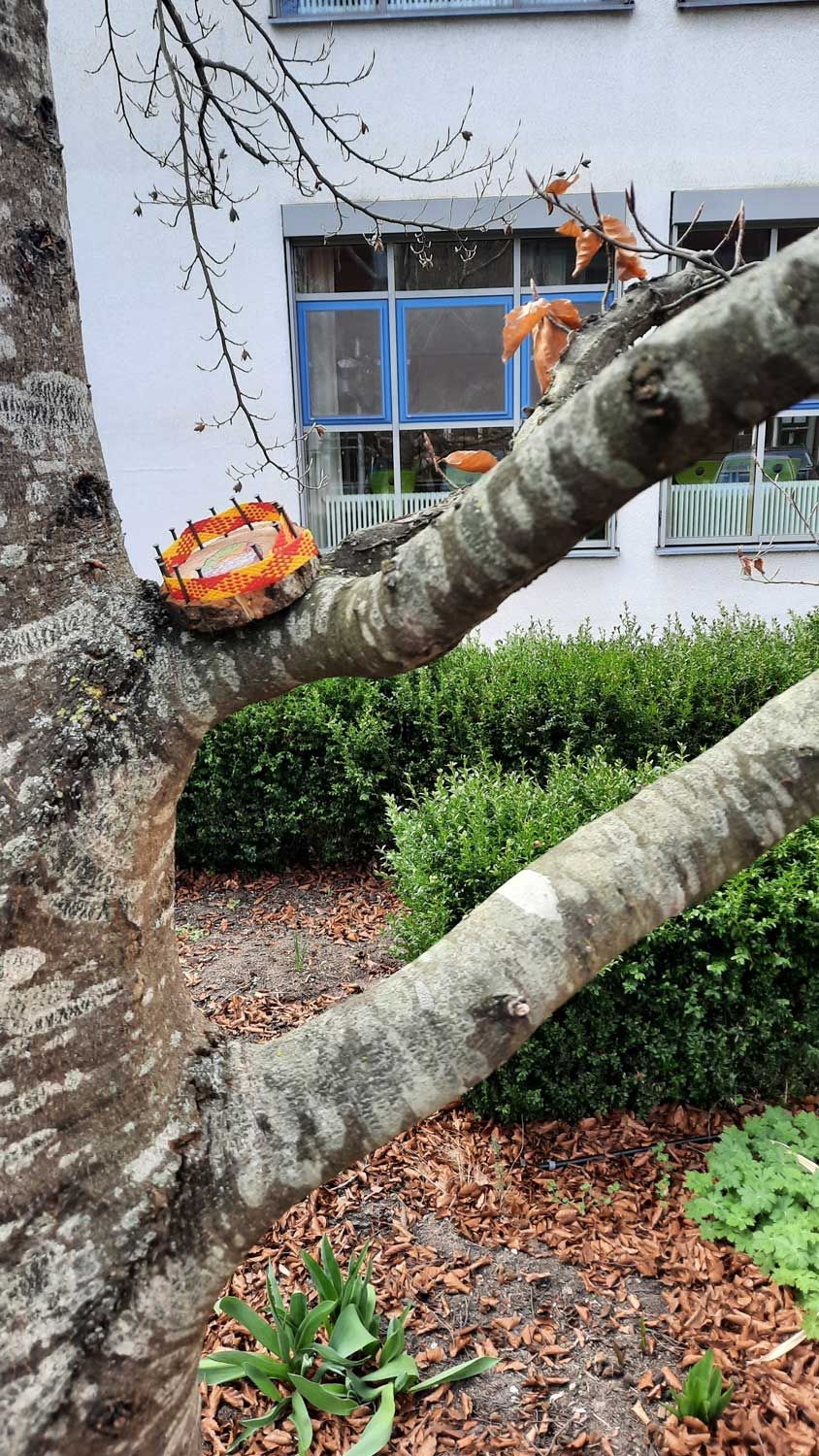 Im Fach Berufliches Handeln wurden aus dicken Ästen über 150 Holzscheiben – sorgfältig von Hand in der Werkstatt gesägt. Beim anschließenden Gestalten zeigten die Schülerinnen und Schüler viel Fantasie und Talent. Ob bemalen, besprühen oder kunstvoll umflechten – der Kreativität waren keine Grenzen gesetzt.
