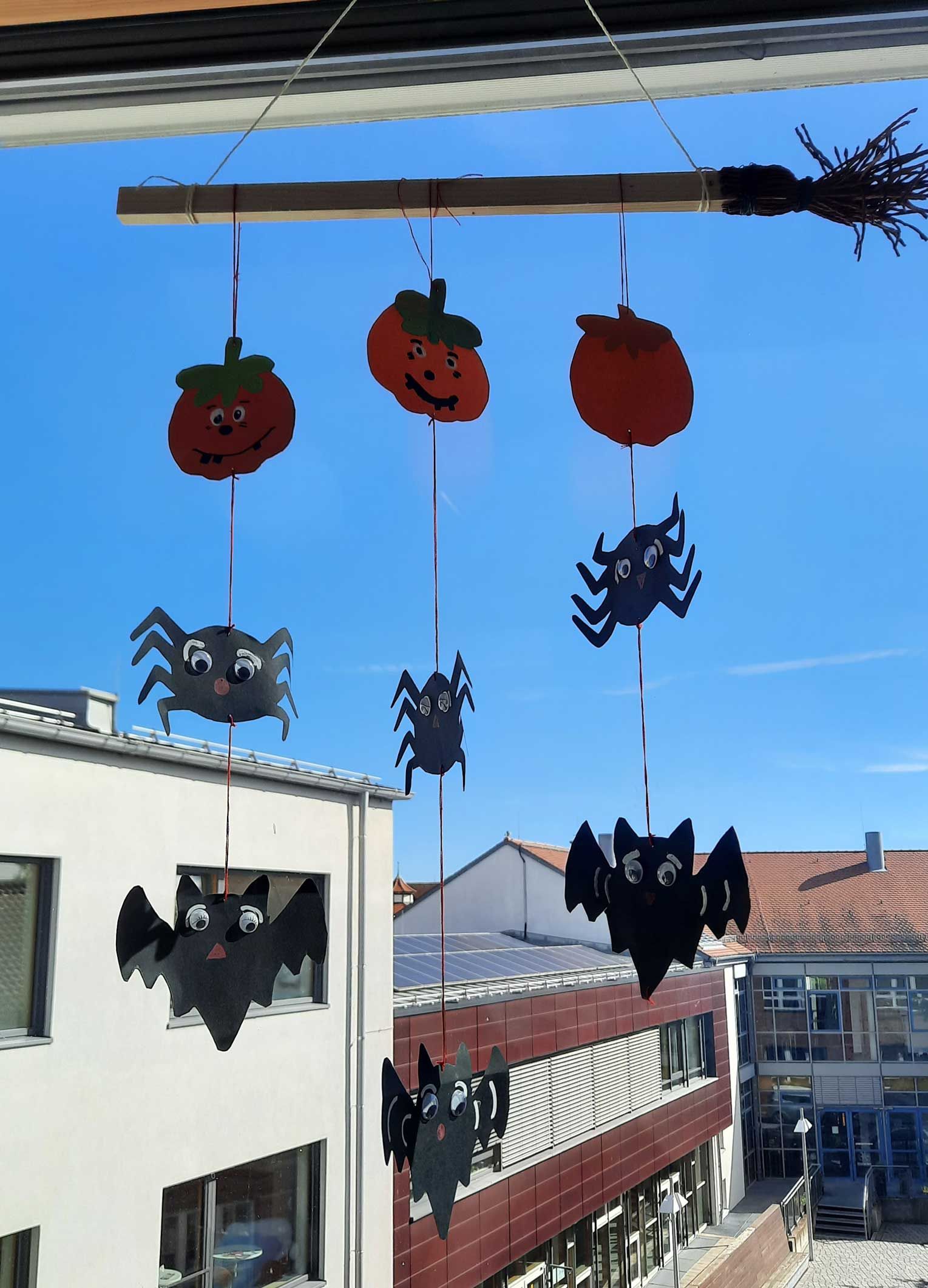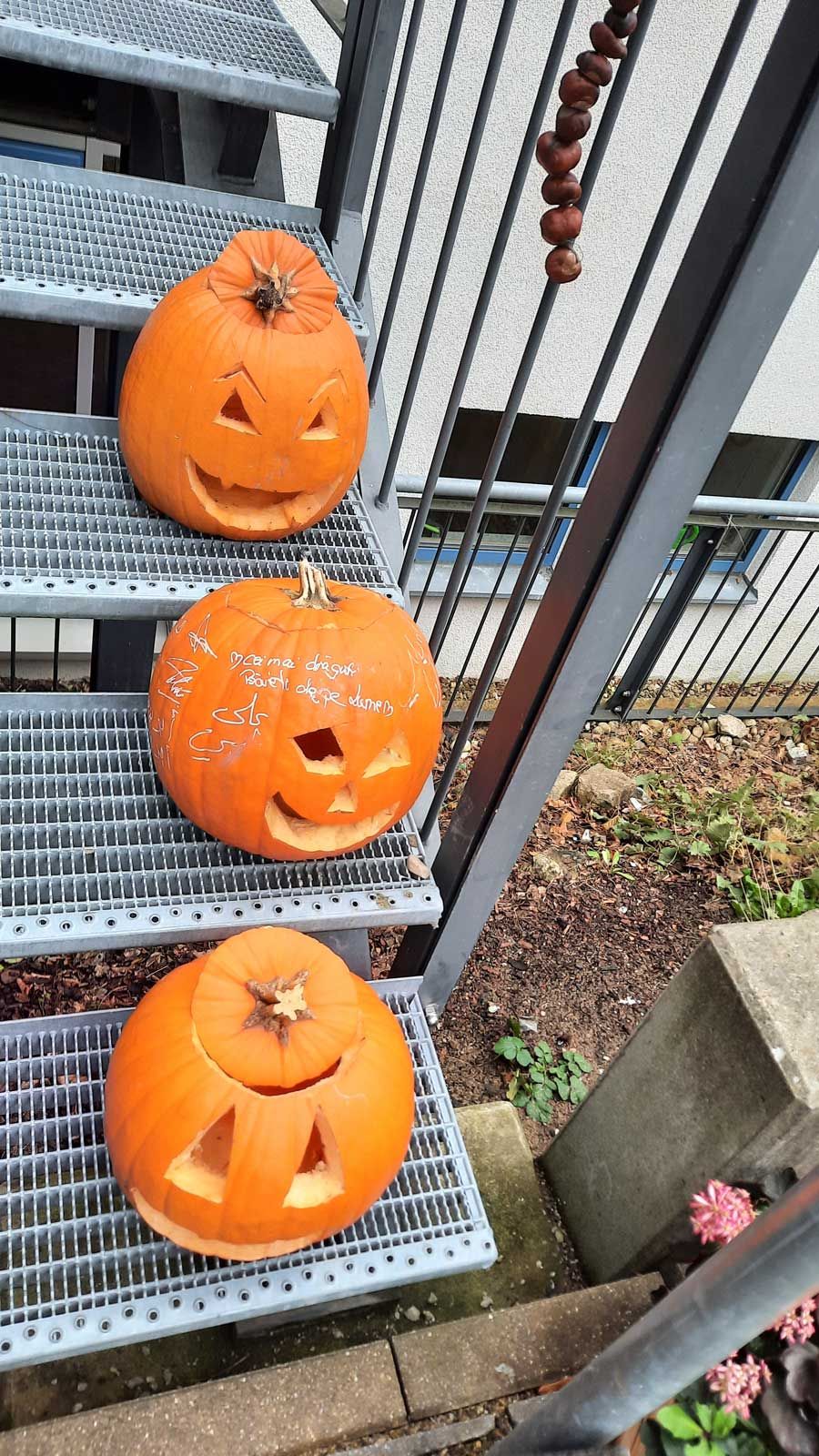 In einer Unterrichtseinheit wurden Vokabeln und Bräuche besprochen, darunter der Geist, die Fledermaus und der Kürbis. Die Schüler gestalteten die Klassenzimmerfenster mit diesen Motiven. Natürlich galt es dann noch, große Halloweenkürbisse auszuhöhlen und gruselige Gesichter hineinzuschnitzen, die dann 2 Wochen lang alle, die im Innenhof Richtung B-Gebäude gingen, begrüßten. Dort tauchten sie den äußeren Treppenaufgang zu den Küchen 2 und 3 in ein herbstliches Orange.
