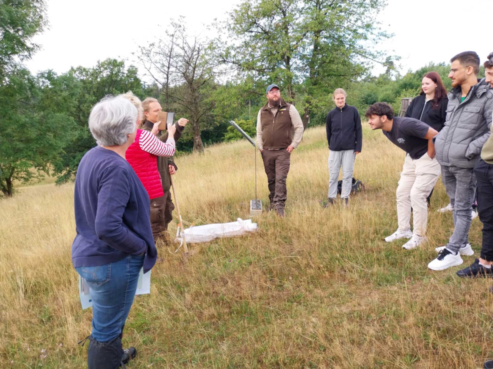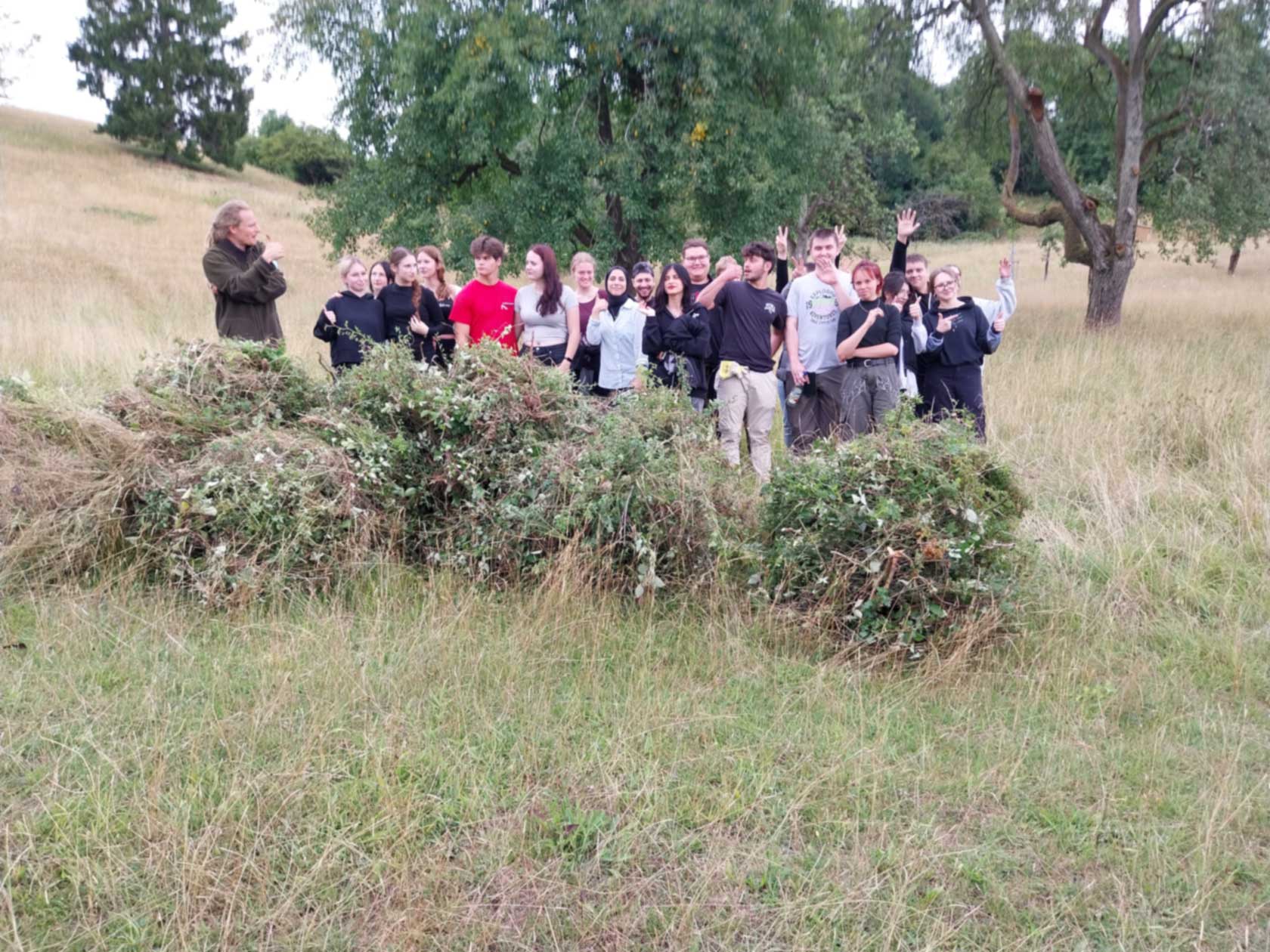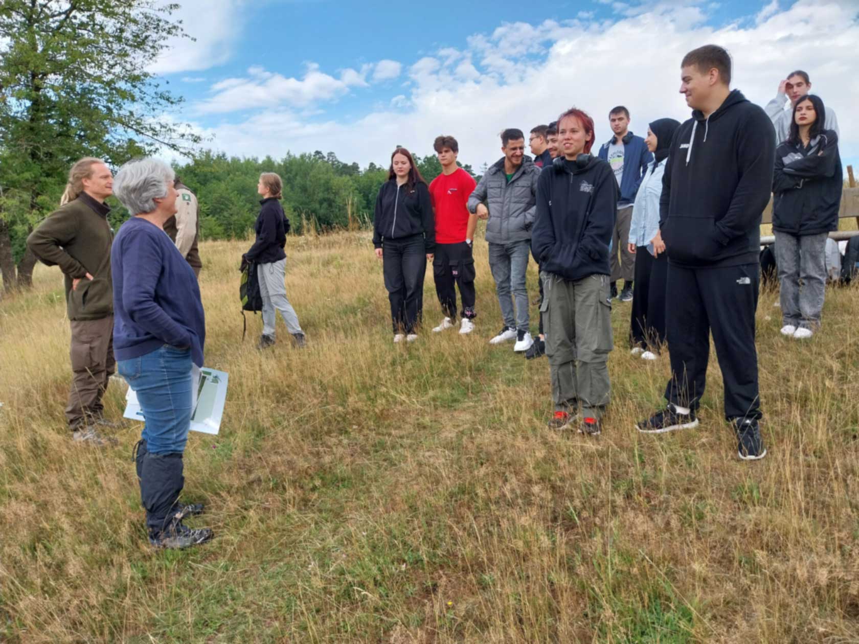 Benjamin Krauthahn und Karin Blümlein erklärten uns, wie wir helfen konnten, die ökologisch wertvolle Schafhutung zu pflegen. Schafhutungen sind ein wichtiger Lebensraum in der Frankenhöhe. Dort wachsen unscheinbare Pflanzen wie die stängellose Distel oder auch der Wiesenthymian. Das Problem ist aber, dass sich Sträucher, wie z. B. Brombeeren, Rosen oder Schlehen, ausbreiten. Diese dornigen und stacheligen Gewächse werden von den Schafen nicht gefressen. Ihr ungehindertes Wachstum würde die Heuschrecken, Eidechsen, Schmetterlinge und die seltenen Pflanzen verdrängen. Die Schülerinnen und Schüler aus der Ukraine, aus Syrien, Afghanistan, Rumänien und der Türkei hörten aufmerksam zu.