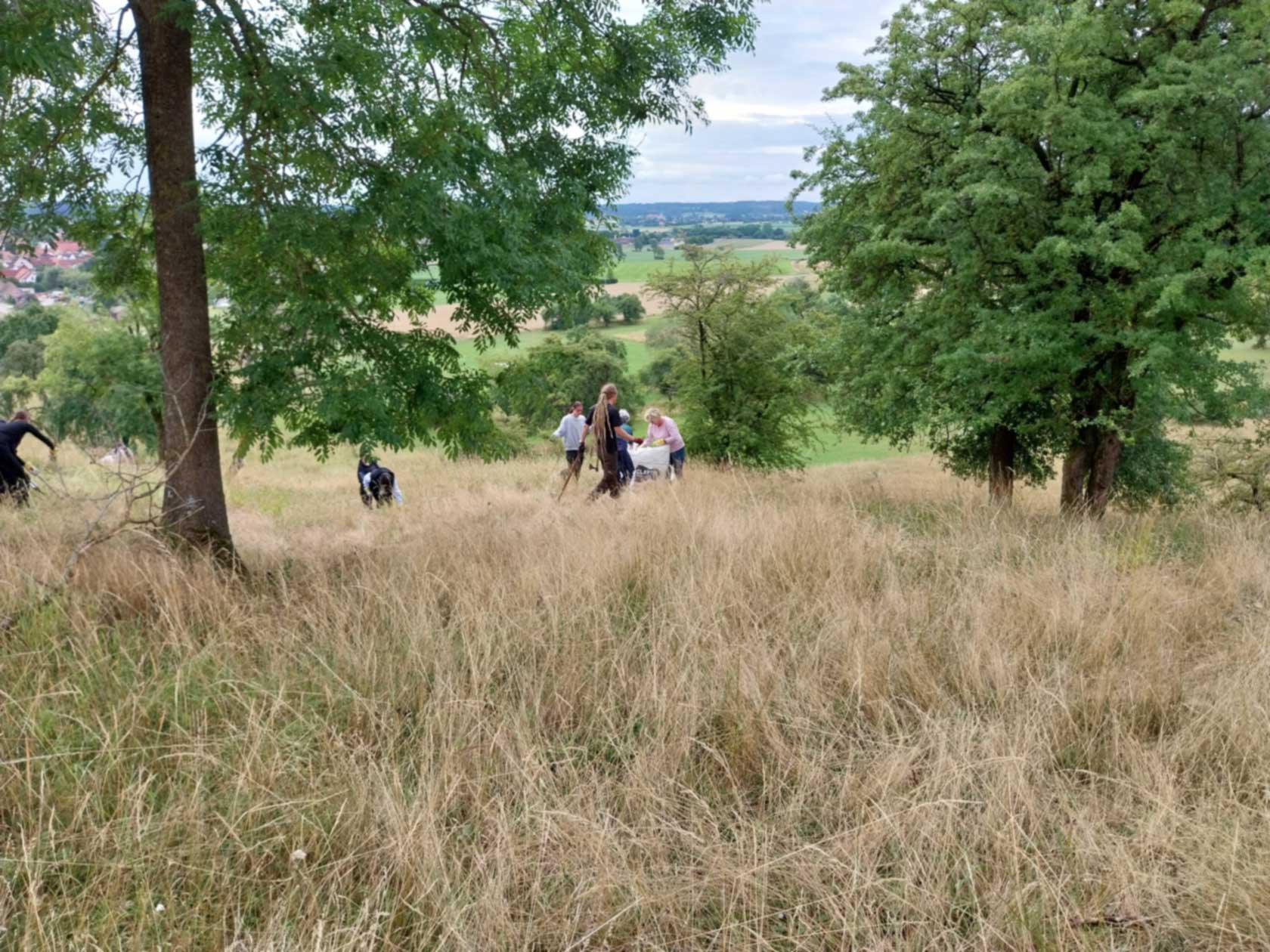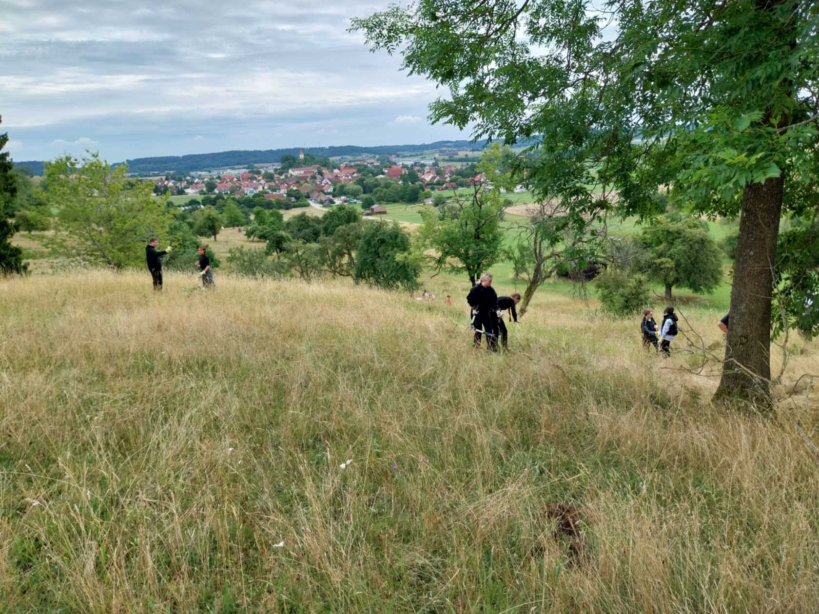Trotz der schwierigen Hanglage arbeiteten sich die 20 Schülerinnen und Schüler und ihre Lehrkräfte auf der Hutung vor. Sie wurden tatkräftig von Karin Blümlein und den Rangern unterstützt. Immer wieder traten Fragen auf, die Karin Blümlein und Benjamin Krauthahn geduldig beantworteten: die Klassen wollten wissen, wie die Tiere und Pflanzen, die sie gerade gefunden haben, auf Deutsch heißen. So entstanden während der Arbeit gute Gespräche, die den Schülerinnen und Schülern ihre neue mittelfränkische Heimat näher brachten, beim Deutschlernen halfen und die Bedeutung des Naturschutzes praktisch erklärten. Neben der anstrengenden Arbeit kam aber auch der Spaß nicht zu kurz. Es wurde viel gelacht. Die Pausenverpflegung von Frau Kößer und Frau Weiss wurde dankbar verzehrt.