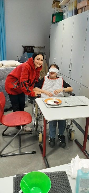 An der letzten Station, „Hilfe beim Essen und Trinken“, lernten die Klassen, wie sie die für die Eingabe der Mahlzeiten korrekte Sitzposition eines Bewohners im Rollstuhl herstellen und fachgerecht das Essen und Trinken anreichen können. Der Tag war für alle Beteiligten eine große Bereicherung und förderte das Bewusstsein für die Bedürfnisse älterer Menschen. Unser besonderer Dank gilt Frau Herta Körber für die intensive Vorbereitung und allen Lehrkräften, die die Stationen betreuten und somit zu einem gelungenen Projekt beitrugen.