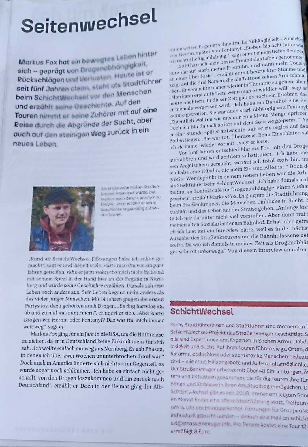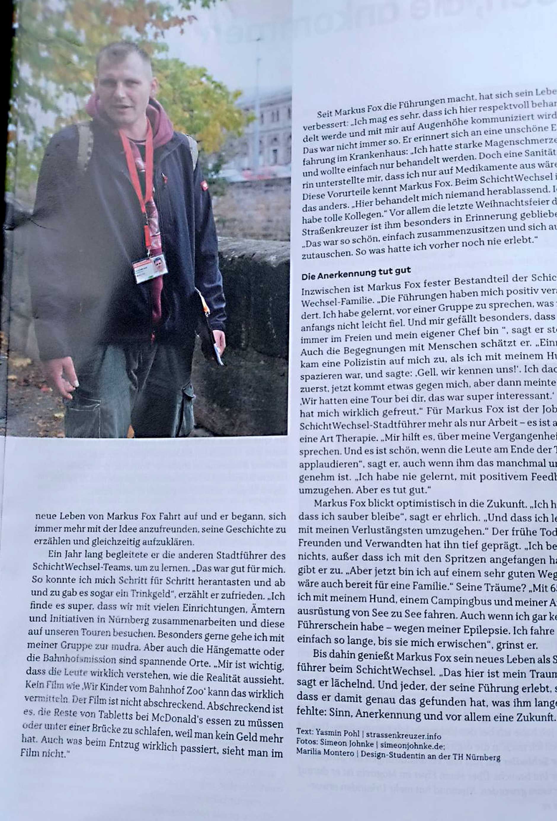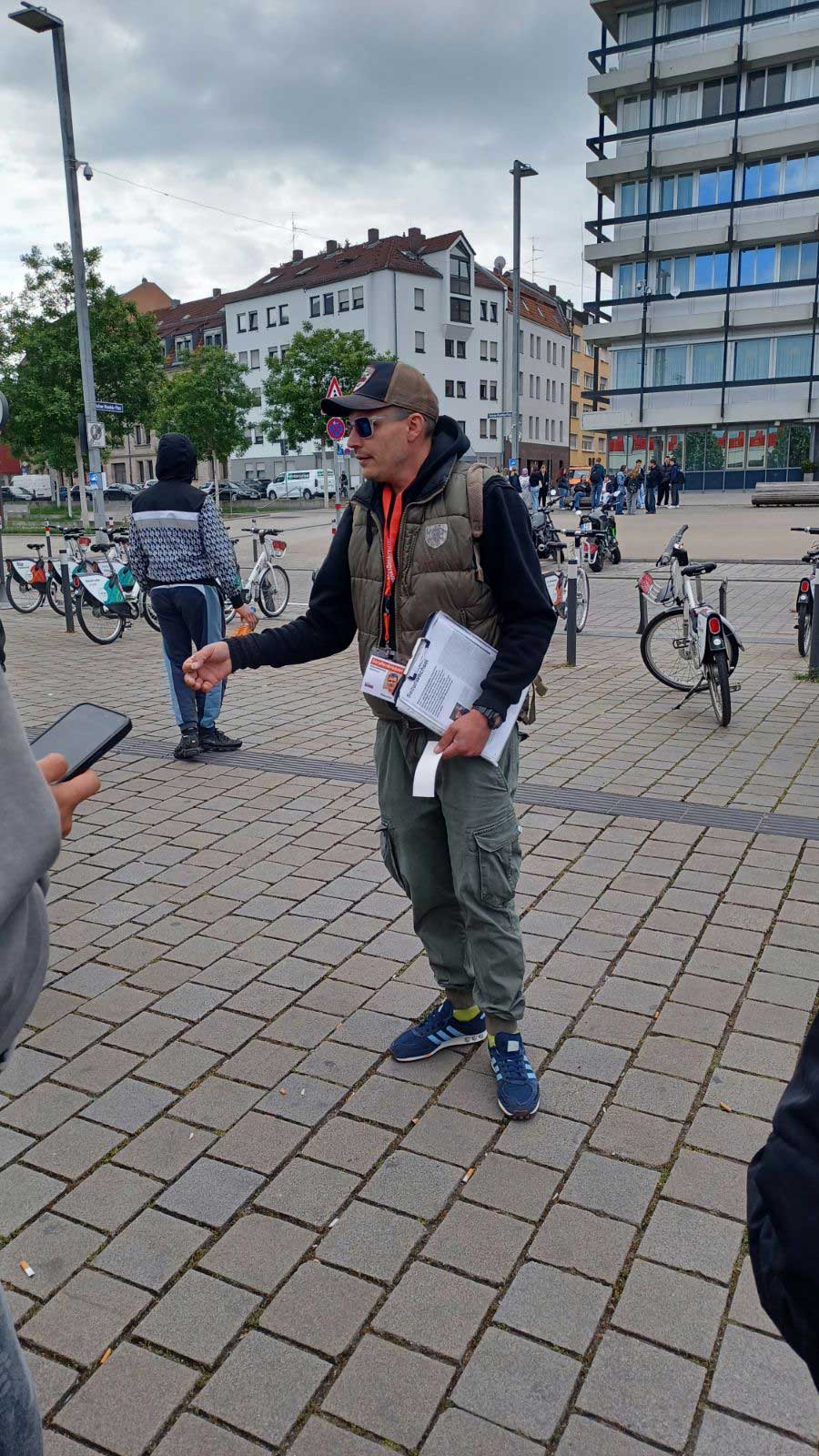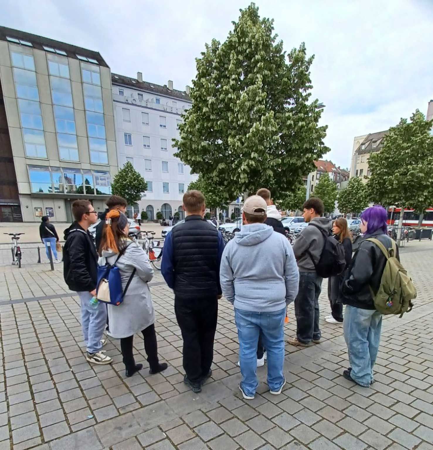 Am 23. Mai 2025 fuhr die Klasse BVJa mit ihren Lehrkräften, Herrn Messer, Frau Geißler-Kraft, Frau Bühler-Saal, nach Nürnberg. Geplant war eine Schichtwechsel-Stadtführung in Nürnberg. Wir trafen unseren Stadtführer, Markus Fox, am Südausgang des Nürnberger Bahnhofs. Markus erzählte uns zunächst seine Geschichte des Seitenwechsels: 28 Jahre in der Drogenszene, drogenabhängig und kriminell versuchte er immer wieder, von den Drogen loszukommen. Geschafft hat er es erst vor 5 Jahren – damals traf er die Entscheidung clean zu werden und es hat geklappt. Er ist einer der sechs Stadtführer beim Straßenkreuzer e. V. und ist sehr stolz darauf. „Schichtwechsel“ heißen die sozialen Stadtrundgänge in Nürnberg, die durch den Verein Straßenkreuzer e. V. organisiert werden.