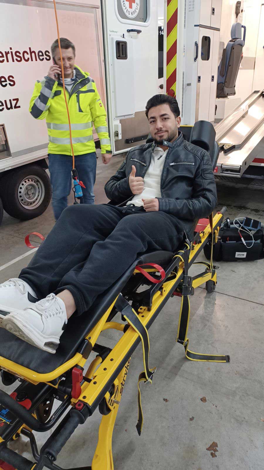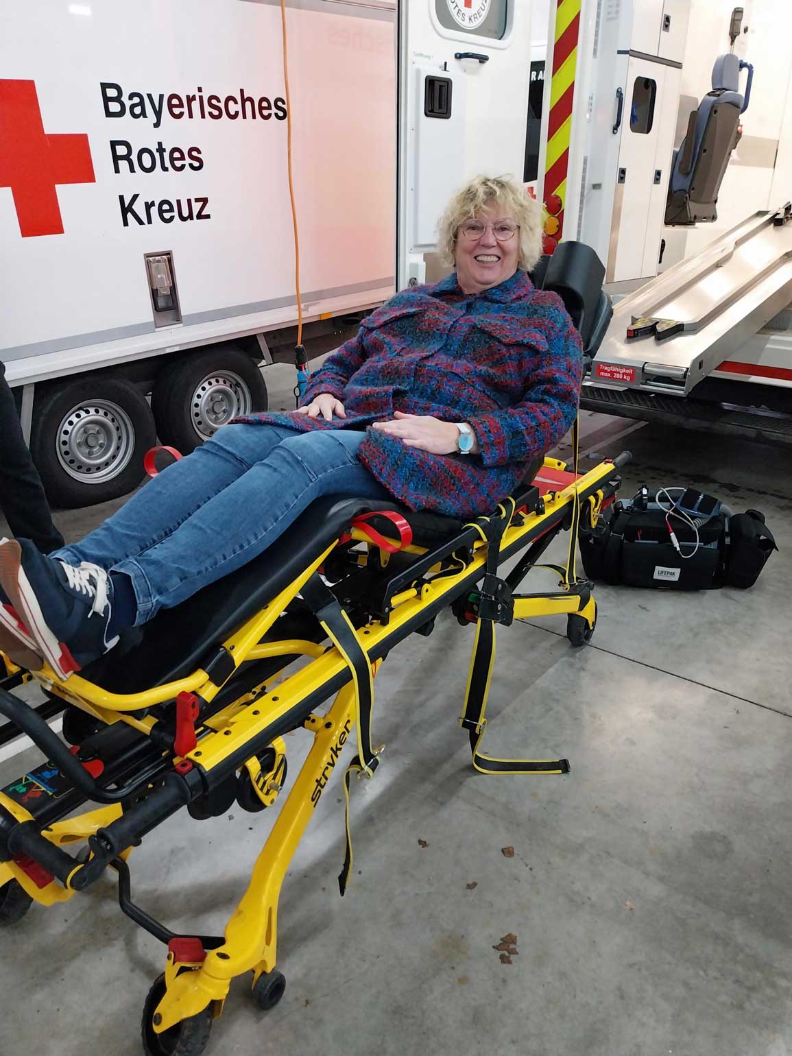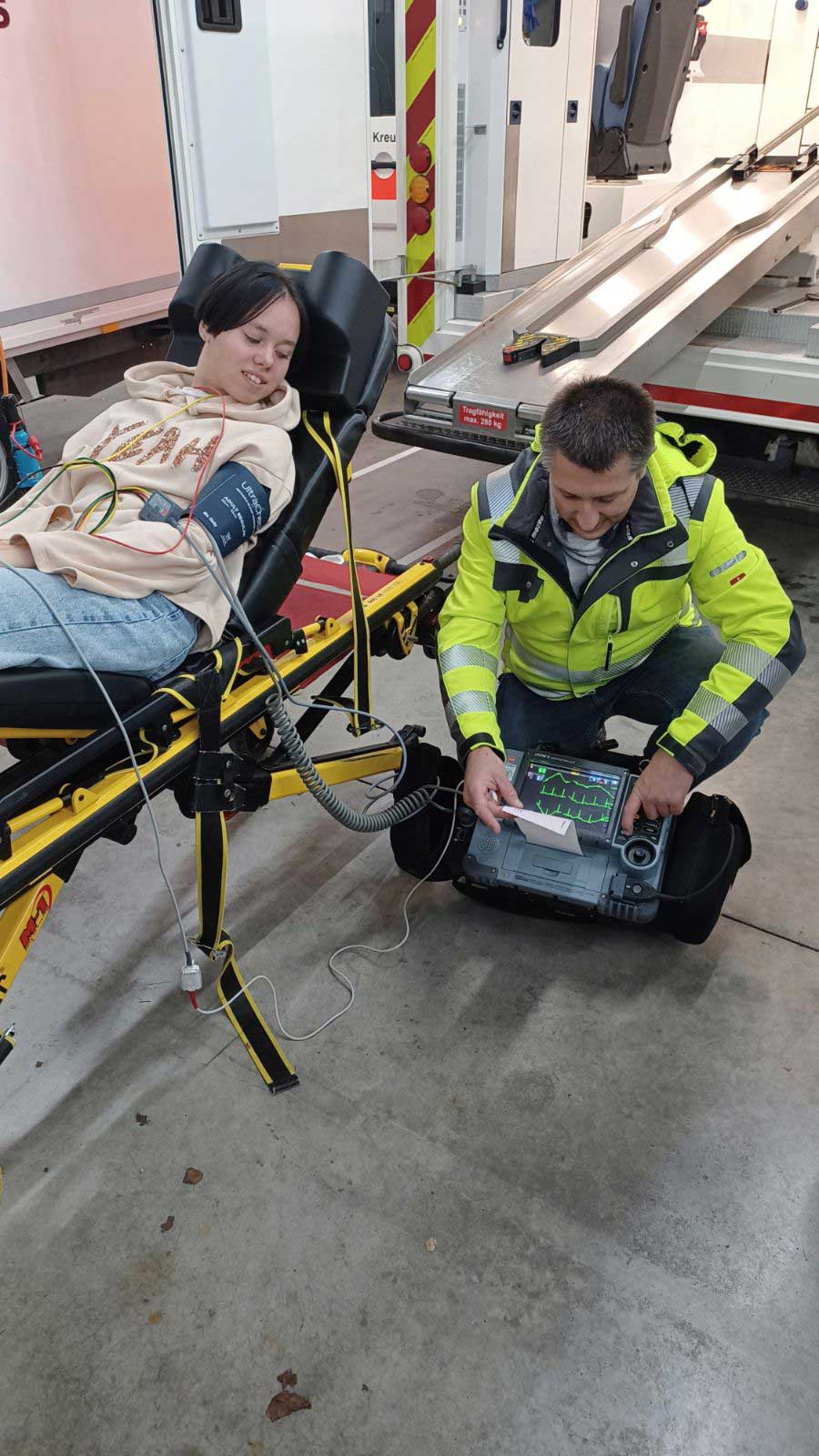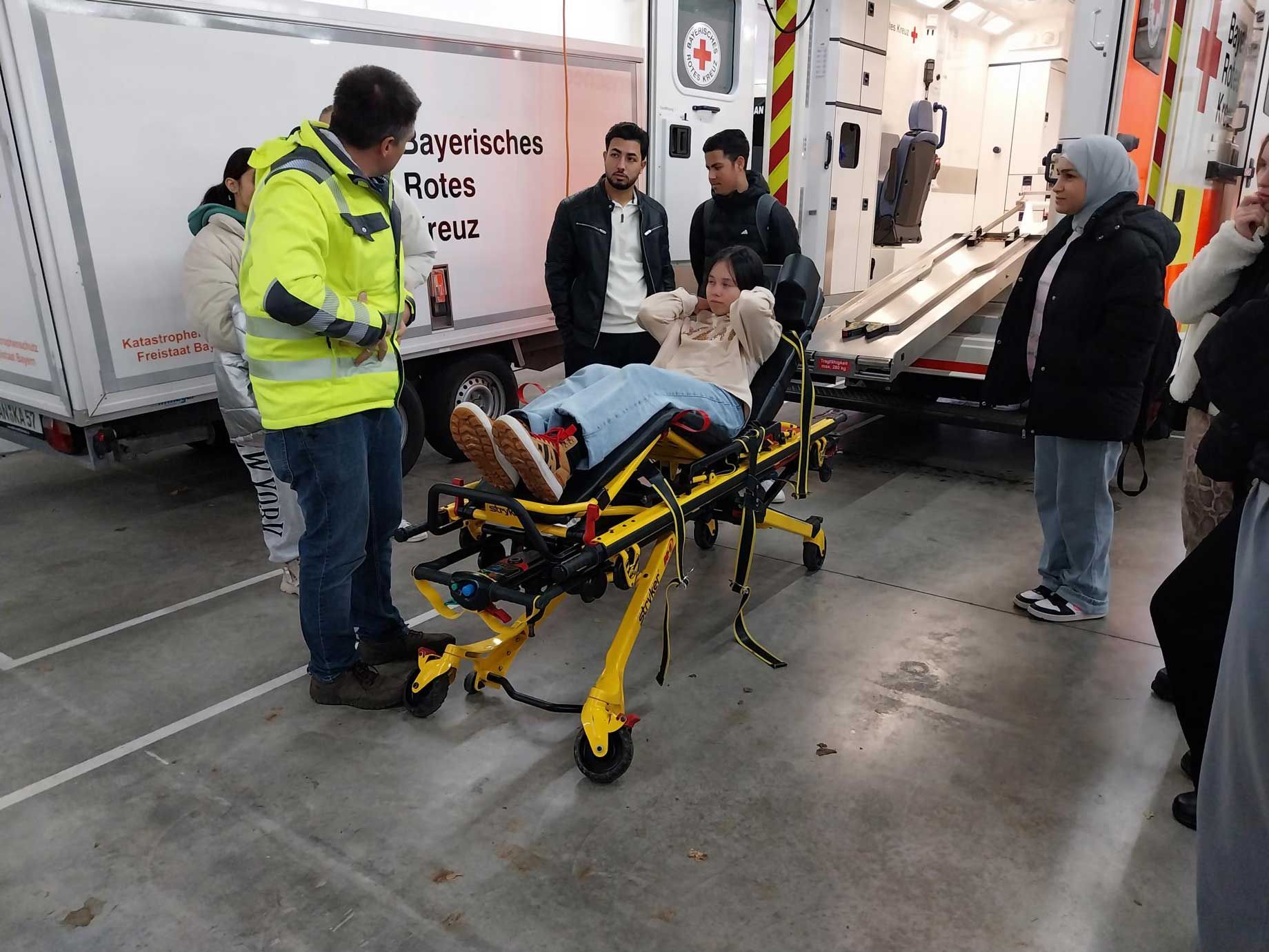 Herr Mayr zeigte der Klasse die Ausstattung eines Rettungswagens. Die Trage wurde sofort ausprobiert. Herr Mayr erklärte, wie schnell man im Notfall z. B. den Sauerstoffgehalt des Blutes und den Blutdruck messen und ein EKG schreiben kann, um den Gesundheitszustand eines Patienten einschätzen zu können. Die Schülerinnen und Schüler waren sehr interessiert und stellten viele Fragen.