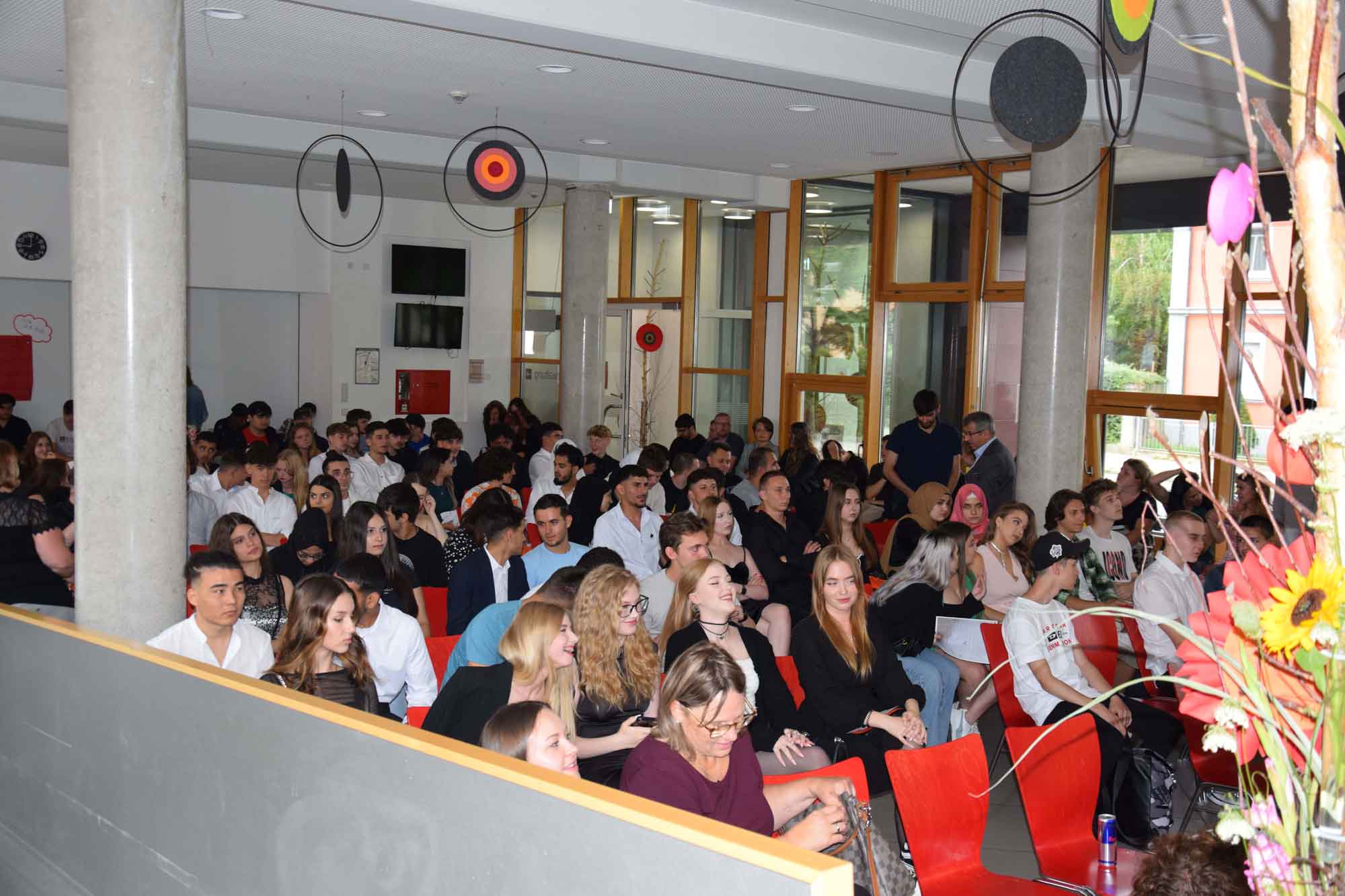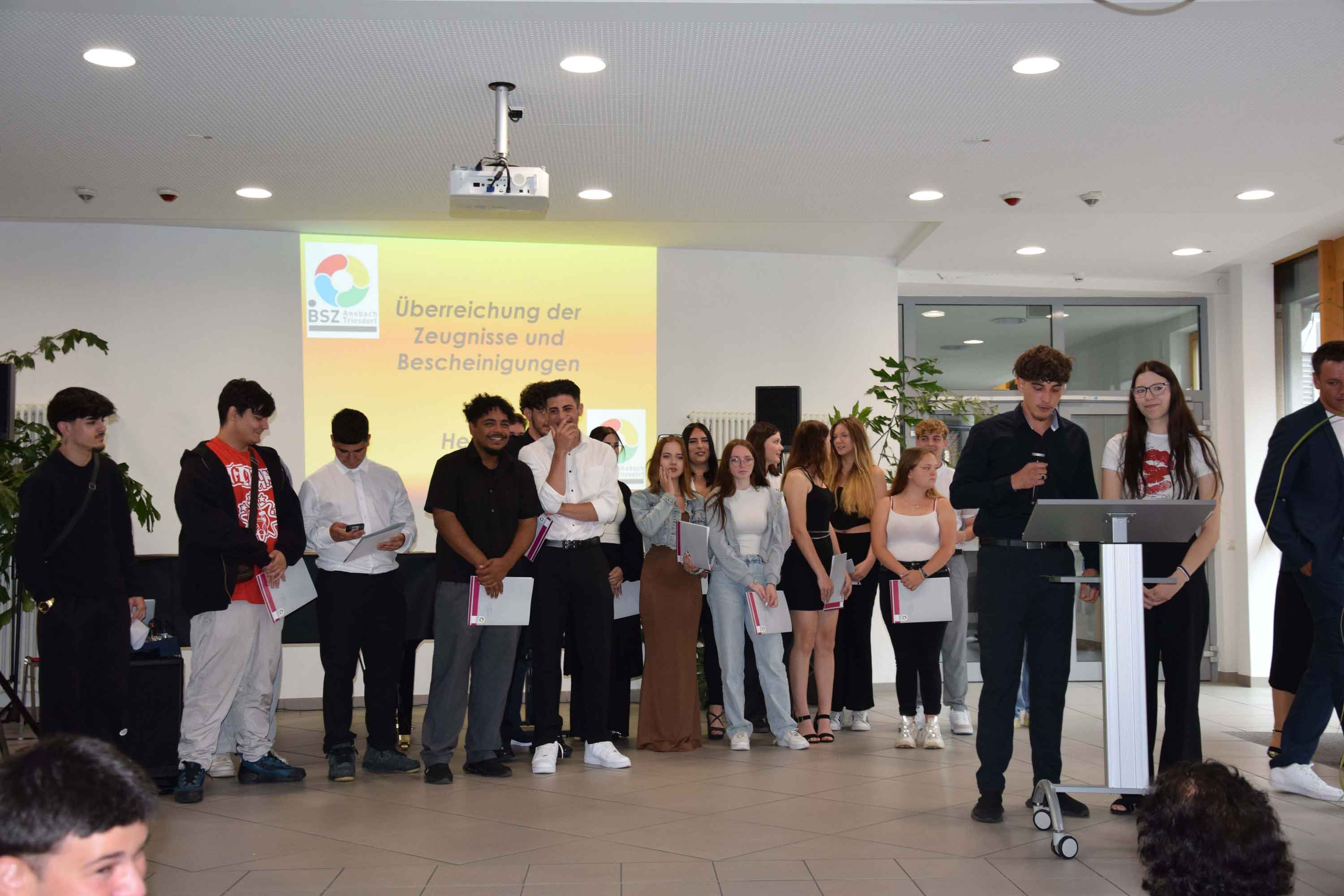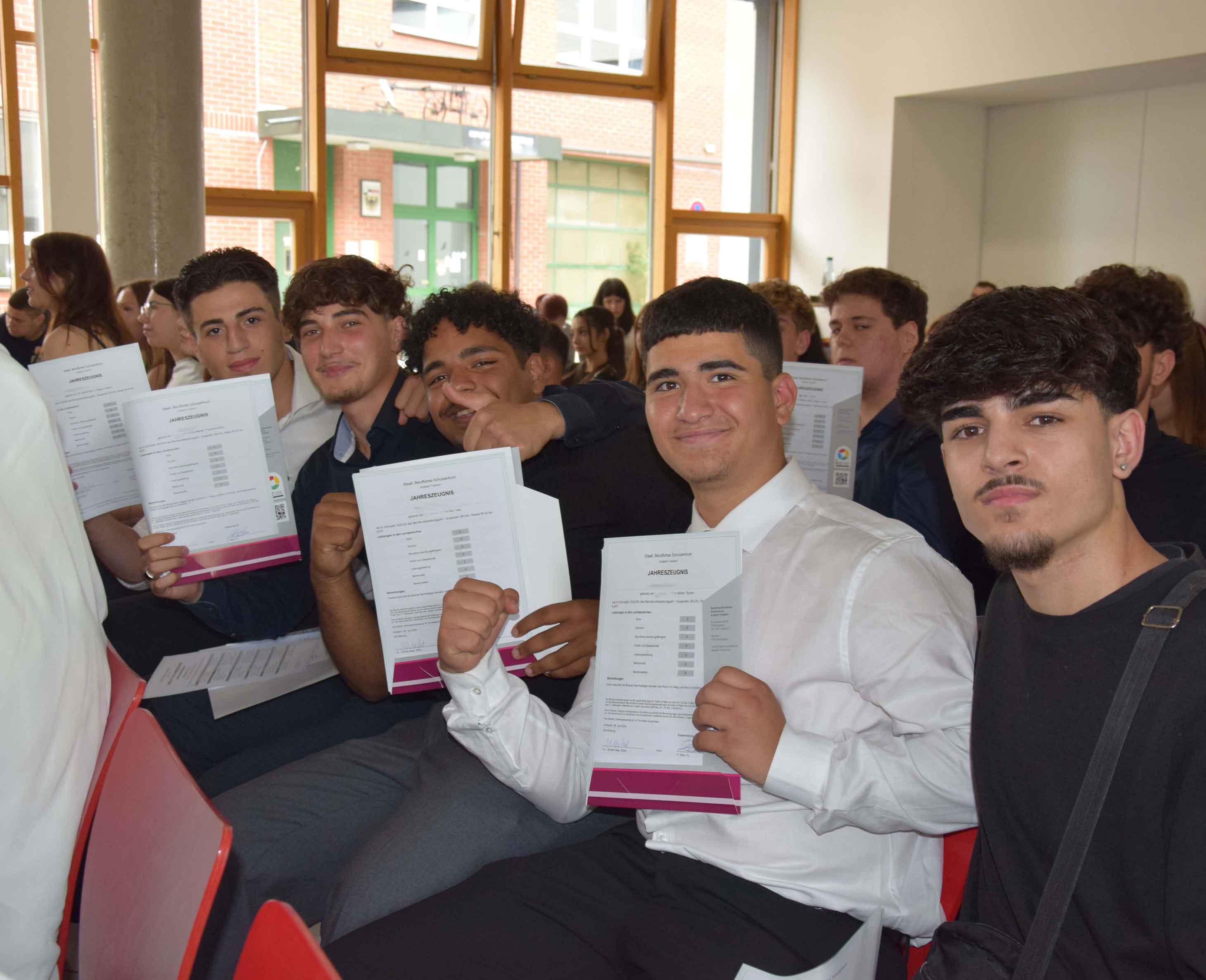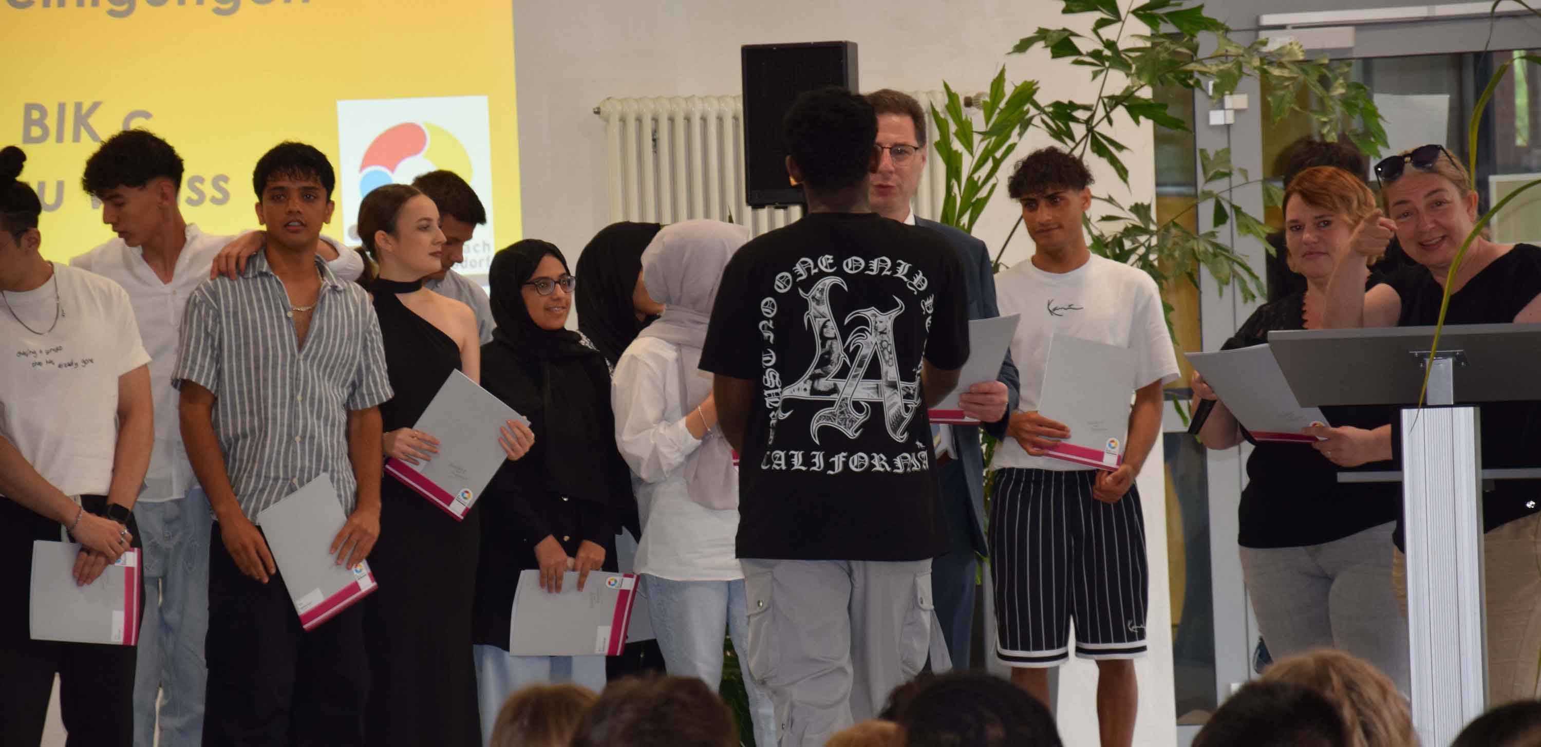 Am 24. Juli 2024 verabschiedeten wir in einer kleinen Feier unsere Absolventinnen und Absolventen der Berufsintegrationsklassen BIKa, b, c, d und der Berufsvorbereitungsjahre BVJa, b und BVJc (Neustart, gefördert durch Mittel des Europäischen Sozialfonds).