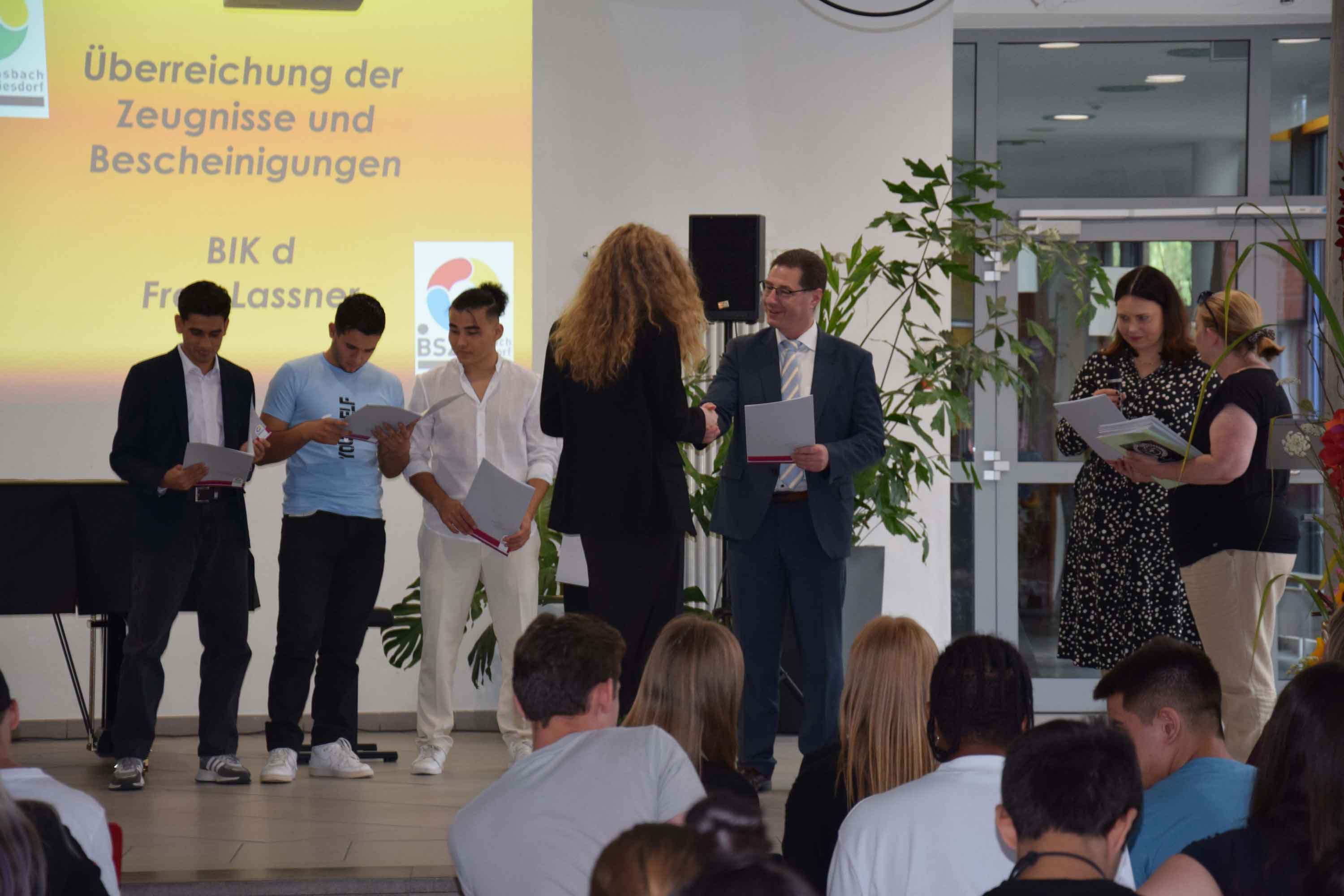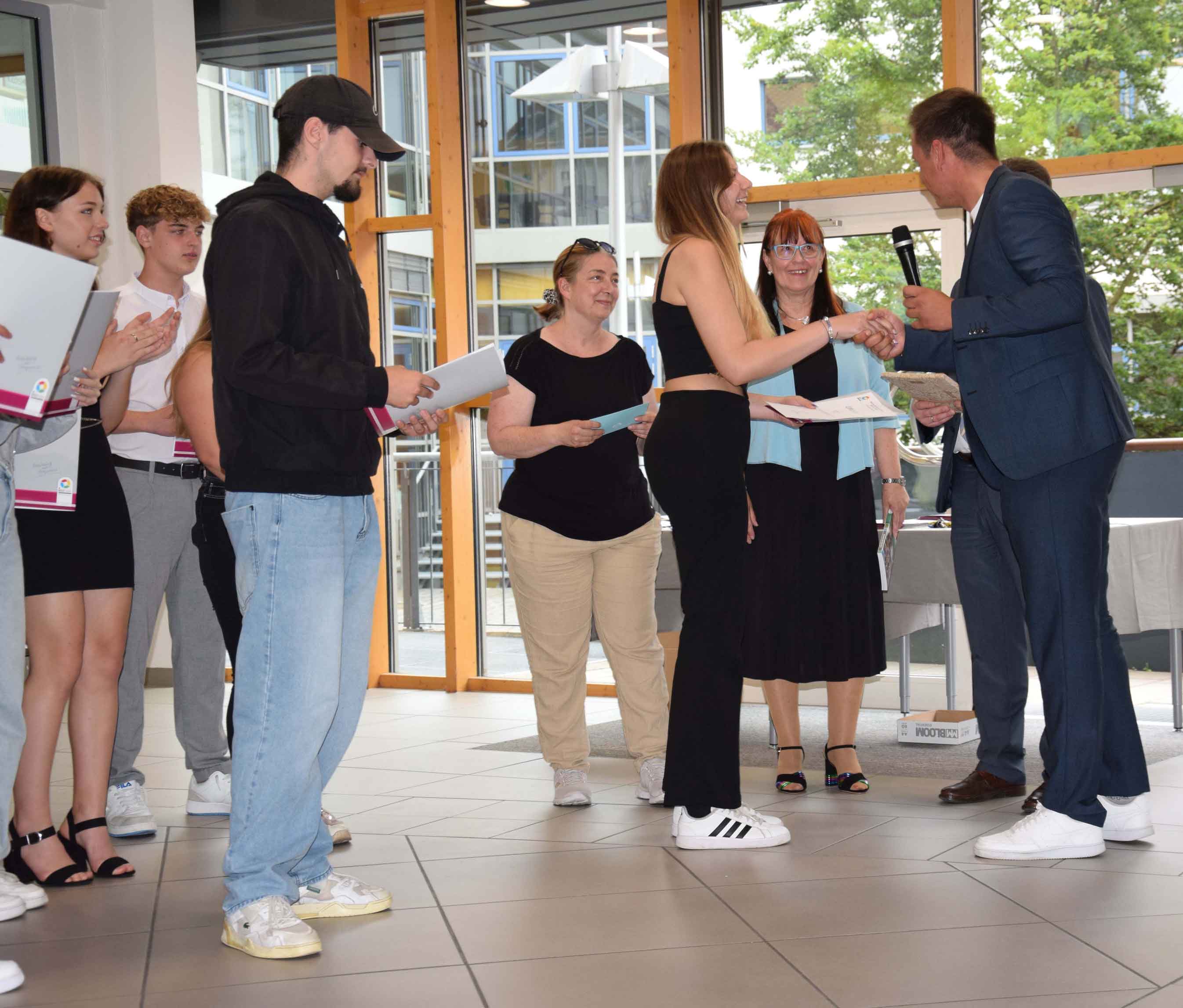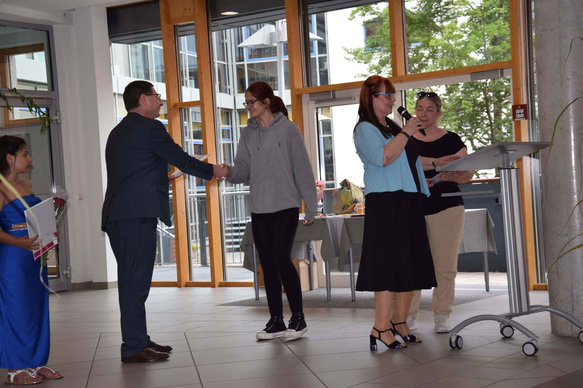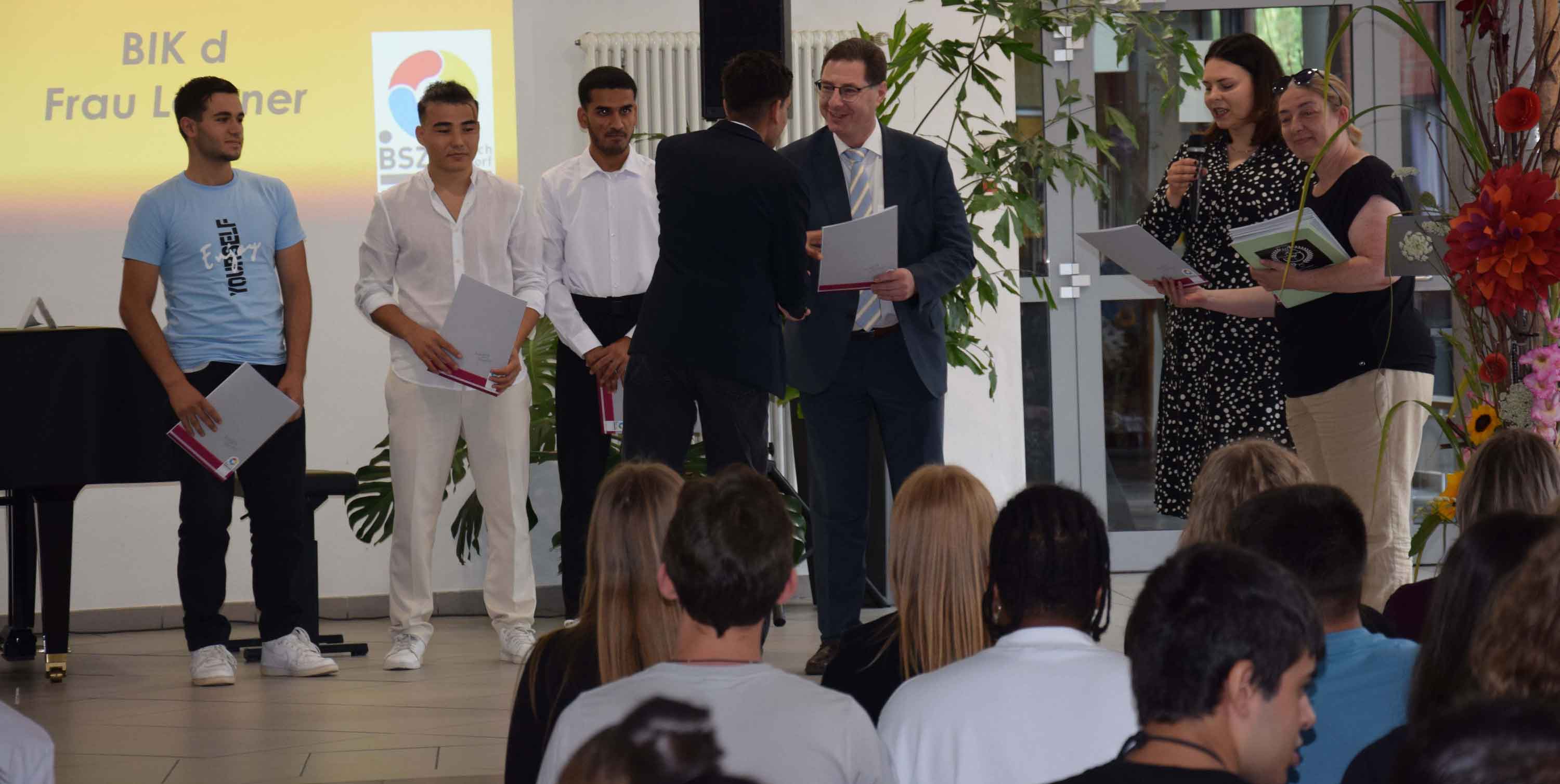 Im Rahmen der Verleihung der Zeugnisse wurden viele Schülerinnen und Schüler für ihre Leistungen geehrt. Im Frühjahr hatten die Schülerinnen und Schüler der Berufsintegrationsklassen an der DSD-I-Pro-Prüfung teilgenommen. Frau Bühler-Saal bedankte sich bei Frau Bergler und Frau Michel für die Organisation und die Vorbereitung der Klassen auf die DSD-I-Pro-Prüfung.