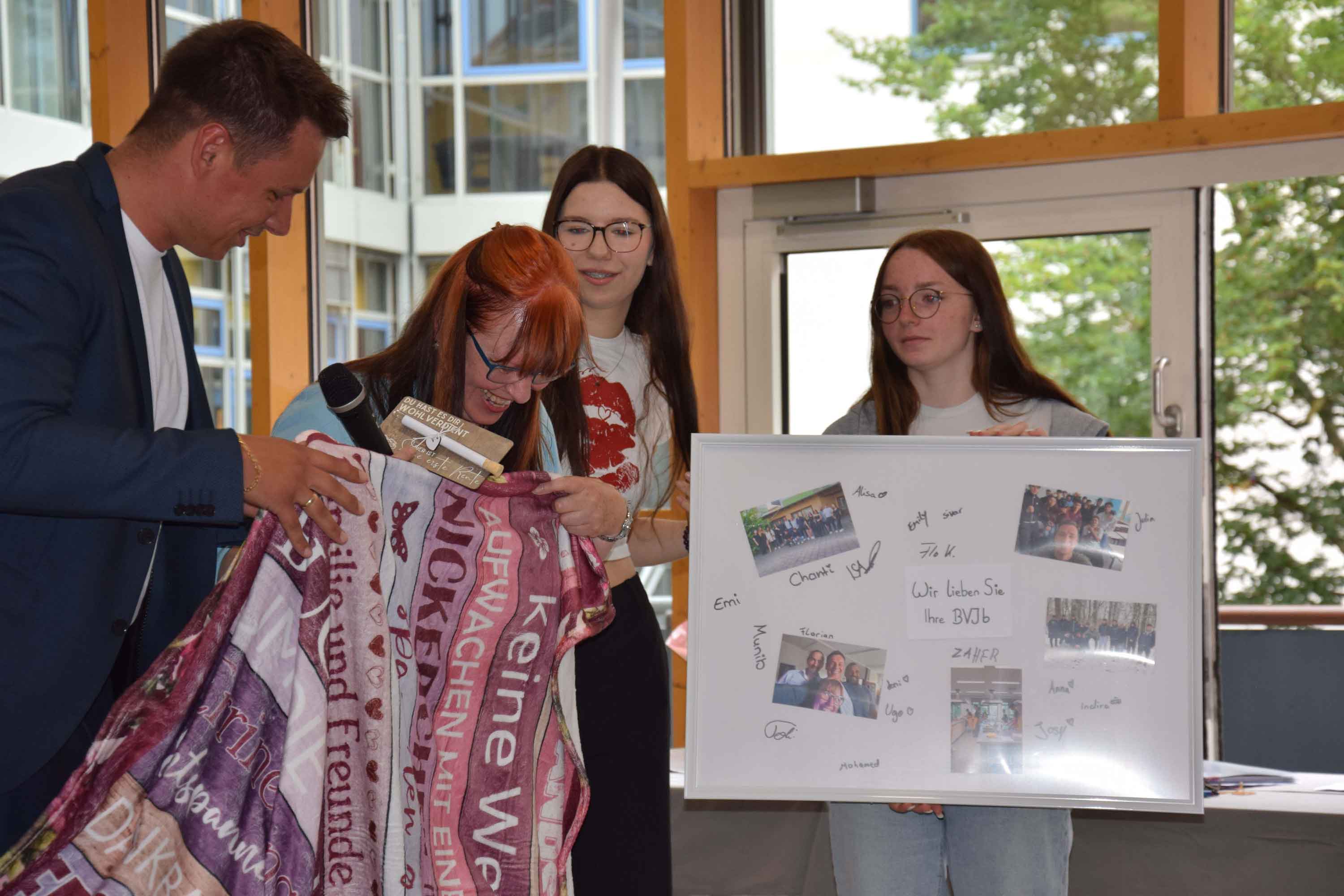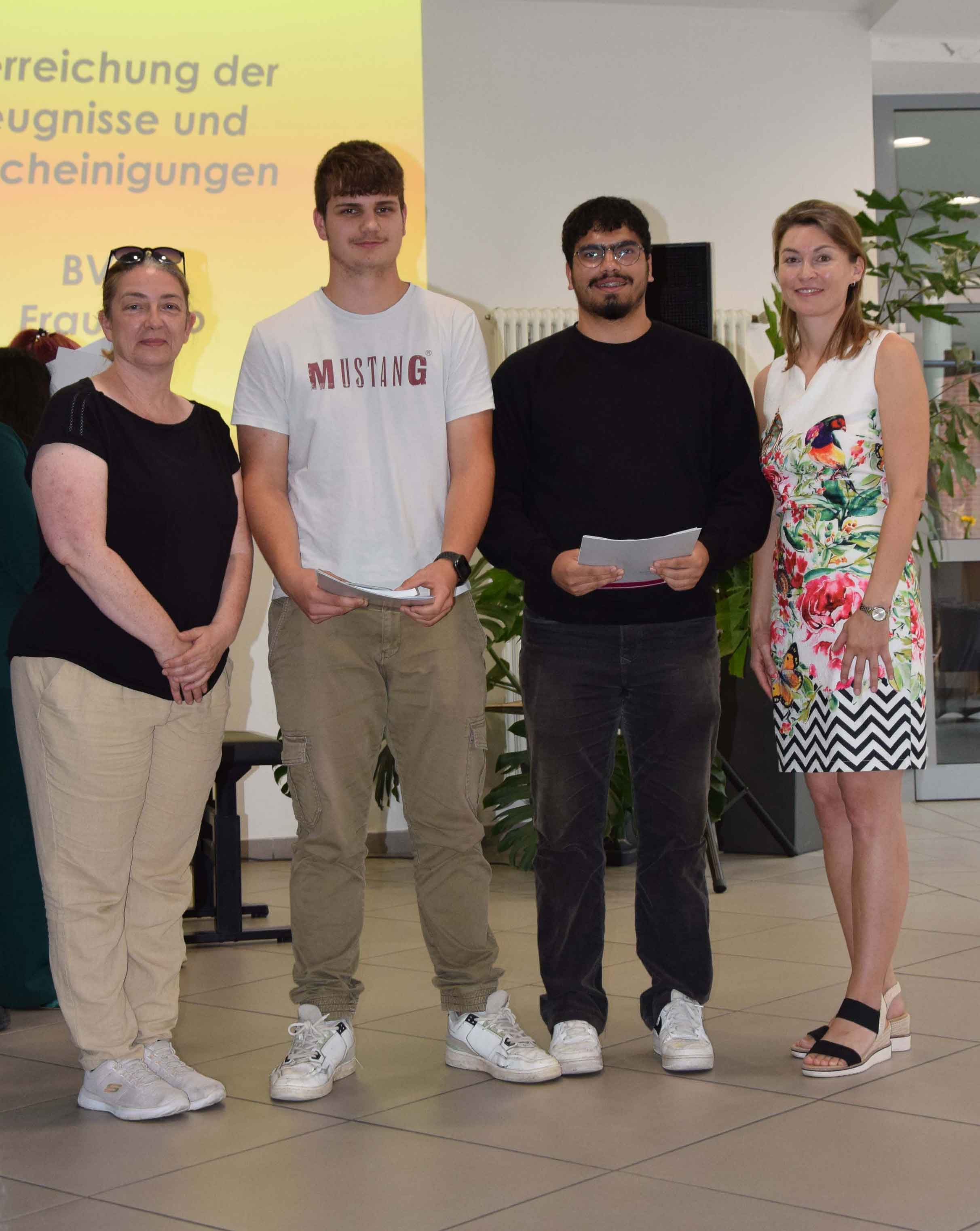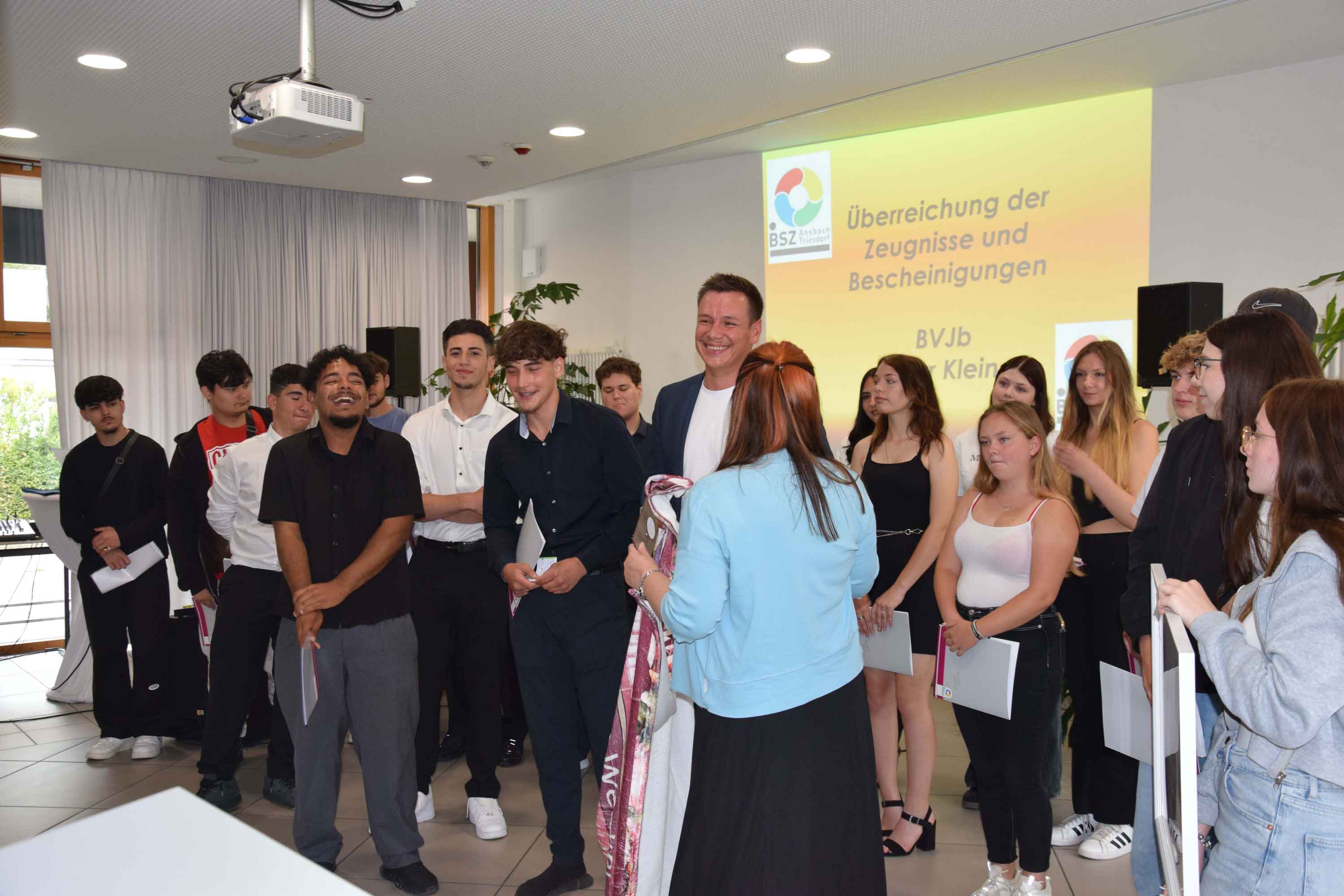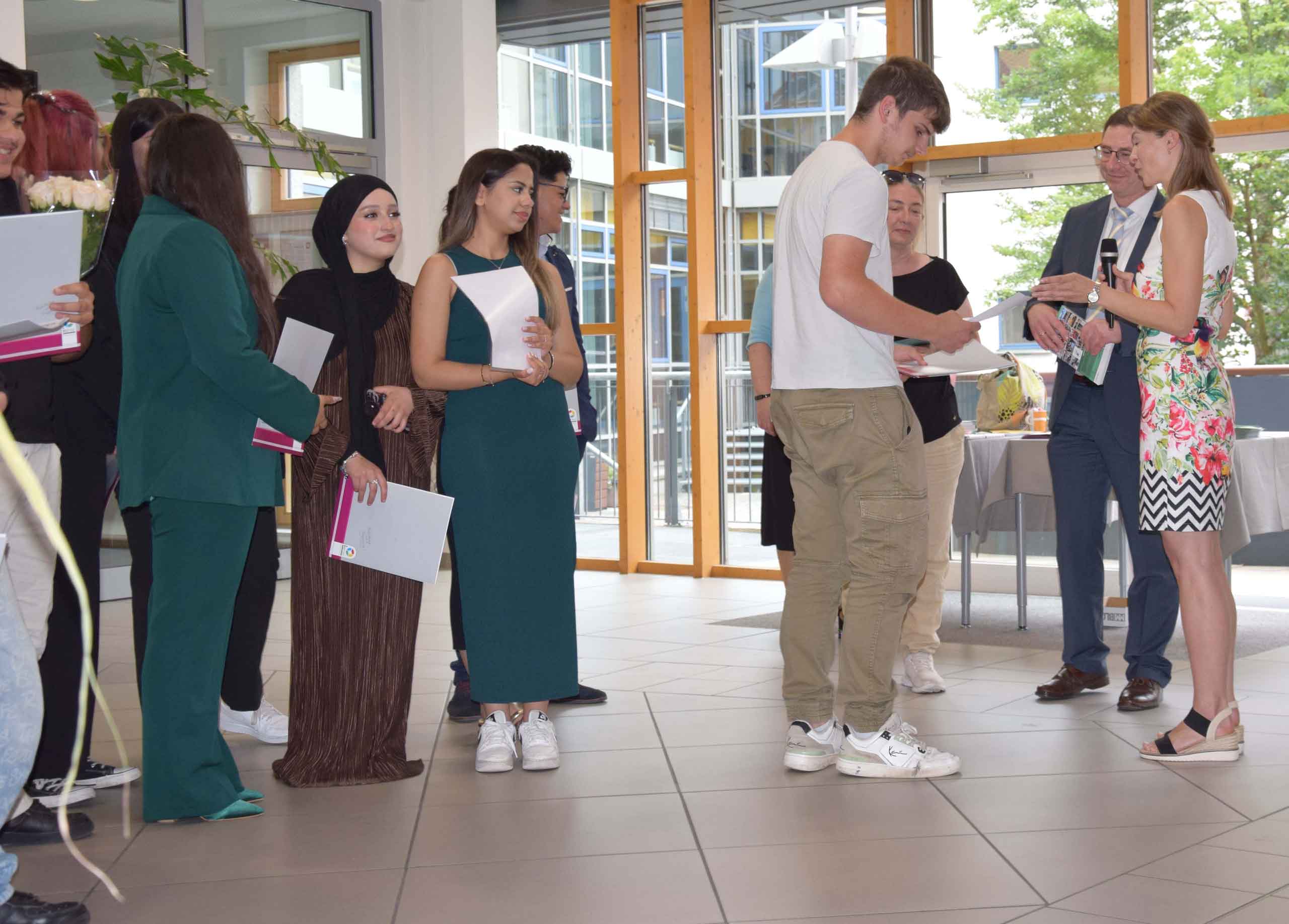 Im Rahmen der Verleihung der Zeugnisse wurden viele Schülerinnen und Schüler für ihre Leistungen geehrt. Im Frühjahr hatten die Schülerinnen und Schüler der Berufsintegrationsklassen an der DSD-I-Pro-Prüfung teilgenommen. Frau Bühler-Saal bedankte sich bei Frau Bergler und Frau Michel für die Organisation und die Vorbereitung der Klassen auf die DSD-I-Pro-Prüfung.