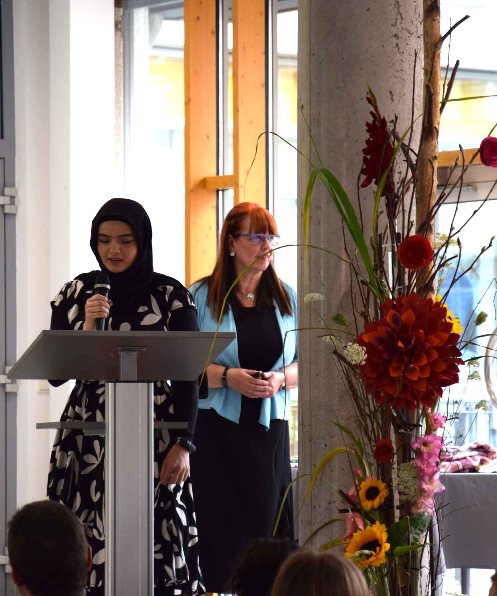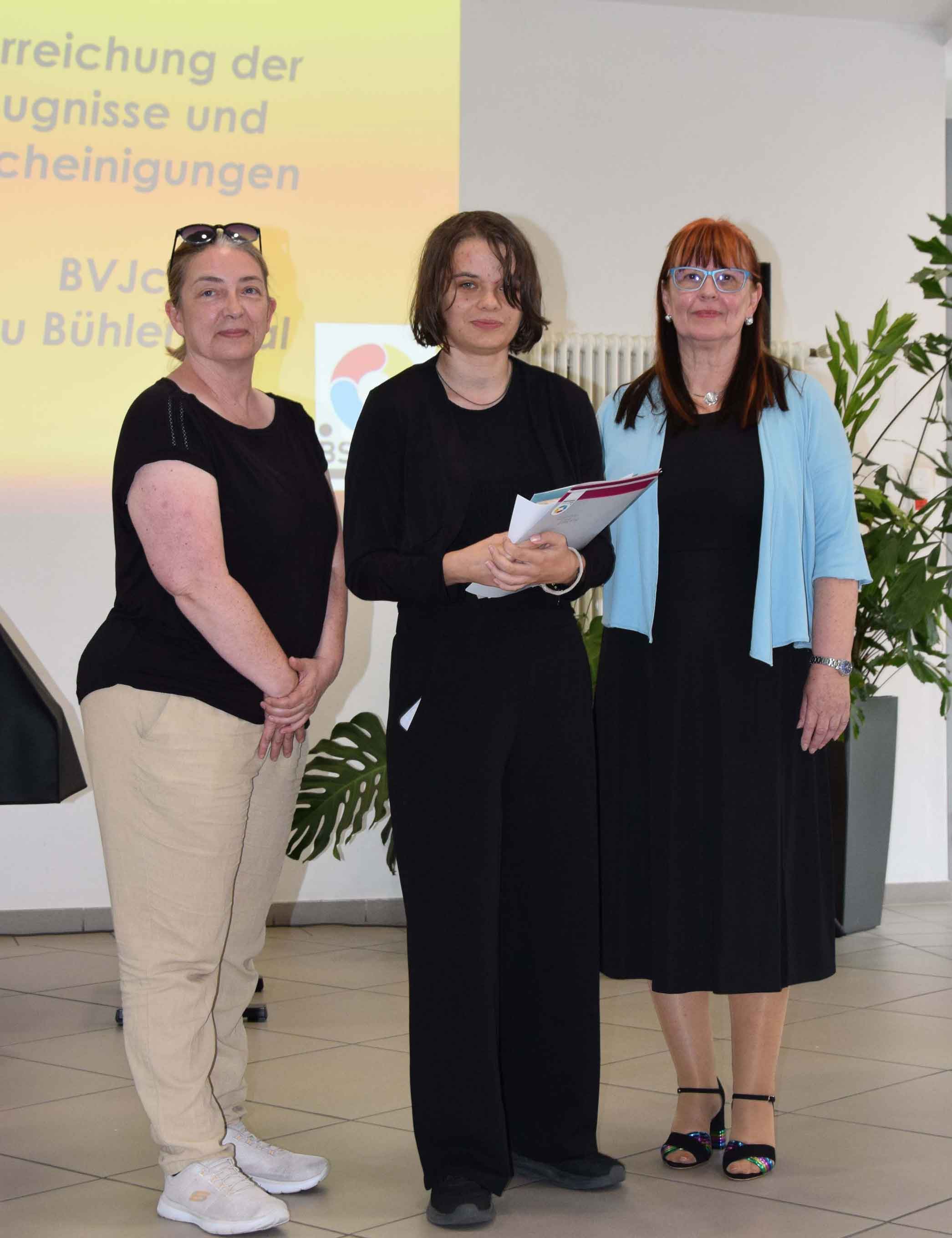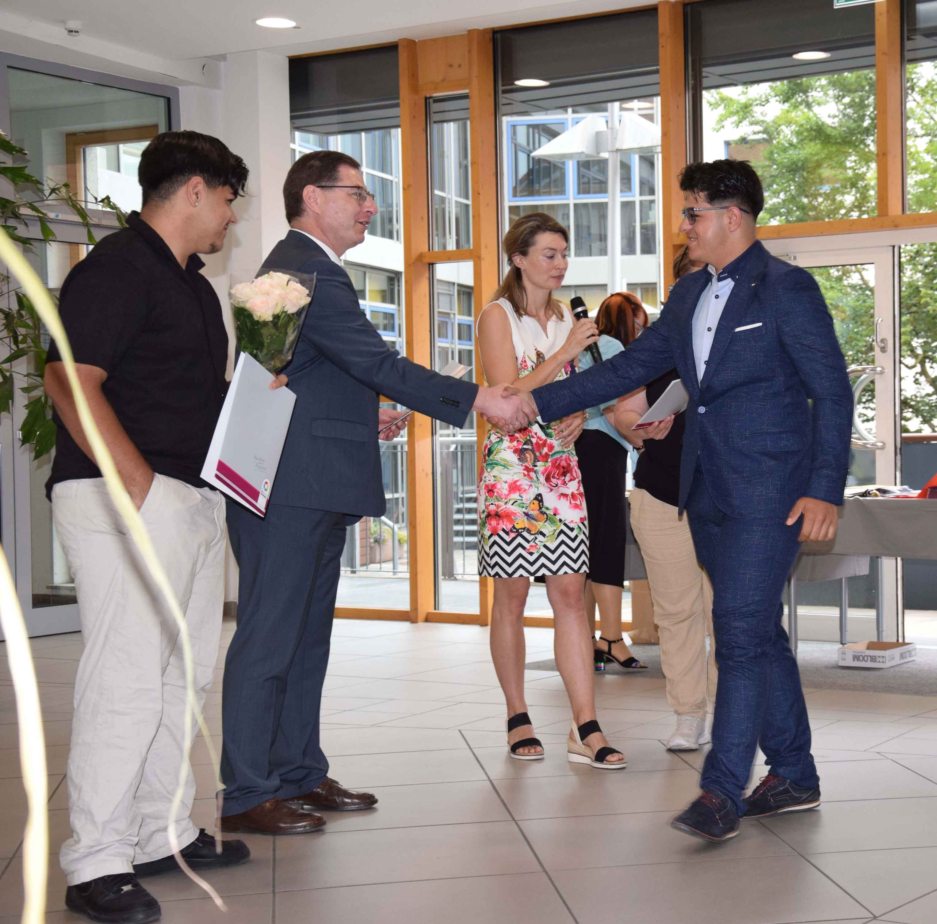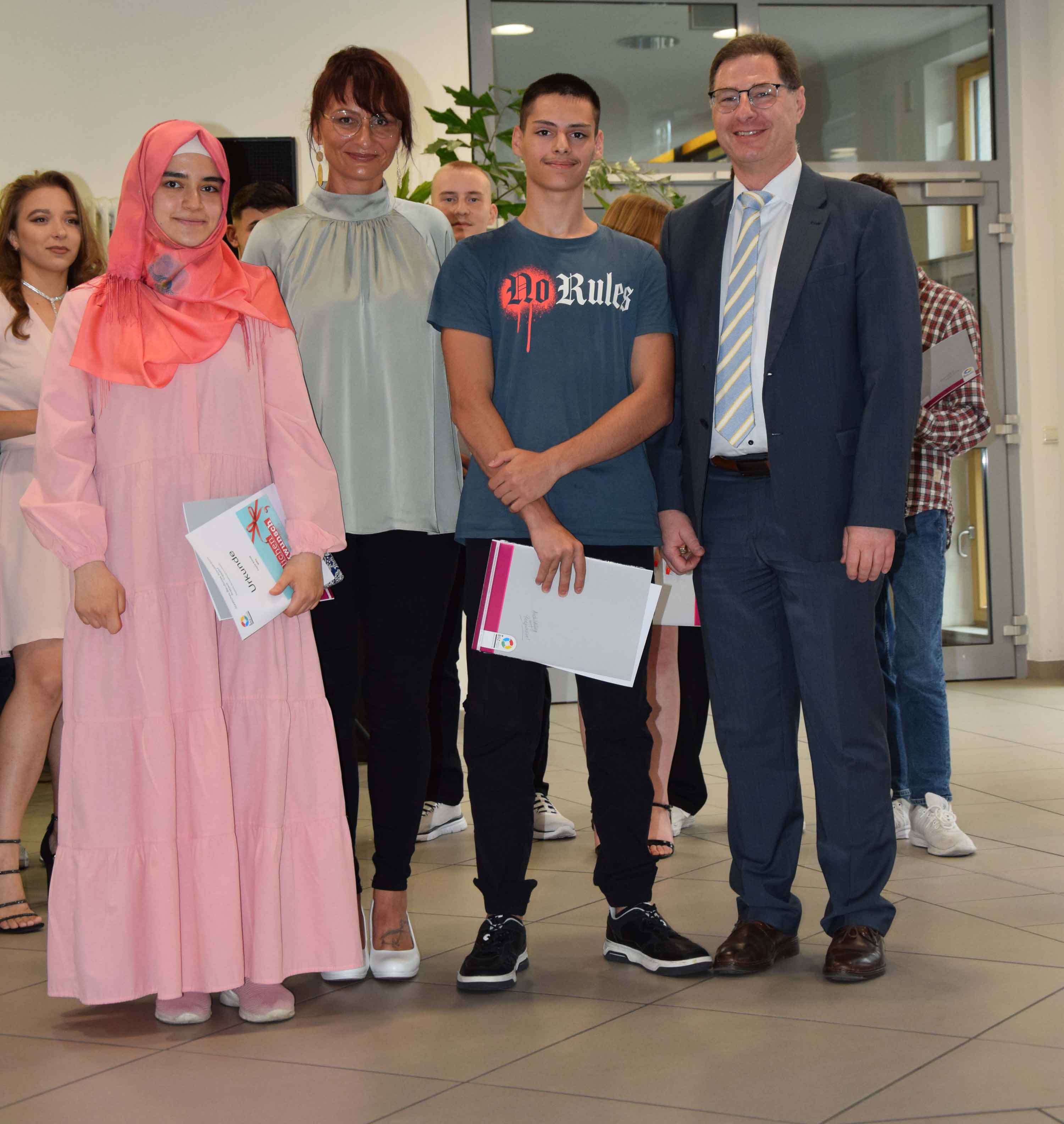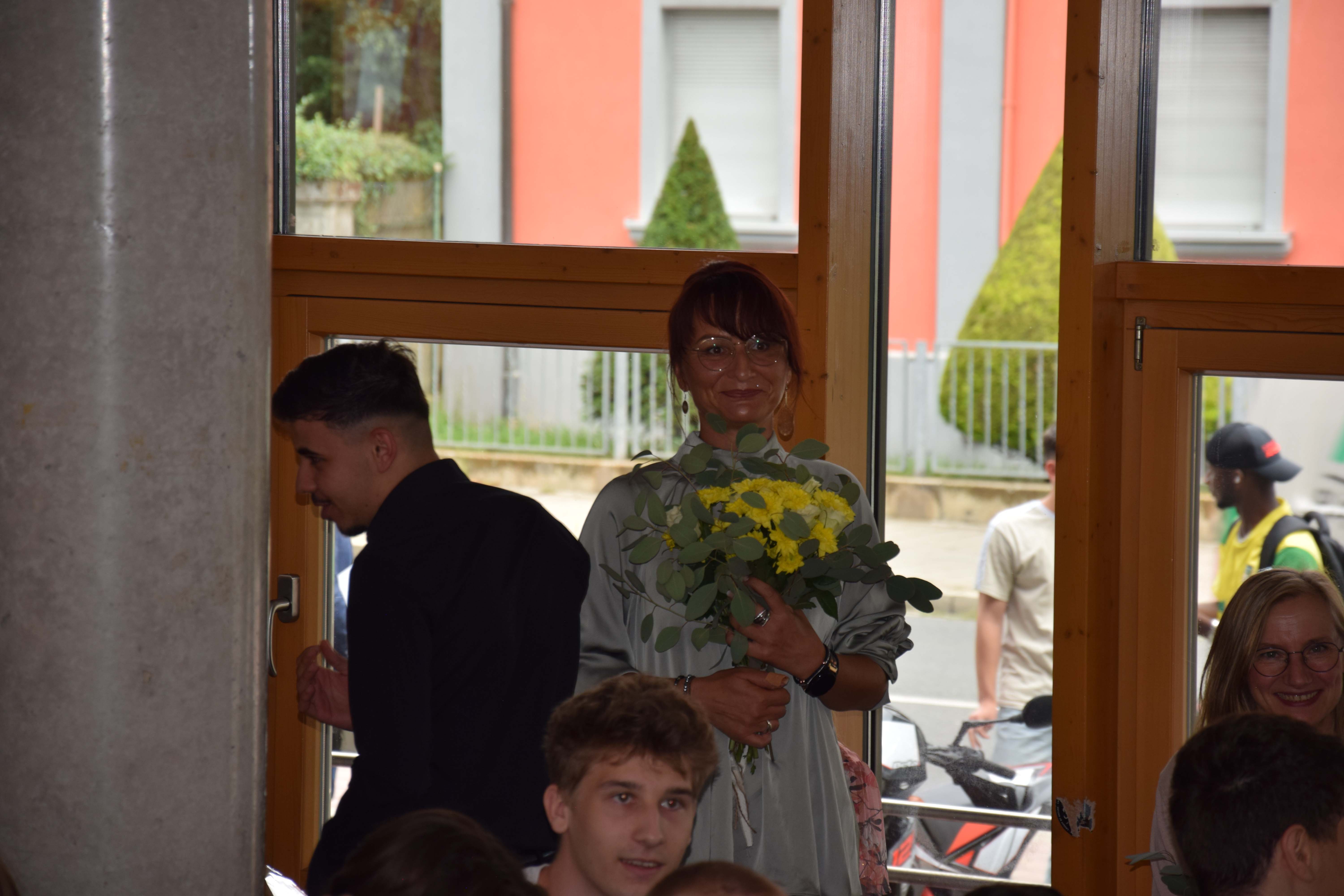 Im Rahmen der Verleihung der Zeugnisse wurden viele Schülerinnen und Schüler für ihre Leistungen geehrt. Im Frühjahr hatten die Schülerinnen und Schüler der Berufsintegrationsklassen an der DSD-I-Pro-Prüfung teilgenommen. Frau Bühler-Saal bedankte sich bei Frau Bergler und Frau Michel für die Organisation und die Vorbereitung der Klassen auf die DSD-I-Pro-Prüfung.