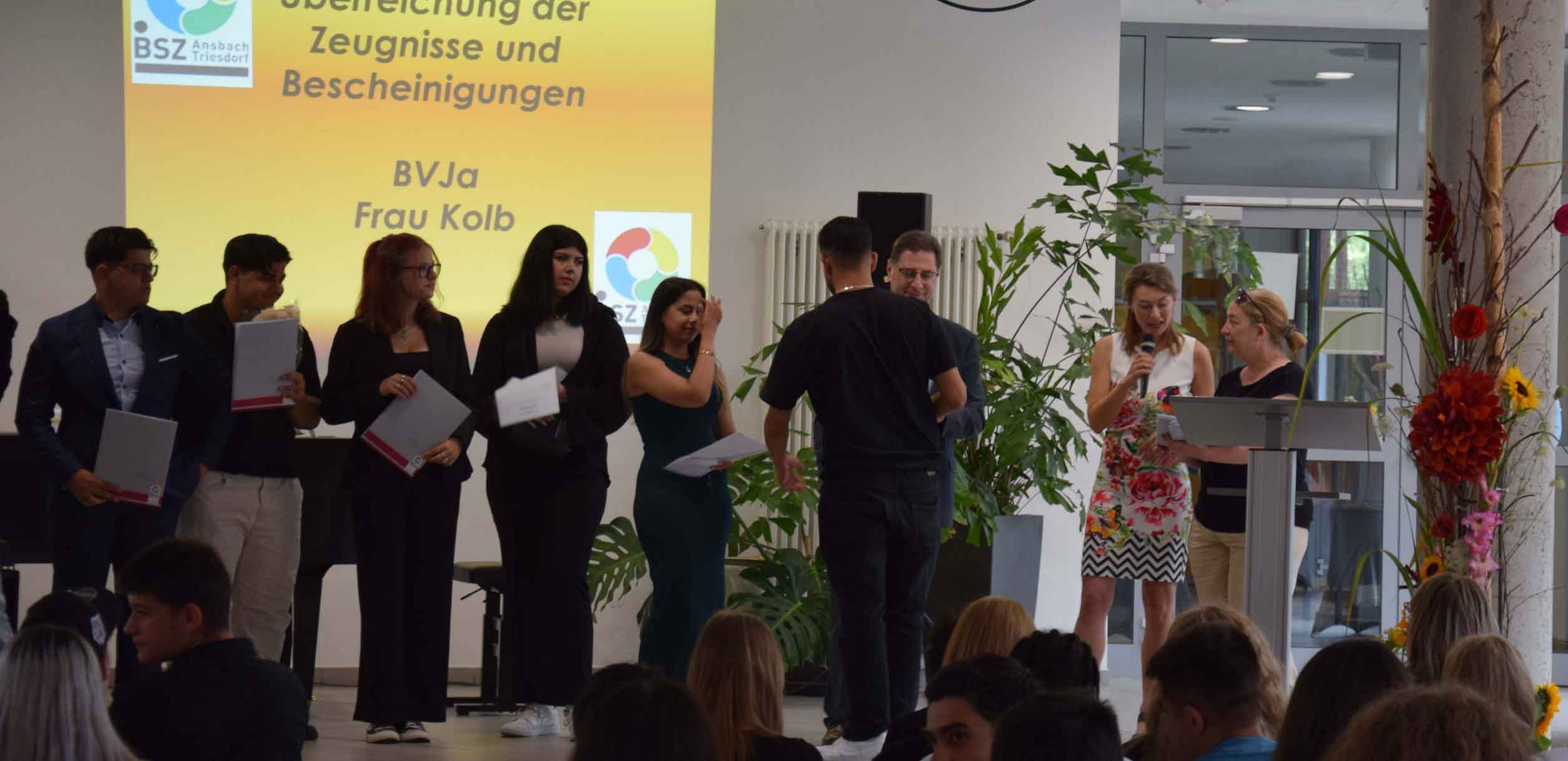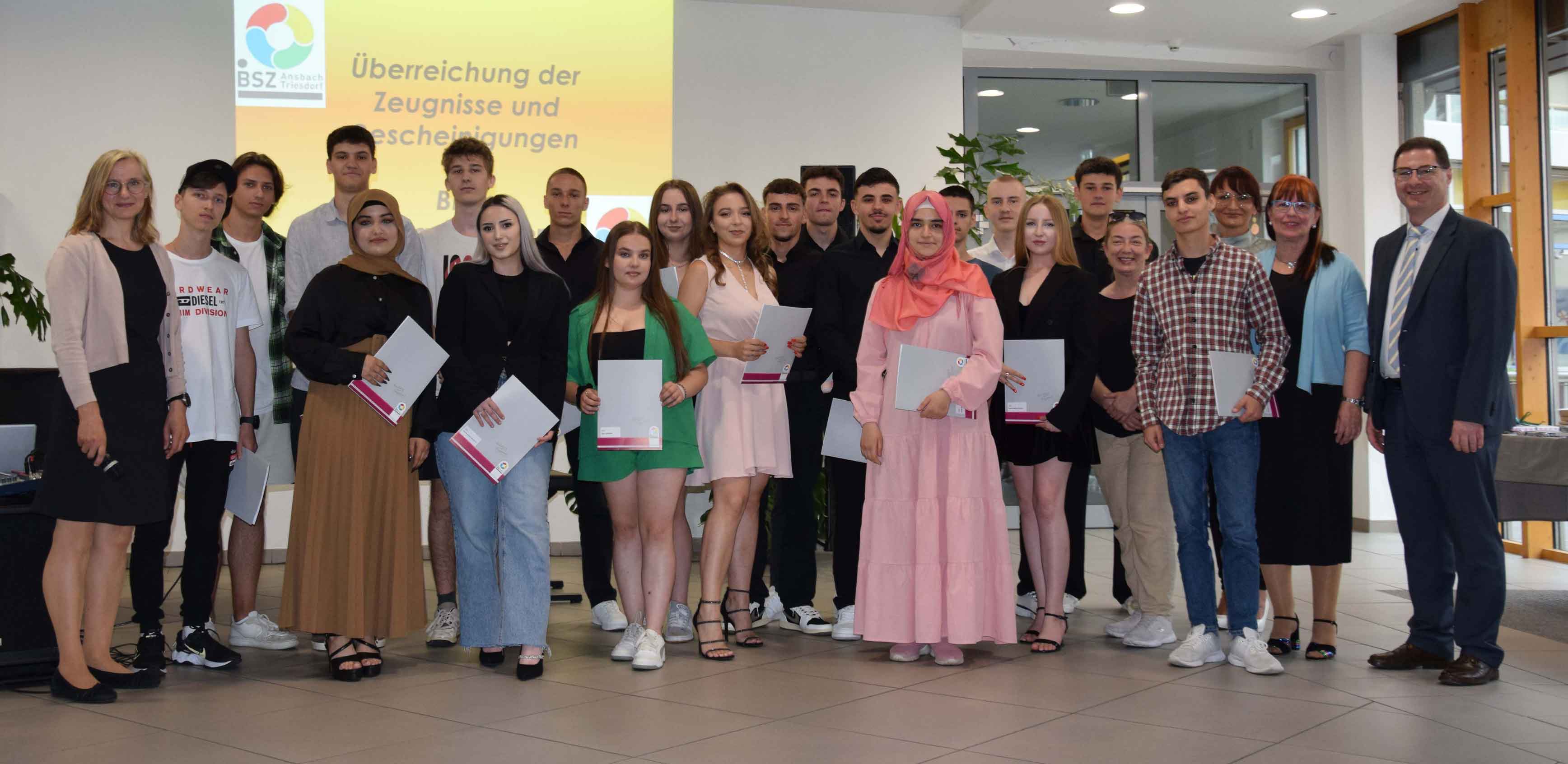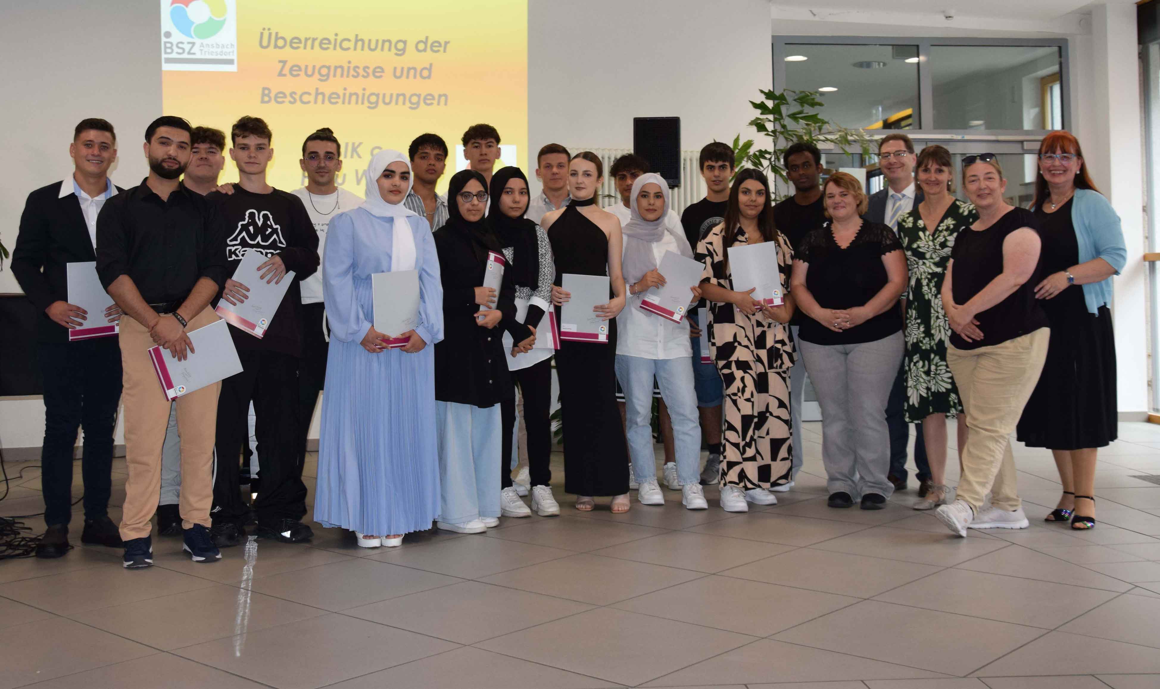 Am 24. Juli 2024 verabschiedeten wir in einer kleinen Feier unsere Absolventinnen und Absolventen der Berufsintegrationsklassen BIKa, b, c, d und der Berufsvorbereitungsjahre BVJa, b und BVJc (Neustart, gefördert durch Mittel des Europäischen Sozialfonds). Als Ehrengäste konnten wir Frau Mikusch und Frau Sterz (Bundesagentur für Arbeit), Frau Savchenko (Integrationsbeauftragte der Stadt Ansbach) und Frau Tschebanu (Integrationslotsin der Stadt Ansbach) begrüßen.