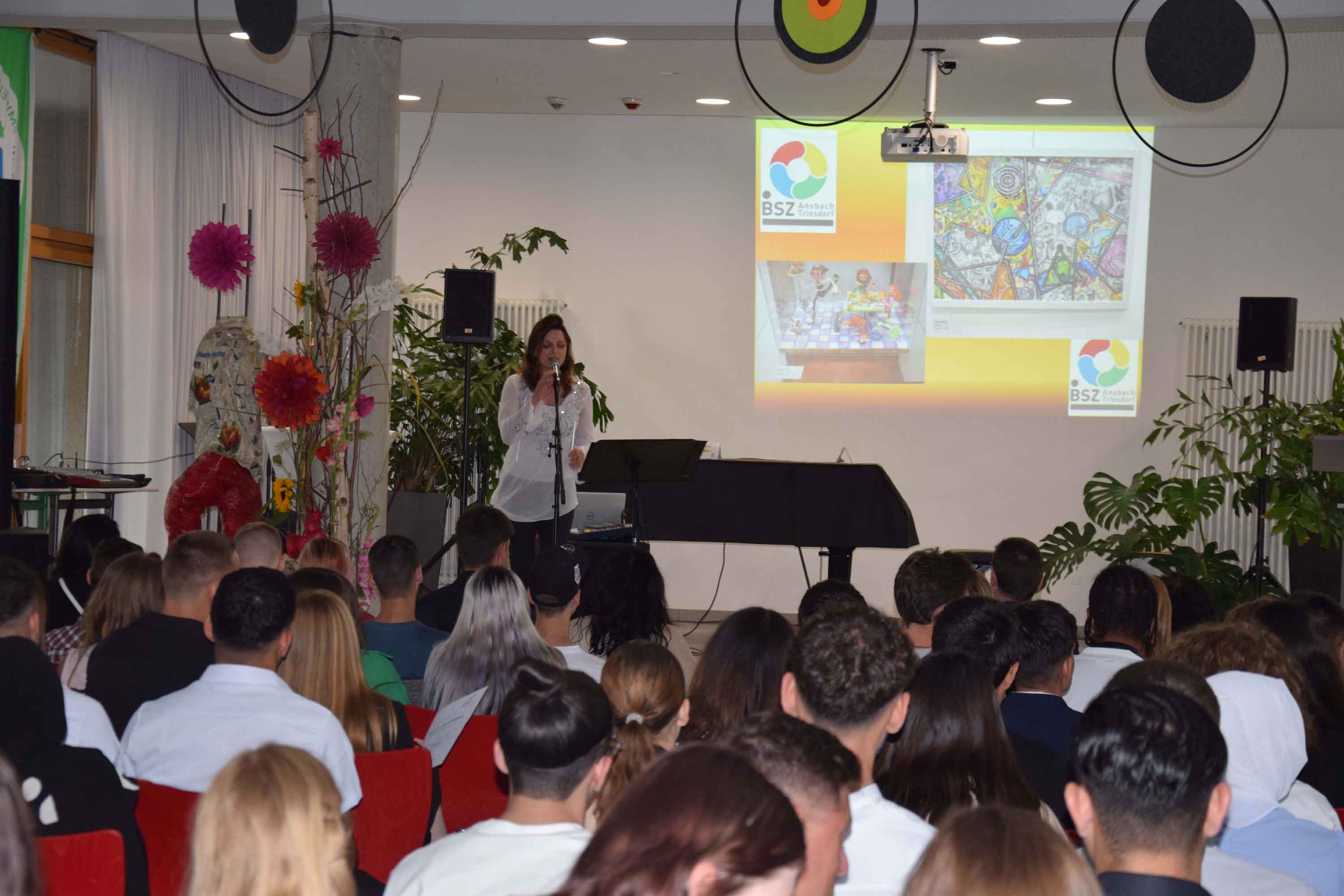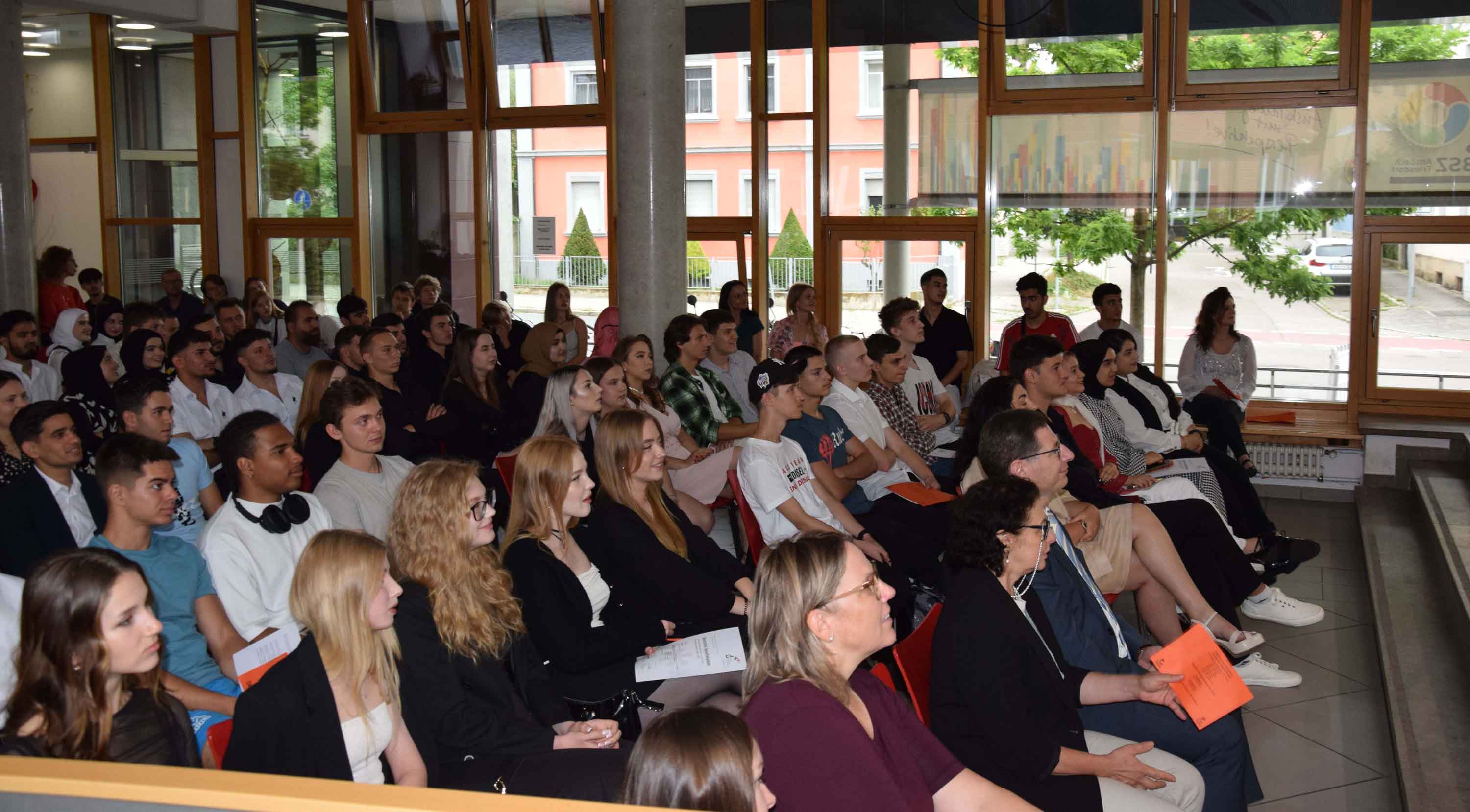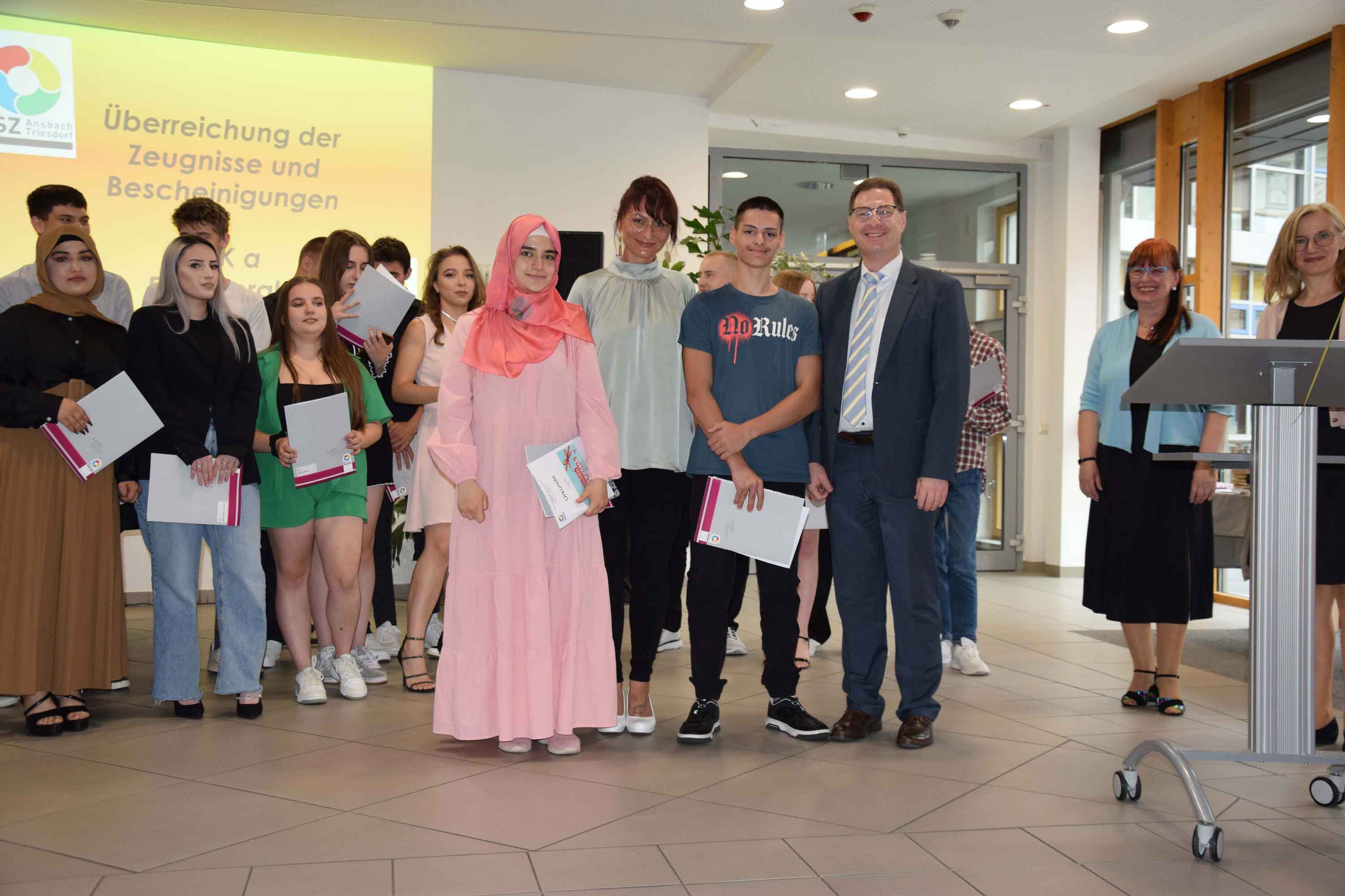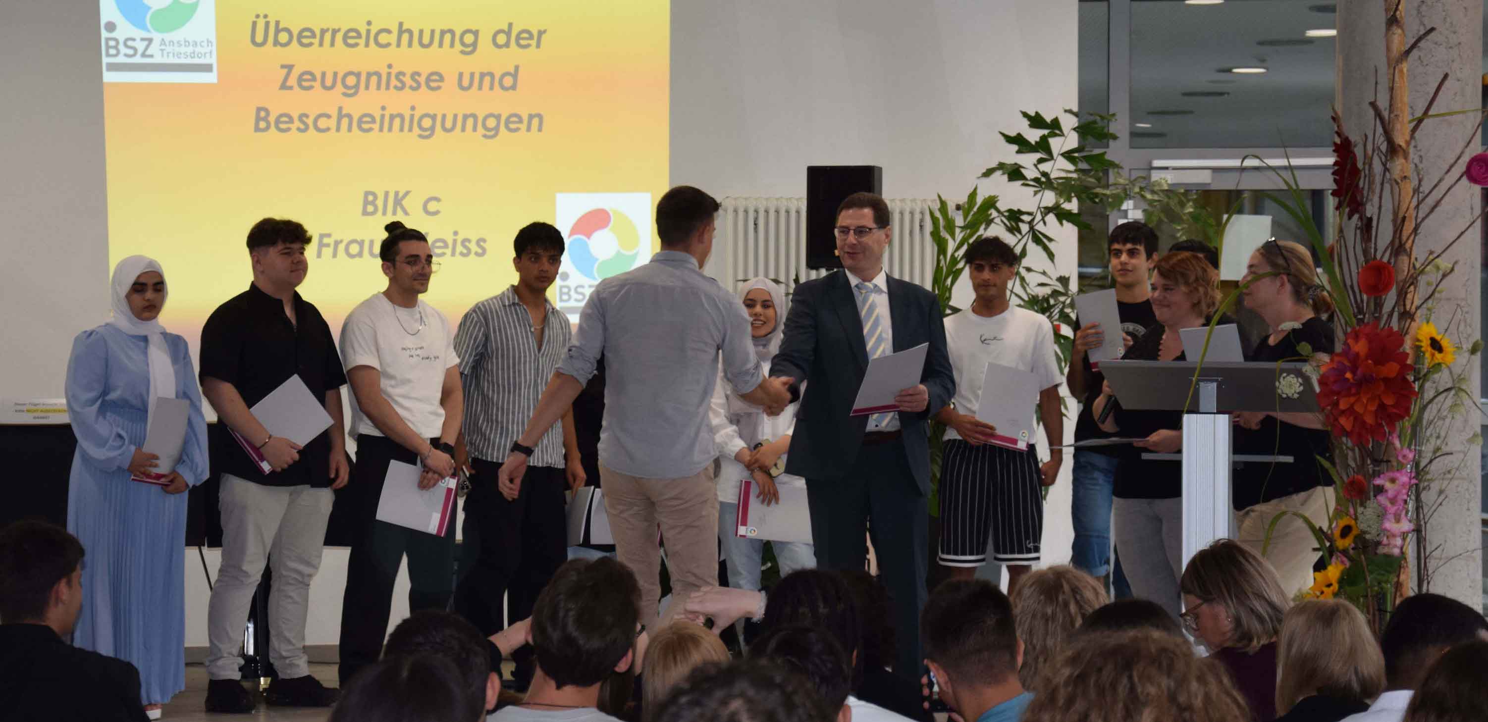 Am 24. Juli 2024 verabschiedeten wir in einer kleinen Feier unsere Absolventinnen und Absolventen der Berufsintegrationsklassen BIKa, b, c, d und der Berufsvorbereitungsjahre BVJa, b und BVJc (Neustart, gefördert durch Mittel des Europäischen Sozialfonds). Als Ehrengäste konnten wir Frau Mikusch und Frau Sterz (Bundesagentur für Arbeit), Frau Savchenko (Integrationsbeauftragte der Stadt Ansbach) und Frau Tschebanu (Integrationslotsin der Stadt Ansbach) begrüßen.