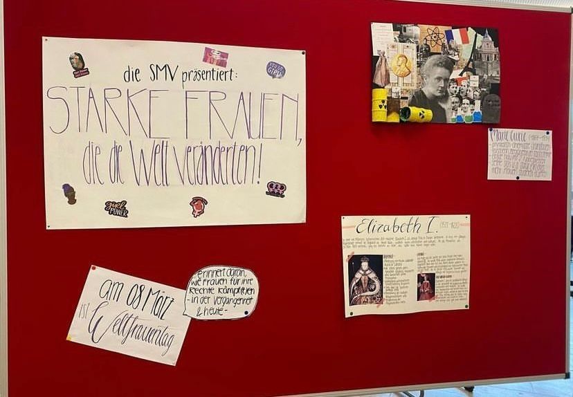 Wir setzten uns auch aktiv für wichtige Anliegen ein. Zum Weltfrauentag gestalteten wir Plakate über bemerkenswerte Frauen, die die Welt mit ihrem Wirken verändert haben. In der Aula stellten wir stolz diese inspirierenden Porträts aus und erinnerten uns daran, wie wichtig es ist, für Gleichberechtig einzutreten. Ein weiteres Thema, dem wir uns widmeten, war die Enttabuisierung der Menstruation. Wir erstellten informative Texte für die Mädchentoiletten, um Aufklärung und Verständnis zu fördern und Vorurteile abzubauen.