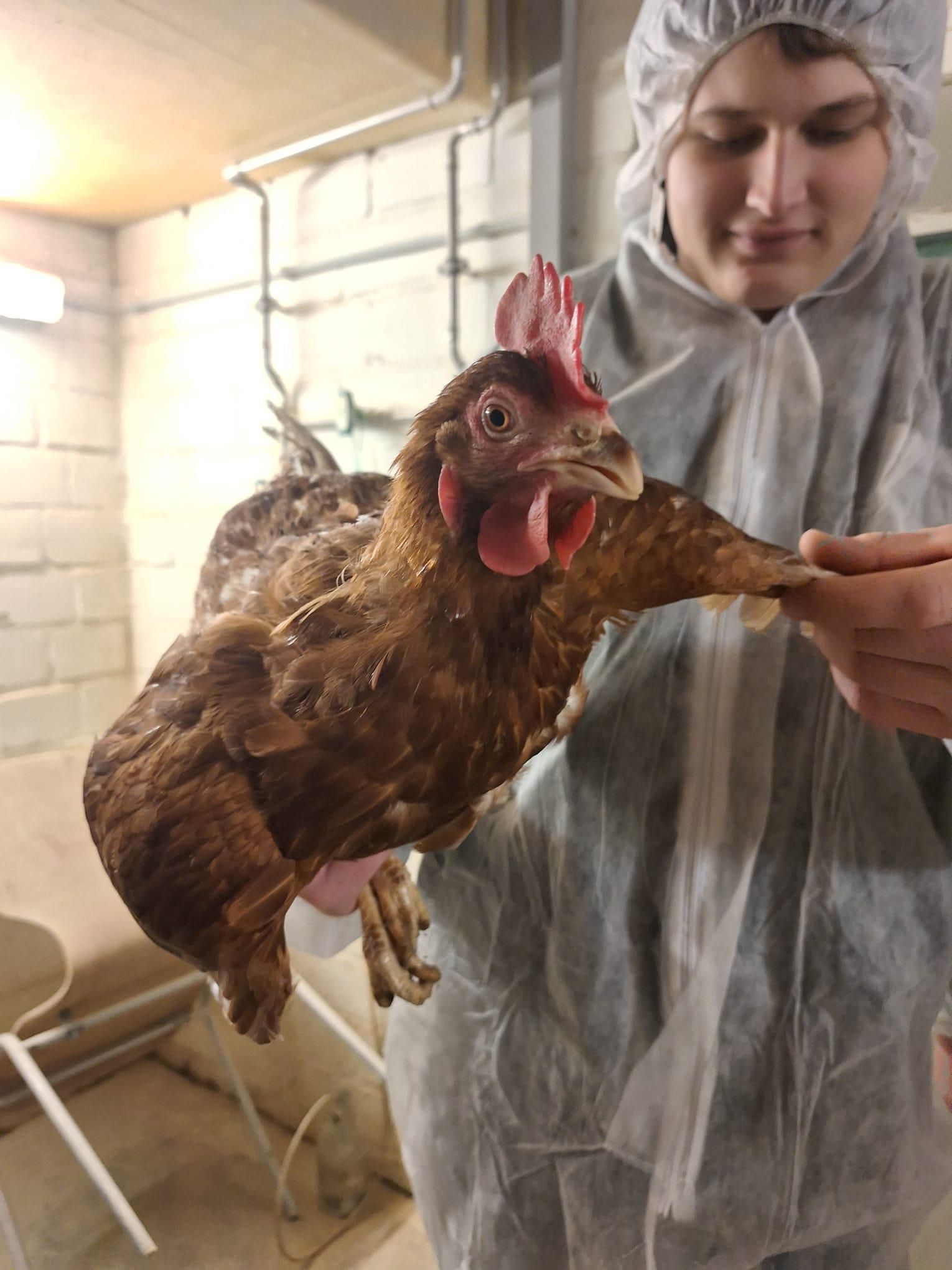 -Anschließend beurteilten wir mehrere Legehennen. Bei der Beurteilung wird darauf geachtet, dass keine Verletzungen an Augen, Kamm und Kehllappen sind. Der Kehllappen und der Kamm sollten gut durchblutet sein. Der Schnabel sollte nicht komplett abgenutzt sein aber auch nicht spitz. Danach wird das Federkleid kontrolliert, es sollte überall gut bedeckt sein. Am Bauch kontrolliert man den Brustknochen, der eben und ohne Verletzungen sein sollte. Eine gesunde Kloake ist ohne Ausfluss und Verletzungen. Die Füße, oder auch Ständer genannt, sollten keine Verletzungen aufweisen.